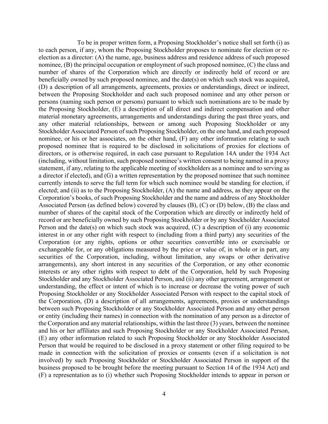 4 To be in proper written form, a Proposing Stockholder’s notice shall set forth (i) as to each person, if any, whom the Proposing Stockholder proposes to nominate for election or re- election as a director: (A) the name, age, business address and residence address of such proposed nominee, (B) the principal occupation or employment of such proposed nominee, (C) the class and number of shares of the Corporation which are directly or indirectly held of record or are beneficially owned by such proposed nominee, and the date(s) on which such stock was acquired, (D) a description of all arrangements, agreements, proxies or understandings, direct or indirect, between the Proposing Stockholder and each such proposed nominee and any other person or persons (naming such person or persons) pursuant to which such nominations are to be made by the Proposing Stockholder, (E) a description of all direct and indirect compensation and other material monetary agreements, arrangements and understandings during the past three years, and any other material relationships, between or among such Proposing Stockholder or any Stockholder Associated Person of such Proposing Stockholder, on the one hand, and each proposed nominee, or his or her associates, on the other hand, (F) any other information relating to such proposed nominee that is required to be disclosed in solicitations of proxies for elections of directors, or is otherwise required, in each case pursuant to Regulation 14A under the 1934 Act (including, without limitation, such proposed nominee’s written consent to being named in a proxy statement, if any, relating to the applicable meeting of stockholders as a nominee and to serving as a director if elected), and (G) a written representation by the proposed nominee that such nominee currently intends to serve the full term for which such nominee would be standing for election, if elected; and (ii) as to the Proposing Stockholder, (A) the name and address, as they appear on the Corporation’s books, of such Proposing Stockholder and the name and address of any Stockholder Associated Person (as defined below) covered by clauses (B), (C) or (D) below, (B) the class and number of shares of the capital stock of the Corporation which are directly or indirectly held of record or are beneficially owned by such Proposing Stockholder or by any Stockholder Associated Person and the date(s) on which such stock was acquired, (C) a description of (i) any economic interest in or any other right with respect to (including from a third party) any securities of the Corporation (or any rights, options or other securities convertible into or exercisable or exchangeable for, or any obligations measured by the price or value of, in whole or in part, any securities of the Corporation, including, without limitation, any swaps or other derivative arrangements), any short interest in any securities of the Corporation, or any other economic interests or any other rights with respect to debt of the Corporation, held by such Proposing Stockholder and any Stockholder Associated Person, and (ii) any other agreement, arrangement or understanding, the effect or intent of which is to increase or decrease the voting power of such Proposing Stockholder or any Stockholder Associated Person with respect to the capital stock of the Corporation, (D) a description of all arrangements, agreements, proxies or understandings between such Proposing Stockholder or any Stockholder Associated Person and any other person or entity (including their names) in connection with the nomination of any person as a director of the Corporation and any material relationships, within the last three (3) years, between the nominee and his or her affiliates and such Proposing Stockholder or any Stockholder Associated Person, (E) any other information related to such Proposing Stockholder or any Stockholder Associated Person that would be required to be disclosed in a proxy statement or other filing required to be made in connection with the solicitation of proxies or consents (even if a solicitation is not involved) by such Proposing Stockholder or Stockholder Associated Person in support of the business proposed to be brought before the meeting pursuant to Section 14 of the 1934 Act) and (F) a representation as to (i) whether such Proposing Stockholder intends to appear in person or