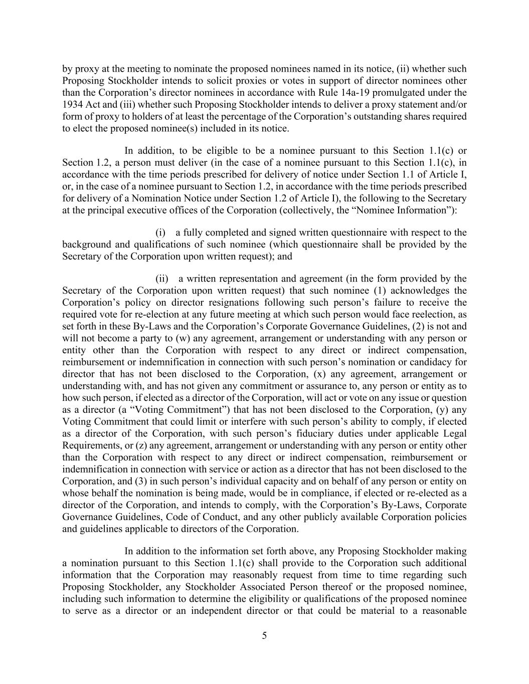 5 by proxy at the meeting to nominate the proposed nominees named in its notice, (ii) whether such Proposing Stockholder intends to solicit proxies or votes in support of director nominees other than the Corporation’s director nominees in accordance with Rule 14a-19 promulgated under the 1934 Act and (iii) whether such Proposing Stockholder intends to deliver a proxy statement and/or form of proxy to holders of at least the percentage of the Corporation’s outstanding shares required to elect the proposed nominee(s) included in its notice. In addition, to be eligible to be a nominee pursuant to this Section 1.1(c) or Section 1.2, a person must deliver (in the case of a nominee pursuant to this Section 1.1(c), in accordance with the time periods prescribed for delivery of notice under Section 1.1 of Article I, or, in the case of a nominee pursuant to Section 1.2, in accordance with the time periods prescribed for delivery of a Nomination Notice under Section 1.2 of Article I), the following to the Secretary at the principal executive offices of the Corporation (collectively, the “Nominee Information”): (i) a fully completed and signed written questionnaire with respect to the background and qualifications of such nominee (which questionnaire shall be provided by the Secretary of the Corporation upon written request); and (ii) a written representation and agreement (in the form provided by the Secretary of the Corporation upon written request) that such nominee (1) acknowledges the Corporation’s policy on director resignations following such person’s failure to receive the required vote for re-election at any future meeting at which such person would face reelection, as set forth in these By-Laws and the Corporation’s Corporate Governance Guidelines, (2) is not and will not become a party to (w) any agreement, arrangement or understanding with any person or entity other than the Corporation with respect to any direct or indirect compensation, reimbursement or indemnification in connection with such person’s nomination or candidacy for director that has not been disclosed to the Corporation, (x) any agreement, arrangement or understanding with, and has not given any commitment or assurance to, any person or entity as to how such person, if elected as a director of the Corporation, will act or vote on any issue or question as a director (a “Voting Commitment”) that has not been disclosed to the Corporation, (y) any Voting Commitment that could limit or interfere with such person’s ability to comply, if elected as a director of the Corporation, with such person’s fiduciary duties under applicable Legal Requirements, or (z) any agreement, arrangement or understanding with any person or entity other than the Corporation with respect to any direct or indirect compensation, reimbursement or indemnification in connection with service or action as a director that has not been disclosed to the Corporation, and (3) in such person’s individual capacity and on behalf of any person or entity on whose behalf the nomination is being made, would be in compliance, if elected or re-elected as a director of the Corporation, and intends to comply, with the Corporation’s By-Laws, Corporate Governance Guidelines, Code of Conduct, and any other publicly available Corporation policies and guidelines applicable to directors of the Corporation. In addition to the information set forth above, any Proposing Stockholder making a nomination pursuant to this Section 1.1(c) shall provide to the Corporation such additional information that the Corporation may reasonably request from time to time regarding such Proposing Stockholder, any Stockholder Associated Person thereof or the proposed nominee, including such information to determine the eligibility or qualifications of the proposed nominee to serve as a director or an independent director or that could be material to a reasonable