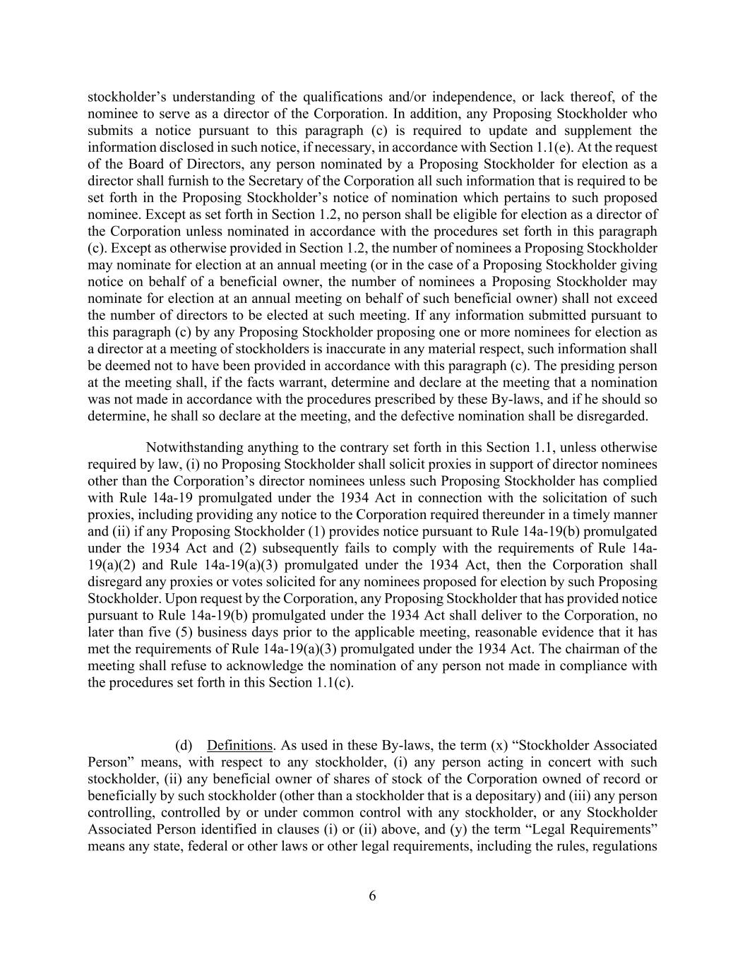 6 stockholder’s understanding of the qualifications and/or independence, or lack thereof, of the nominee to serve as a director of the Corporation. In addition, any Proposing Stockholder who submits a notice pursuant to this paragraph (c) is required to update and supplement the information disclosed in such notice, if necessary, in accordance with Section 1.1(e). At the request of the Board of Directors, any person nominated by a Proposing Stockholder for election as a director shall furnish to the Secretary of the Corporation all such information that is required to be set forth in the Proposing Stockholder’s notice of nomination which pertains to such proposed nominee. Except as set forth in Section 1.2, no person shall be eligible for election as a director of the Corporation unless nominated in accordance with the procedures set forth in this paragraph (c). Except as otherwise provided in Section 1.2, the number of nominees a Proposing Stockholder may nominate for election at an annual meeting (or in the case of a Proposing Stockholder giving notice on behalf of a beneficial owner, the number of nominees a Proposing Stockholder may nominate for election at an annual meeting on behalf of such beneficial owner) shall not exceed the number of directors to be elected at such meeting. If any information submitted pursuant to this paragraph (c) by any Proposing Stockholder proposing one or more nominees for election as a director at a meeting of stockholders is inaccurate in any material respect, such information shall be deemed not to have been provided in accordance with this paragraph (c). The presiding person at the meeting shall, if the facts warrant, determine and declare at the meeting that a nomination was not made in accordance with the procedures prescribed by these By-laws, and if he should so determine, he shall so declare at the meeting, and the defective nomination shall be disregarded. Notwithstanding anything to the contrary set forth in this Section 1.1, unless otherwise required by law, (i) no Proposing Stockholder shall solicit proxies in support of director nominees other than the Corporation’s director nominees unless such Proposing Stockholder has complied with Rule 14a-19 promulgated under the 1934 Act in connection with the solicitation of such proxies, including providing any notice to the Corporation required thereunder in a timely manner and (ii) if any Proposing Stockholder (1) provides notice pursuant to Rule 14a-19(b) promulgated under the 1934 Act and (2) subsequently fails to comply with the requirements of Rule 14a- 19(a)(2) and Rule 14a-19(a)(3) promulgated under the 1934 Act, then the Corporation shall disregard any proxies or votes solicited for any nominees proposed for election by such Proposing Stockholder. Upon request by the Corporation, any Proposing Stockholder that has provided notice pursuant to Rule 14a-19(b) promulgated under the 1934 Act shall deliver to the Corporation, no later than five (5) business days prior to the applicable meeting, reasonable evidence that it has met the requirements of Rule 14a-19(a)(3) promulgated under the 1934 Act. The chairman of the meeting shall refuse to acknowledge the nomination of any person not made in compliance with the procedures set forth in this Section 1.1(c). (d) Definitions. As used in these By-laws, the term (x) “Stockholder Associated Person” means, with respect to any stockholder, (i) any person acting in concert with such stockholder, (ii) any beneficial owner of shares of stock of the Corporation owned of record or beneficially by such stockholder (other than a stockholder that is a depositary) and (iii) any person controlling, controlled by or under common control with any stockholder, or any Stockholder Associated Person identified in clauses (i) or (ii) above, and (y) the term “Legal Requirements” means any state, federal or other laws or other legal requirements, including the rules, regulations