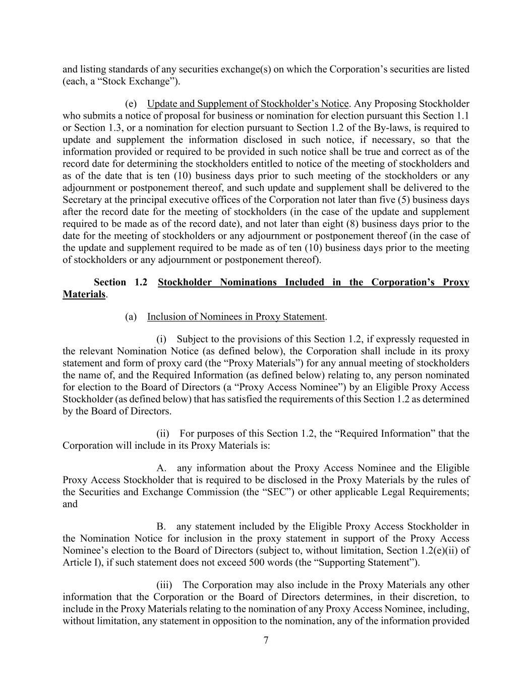 7 and listing standards of any securities exchange(s) on which the Corporation’s securities are listed (each, a “Stock Exchange”). (e) Update and Supplement of Stockholder’s Notice. Any Proposing Stockholder who submits a notice of proposal for business or nomination for election pursuant this Section 1.1 or Section 1.3, or a nomination for election pursuant to Section 1.2 of the By-laws, is required to update and supplement the information disclosed in such notice, if necessary, so that the information provided or required to be provided in such notice shall be true and correct as of the record date for determining the stockholders entitled to notice of the meeting of stockholders and as of the date that is ten (10) business days prior to such meeting of the stockholders or any adjournment or postponement thereof, and such update and supplement shall be delivered to the Secretary at the principal executive offices of the Corporation not later than five (5) business days after the record date for the meeting of stockholders (in the case of the update and supplement required to be made as of the record date), and not later than eight (8) business days prior to the date for the meeting of stockholders or any adjournment or postponement thereof (in the case of the update and supplement required to be made as of ten (10) business days prior to the meeting of stockholders or any adjournment or postponement thereof). Section 1.2 Stockholder Nominations Included in the Corporation’s Proxy Materials. (a) Inclusion of Nominees in Proxy Statement. (i) Subject to the provisions of this Section 1.2, if expressly requested in the relevant Nomination Notice (as defined below), the Corporation shall include in its proxy statement and form of proxy card (the “Proxy Materials”) for any annual meeting of stockholders the name of, and the Required Information (as defined below) relating to, any person nominated for election to the Board of Directors (a “Proxy Access Nominee”) by an Eligible Proxy Access Stockholder (as defined below) that has satisfied the requirements of this Section 1.2 as determined by the Board of Directors. (ii) For purposes of this Section 1.2, the “Required Information” that the Corporation will include in its Proxy Materials is: A. any information about the Proxy Access Nominee and the Eligible Proxy Access Stockholder that is required to be disclosed in the Proxy Materials by the rules of the Securities and Exchange Commission (the “SEC”) or other applicable Legal Requirements; and B. any statement included by the Eligible Proxy Access Stockholder in the Nomination Notice for inclusion in the proxy statement in support of the Proxy Access Nominee’s election to the Board of Directors (subject to, without limitation, Section 1.2(e)(ii) of Article I), if such statement does not exceed 500 words (the “Supporting Statement”). (iii) The Corporation may also include in the Proxy Materials any other information that the Corporation or the Board of Directors determines, in their discretion, to include in the Proxy Materials relating to the nomination of any Proxy Access Nominee, including, without limitation, any statement in opposition to the nomination, any of the information provided