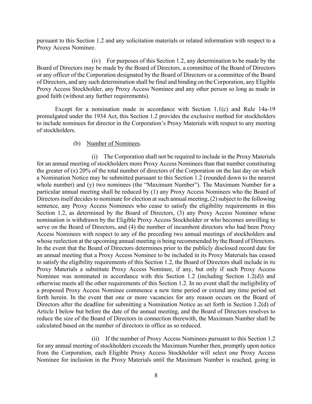 8 pursuant to this Section 1.2 and any solicitation materials or related information with respect to a Proxy Access Nominee. (iv) For purposes of this Section 1.2, any determination to be made by the Board of Directors may be made by the Board of Directors, a committee of the Board of Directors or any officer of the Corporation designated by the Board of Directors or a committee of the Board of Directors, and any such determination shall be final and binding on the Corporation, any Eligible Proxy Access Stockholder, any Proxy Access Nominee and any other person so long as made in good faith (without any further requirements). Except for a nomination made in accordance with Section 1.1(c) and Rule 14a-19 promulgated under the 1934 Act, this Section 1.2 provides the exclusive method for stockholders to include nominees for director in the Corporation’s Proxy Materials with respect to any meeting of stockholders. (b) Number of Nominees. (i) The Corporation shall not be required to include in the Proxy Materials for an annual meeting of stockholders more Proxy Access Nominees than that number constituting the greater of (x) 20% of the total number of directors of the Corporation on the last day on which a Nomination Notice may be submitted pursuant to this Section 1.2 (rounded down to the nearest whole number) and (y) two nominees (the “Maximum Number”). The Maximum Number for a particular annual meeting shall be reduced by (1) any Proxy Access Nominees who the Board of Directors itself decides to nominate for election at such annual meeting, (2) subject to the following sentence, any Proxy Access Nominees who cease to satisfy the eligibility requirements in this Section 1.2, as determined by the Board of Directors, (3) any Proxy Access Nominee whose nomination is withdrawn by the Eligible Proxy Access Stockholder or who becomes unwilling to serve on the Board of Directors, and (4) the number of incumbent directors who had been Proxy Access Nominees with respect to any of the preceding two annual meetings of stockholders and whose reelection at the upcoming annual meeting is being recommended by the Board of Directors. In the event that the Board of Directors determines prior to the publicly disclosed record date for an annual meeting that a Proxy Access Nominee to be included in its Proxy Materials has ceased to satisfy the eligibility requirements of this Section 1.2, the Board of Directors shall include in its Proxy Materials a substitute Proxy Access Nominee, if any, but only if such Proxy Access Nominee was nominated in accordance with this Section 1.2 (including Section 1.2(d)) and otherwise meets all the other requirements of this Section 1.2. In no event shall the ineligibility of a proposed Proxy Access Nominee commence a new time period or extend any time period set forth herein. In the event that one or more vacancies for any reason occurs on the Board of Directors after the deadline for submitting a Nomination Notice as set forth in Section 1.2(d) of Article I below but before the date of the annual meeting, and the Board of Directors resolves to reduce the size of the Board of Directors in connection therewith, the Maximum Number shall be calculated based on the number of directors in office as so reduced. (ii) If the number of Proxy Access Nominees pursuant to this Section 1.2 for any annual meeting of stockholders exceeds the Maximum Number then, promptly upon notice from the Corporation, each Eligible Proxy Access Stockholder will select one Proxy Access Nominee for inclusion in the Proxy Materials until the Maximum Number is reached, going in