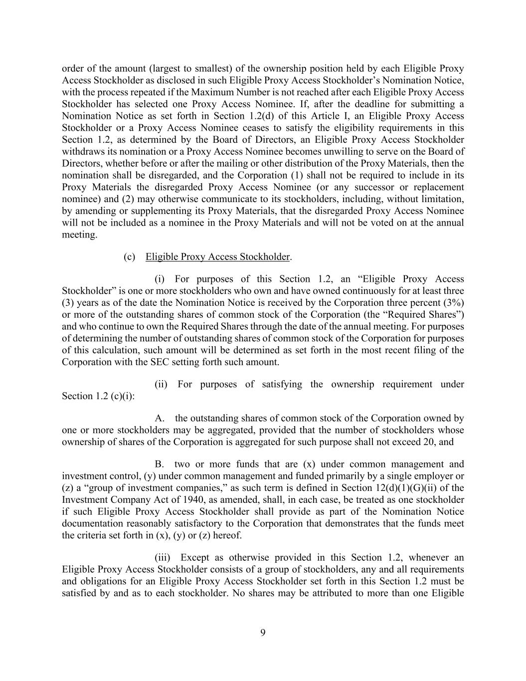 9 order of the amount (largest to smallest) of the ownership position held by each Eligible Proxy Access Stockholder as disclosed in such Eligible Proxy Access Stockholder’s Nomination Notice, with the process repeated if the Maximum Number is not reached after each Eligible Proxy Access Stockholder has selected one Proxy Access Nominee. If, after the deadline for submitting a Nomination Notice as set forth in Section 1.2(d) of this Article I, an Eligible Proxy Access Stockholder or a Proxy Access Nominee ceases to satisfy the eligibility requirements in this Section 1.2, as determined by the Board of Directors, an Eligible Proxy Access Stockholder withdraws its nomination or a Proxy Access Nominee becomes unwilling to serve on the Board of Directors, whether before or after the mailing or other distribution of the Proxy Materials, then the nomination shall be disregarded, and the Corporation (1) shall not be required to include in its Proxy Materials the disregarded Proxy Access Nominee (or any successor or replacement nominee) and (2) may otherwise communicate to its stockholders, including, without limitation, by amending or supplementing its Proxy Materials, that the disregarded Proxy Access Nominee will not be included as a nominee in the Proxy Materials and will not be voted on at the annual meeting. (c) Eligible Proxy Access Stockholder. (i) For purposes of this Section 1.2, an “Eligible Proxy Access Stockholder” is one or more stockholders who own and have owned continuously for at least three (3) years as of the date the Nomination Notice is received by the Corporation three percent (3%) or more of the outstanding shares of common stock of the Corporation (the “Required Shares”) and who continue to own the Required Shares through the date of the annual meeting. For purposes of determining the number of outstanding shares of common stock of the Corporation for purposes of this calculation, such amount will be determined as set forth in the most recent filing of the Corporation with the SEC setting forth such amount. (ii) For purposes of satisfying the ownership requirement under Section 1.2 (c)(i): A. the outstanding shares of common stock of the Corporation owned by one or more stockholders may be aggregated, provided that the number of stockholders whose ownership of shares of the Corporation is aggregated for such purpose shall not exceed 20, and B. two or more funds that are (x) under common management and investment control, (y) under common management and funded primarily by a single employer or (z) a “group of investment companies,” as such term is defined in Section 12(d)(1)(G)(ii) of the Investment Company Act of 1940, as amended, shall, in each case, be treated as one stockholder if such Eligible Proxy Access Stockholder shall provide as part of the Nomination Notice documentation reasonably satisfactory to the Corporation that demonstrates that the funds meet the criteria set forth in (x), (y) or (z) hereof. (iii) Except as otherwise provided in this Section 1.2, whenever an Eligible Proxy Access Stockholder consists of a group of stockholders, any and all requirements and obligations for an Eligible Proxy Access Stockholder set forth in this Section 1.2 must be satisfied by and as to each stockholder. No shares may be attributed to more than one Eligible