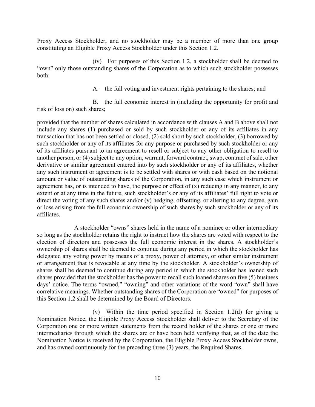 10 Proxy Access Stockholder, and no stockholder may be a member of more than one group constituting an Eligible Proxy Access Stockholder under this Section 1.2. (iv) For purposes of this Section 1.2, a stockholder shall be deemed to “own” only those outstanding shares of the Corporation as to which such stockholder possesses both: A. the full voting and investment rights pertaining to the shares; and B. the full economic interest in (including the opportunity for profit and risk of loss on) such shares; provided that the number of shares calculated in accordance with clauses A and B above shall not include any shares (1) purchased or sold by such stockholder or any of its affiliates in any transaction that has not been settled or closed, (2) sold short by such stockholder, (3) borrowed by such stockholder or any of its affiliates for any purpose or purchased by such stockholder or any of its affiliates pursuant to an agreement to resell or subject to any other obligation to resell to another person, or (4) subject to any option, warrant, forward contract, swap, contract of sale, other derivative or similar agreement entered into by such stockholder or any of its affiliates, whether any such instrument or agreement is to be settled with shares or with cash based on the notional amount or value of outstanding shares of the Corporation, in any such case which instrument or agreement has, or is intended to have, the purpose or effect of (x) reducing in any manner, to any extent or at any time in the future, such stockholder’s or any of its affiliates’ full right to vote or direct the voting of any such shares and/or (y) hedging, offsetting, or altering to any degree, gain or loss arising from the full economic ownership of such shares by such stockholder or any of its affiliates. A stockholder “owns” shares held in the name of a nominee or other intermediary so long as the stockholder retains the right to instruct how the shares are voted with respect to the election of directors and possesses the full economic interest in the shares. A stockholder’s ownership of shares shall be deemed to continue during any period in which the stockholder has delegated any voting power by means of a proxy, power of attorney, or other similar instrument or arrangement that is revocable at any time by the stockholder. A stockholder’s ownership of shares shall be deemed to continue during any period in which the stockholder has loaned such shares provided that the stockholder has the power to recall such loaned shares on five (5) business days’ notice. The terms “owned,” “owning” and other variations of the word “own” shall have correlative meanings. Whether outstanding shares of the Corporation are “owned” for purposes of this Section 1.2 shall be determined by the Board of Directors. (v) Within the time period specified in Section 1.2(d) for giving a Nomination Notice, the Eligible Proxy Access Stockholder shall deliver to the Secretary of the Corporation one or more written statements from the record holder of the shares or one or more intermediaries through which the shares are or have been held verifying that, as of the date the Nomination Notice is received by the Corporation, the Eligible Proxy Access Stockholder owns, and has owned continuously for the preceding three (3) years, the Required Shares.