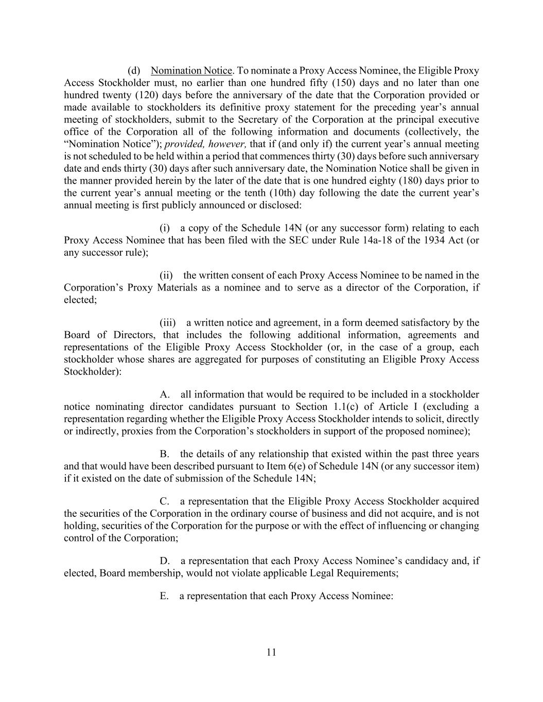 11 (d) Nomination Notice. To nominate a Proxy Access Nominee, the Eligible Proxy Access Stockholder must, no earlier than one hundred fifty (150) days and no later than one hundred twenty (120) days before the anniversary of the date that the Corporation provided or made available to stockholders its definitive proxy statement for the preceding year’s annual meeting of stockholders, submit to the Secretary of the Corporation at the principal executive office of the Corporation all of the following information and documents (collectively, the “Nomination Notice”); provided, however, that if (and only if) the current year’s annual meeting is not scheduled to be held within a period that commences thirty (30) days before such anniversary date and ends thirty (30) days after such anniversary date, the Nomination Notice shall be given in the manner provided herein by the later of the date that is one hundred eighty (180) days prior to the current year’s annual meeting or the tenth (10th) day following the date the current year’s annual meeting is first publicly announced or disclosed: (i) a copy of the Schedule 14N (or any successor form) relating to each Proxy Access Nominee that has been filed with the SEC under Rule 14a-18 of the 1934 Act (or any successor rule); (ii) the written consent of each Proxy Access Nominee to be named in the Corporation’s Proxy Materials as a nominee and to serve as a director of the Corporation, if elected; (iii) a written notice and agreement, in a form deemed satisfactory by the Board of Directors, that includes the following additional information, agreements and representations of the Eligible Proxy Access Stockholder (or, in the case of a group, each stockholder whose shares are aggregated for purposes of constituting an Eligible Proxy Access Stockholder): A. all information that would be required to be included in a stockholder notice nominating director candidates pursuant to Section 1.1(c) of Article I (excluding a representation regarding whether the Eligible Proxy Access Stockholder intends to solicit, directly or indirectly, proxies from the Corporation’s stockholders in support of the proposed nominee); B. the details of any relationship that existed within the past three years and that would have been described pursuant to Item 6(e) of Schedule 14N (or any successor item) if it existed on the date of submission of the Schedule 14N; C. a representation that the Eligible Proxy Access Stockholder acquired the securities of the Corporation in the ordinary course of business and did not acquire, and is not holding, securities of the Corporation for the purpose or with the effect of influencing or changing control of the Corporation; D. a representation that each Proxy Access Nominee’s candidacy and, if elected, Board membership, would not violate applicable Legal Requirements; E. a representation that each Proxy Access Nominee: