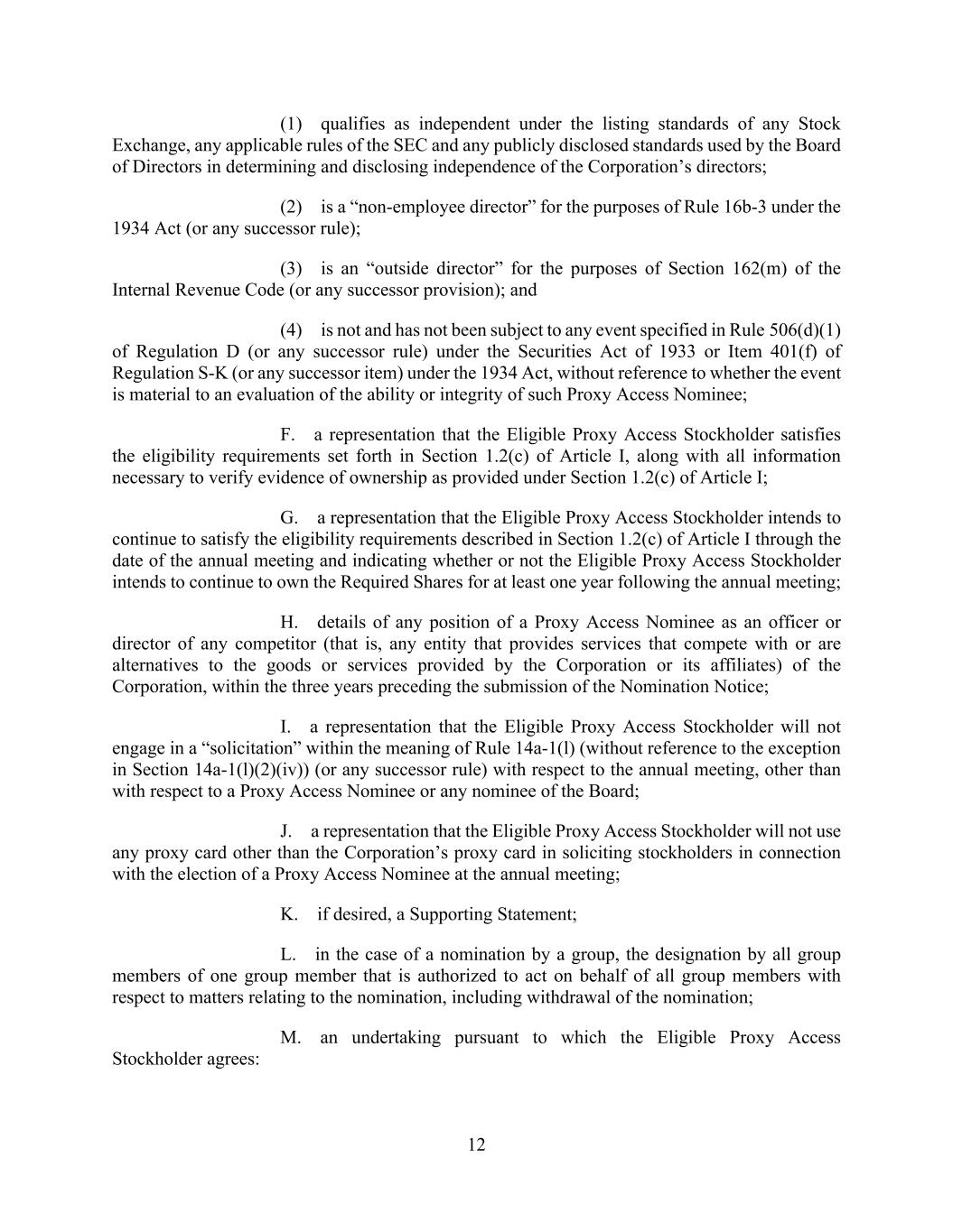 12 (1) qualifies as independent under the listing standards of any Stock Exchange, any applicable rules of the SEC and any publicly disclosed standards used by the Board of Directors in determining and disclosing independence of the Corporation’s directors; (2) is a “non-employee director” for the purposes of Rule 16b-3 under the 1934 Act (or any successor rule); (3) is an “outside director” for the purposes of Section 162(m) of the Internal Revenue Code (or any successor provision); and (4) is not and has not been subject to any event specified in Rule 506(d)(1) of Regulation D (or any successor rule) under the Securities Act of 1933 or Item 401(f) of Regulation S-K (or any successor item) under the 1934 Act, without reference to whether the event is material to an evaluation of the ability or integrity of such Proxy Access Nominee; F. a representation that the Eligible Proxy Access Stockholder satisfies the eligibility requirements set forth in Section 1.2(c) of Article I, along with all information necessary to verify evidence of ownership as provided under Section 1.2(c) of Article I; G. a representation that the Eligible Proxy Access Stockholder intends to continue to satisfy the eligibility requirements described in Section 1.2(c) of Article I through the date of the annual meeting and indicating whether or not the Eligible Proxy Access Stockholder intends to continue to own the Required Shares for at least one year following the annual meeting; H. details of any position of a Proxy Access Nominee as an officer or director of any competitor (that is, any entity that provides services that compete with or are alternatives to the goods or services provided by the Corporation or its affiliates) of the Corporation, within the three years preceding the submission of the Nomination Notice; I. a representation that the Eligible Proxy Access Stockholder will not engage in a “solicitation” within the meaning of Rule 14a-1(l) (without reference to the exception in Section 14a-1(l)(2)(iv)) (or any successor rule) with respect to the annual meeting, other than with respect to a Proxy Access Nominee or any nominee of the Board; J. a representation that the Eligible Proxy Access Stockholder will not use any proxy card other than the Corporation’s proxy card in soliciting stockholders in connection with the election of a Proxy Access Nominee at the annual meeting; K. if desired, a Supporting Statement; L. in the case of a nomination by a group, the designation by all group members of one group member that is authorized to act on behalf of all group members with respect to matters relating to the nomination, including withdrawal of the nomination; M. an undertaking pursuant to which the Eligible Proxy Access Stockholder agrees: