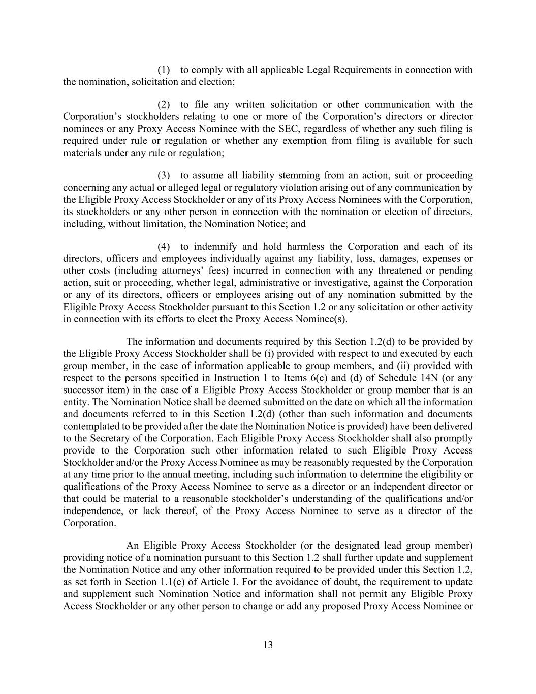 13 (1) to comply with all applicable Legal Requirements in connection with the nomination, solicitation and election; (2) to file any written solicitation or other communication with the Corporation’s stockholders relating to one or more of the Corporation’s directors or director nominees or any Proxy Access Nominee with the SEC, regardless of whether any such filing is required under rule or regulation or whether any exemption from filing is available for such materials under any rule or regulation; (3) to assume all liability stemming from an action, suit or proceeding concerning any actual or alleged legal or regulatory violation arising out of any communication by the Eligible Proxy Access Stockholder or any of its Proxy Access Nominees with the Corporation, its stockholders or any other person in connection with the nomination or election of directors, including, without limitation, the Nomination Notice; and (4) to indemnify and hold harmless the Corporation and each of its directors, officers and employees individually against any liability, loss, damages, expenses or other costs (including attorneys’ fees) incurred in connection with any threatened or pending action, suit or proceeding, whether legal, administrative or investigative, against the Corporation or any of its directors, officers or employees arising out of any nomination submitted by the Eligible Proxy Access Stockholder pursuant to this Section 1.2 or any solicitation or other activity in connection with its efforts to elect the Proxy Access Nominee(s). The information and documents required by this Section 1.2(d) to be provided by the Eligible Proxy Access Stockholder shall be (i) provided with respect to and executed by each group member, in the case of information applicable to group members, and (ii) provided with respect to the persons specified in Instruction 1 to Items 6(c) and (d) of Schedule 14N (or any successor item) in the case of a Eligible Proxy Access Stockholder or group member that is an entity. The Nomination Notice shall be deemed submitted on the date on which all the information and documents referred to in this Section 1.2(d) (other than such information and documents contemplated to be provided after the date the Nomination Notice is provided) have been delivered to the Secretary of the Corporation. Each Eligible Proxy Access Stockholder shall also promptly provide to the Corporation such other information related to such Eligible Proxy Access Stockholder and/or the Proxy Access Nominee as may be reasonably requested by the Corporation at any time prior to the annual meeting, including such information to determine the eligibility or qualifications of the Proxy Access Nominee to serve as a director or an independent director or that could be material to a reasonable stockholder’s understanding of the qualifications and/or independence, or lack thereof, of the Proxy Access Nominee to serve as a director of the Corporation. An Eligible Proxy Access Stockholder (or the designated lead group member) providing notice of a nomination pursuant to this Section 1.2 shall further update and supplement the Nomination Notice and any other information required to be provided under this Section 1.2, as set forth in Section 1.1(e) of Article I. For the avoidance of doubt, the requirement to update and supplement such Nomination Notice and information shall not permit any Eligible Proxy Access Stockholder or any other person to change or add any proposed Proxy Access Nominee or