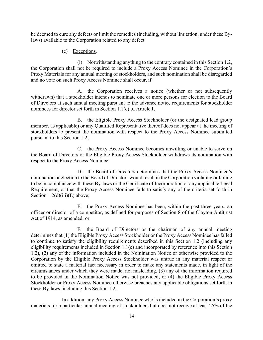 14 be deemed to cure any defects or limit the remedies (including, without limitation, under these By- laws) available to the Corporation related to any defect. (e) Exceptions. (i) Notwithstanding anything to the contrary contained in this Section 1.2, the Corporation shall not be required to include a Proxy Access Nominee in the Corporation’s Proxy Materials for any annual meeting of stockholders, and such nomination shall be disregarded and no vote on such Proxy Access Nominee shall occur, if: A. the Corporation receives a notice (whether or not subsequently withdrawn) that a stockholder intends to nominate one or more persons for election to the Board of Directors at such annual meeting pursuant to the advance notice requirements for stockholder nominees for director set forth in Section 1.1(c) of Article I; B. the Eligible Proxy Access Stockholder (or the designated lead group member, as applicable) or any Qualified Representative thereof does not appear at the meeting of stockholders to present the nomination with respect to the Proxy Access Nominee submitted pursuant to this Section 1.2; C. the Proxy Access Nominee becomes unwilling or unable to serve on the Board of Directors or the Eligible Proxy Access Stockholder withdraws its nomination with respect to the Proxy Access Nominee; D. the Board of Directors determines that the Proxy Access Nominee’s nomination or election to the Board of Directors would result in the Corporation violating or failing to be in compliance with these By-laws or the Certificate of Incorporation or any applicable Legal Requirement, or that the Proxy Access Nominee fails to satisfy any of the criteria set forth in Section 1.2(d)(iii)(E) above; E. the Proxy Access Nominee has been, within the past three years, an officer or director of a competitor, as defined for purposes of Section 8 of the Clayton Antitrust Act of 1914, as amended; or F. the Board of Directors or the chairman of any annual meeting determines that (1) the Eligible Proxy Access Stockholder or the Proxy Access Nominee has failed to continue to satisfy the eligibility requirements described in this Section 1.2 (including any eligibility requirements included in Section 1.1(c) and incorporated by reference into this Section 1.2), (2) any of the information included in the Nomination Notice or otherwise provided to the Corporation by the Eligible Proxy Access Stockholder was untrue in any material respect or omitted to state a material fact necessary in order to make any statements made, in light of the circumstances under which they were made, not misleading, (3) any of the information required to be provided in the Nomination Notice was not provided, or (4) the Eligible Proxy Access Stockholder or Proxy Access Nominee otherwise breaches any applicable obligations set forth in these By-laws, including this Section 1.2. In addition, any Proxy Access Nominee who is included in the Corporation’s proxy materials for a particular annual meeting of stockholders but does not receive at least 25% of the