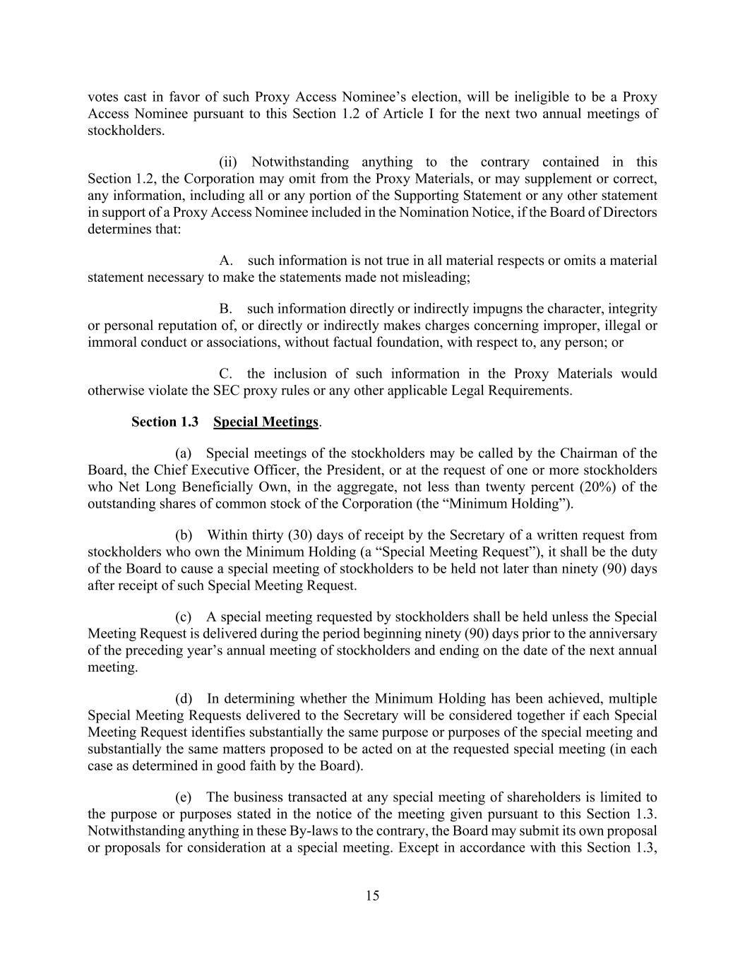 15 votes cast in favor of such Proxy Access Nominee’s election, will be ineligible to be a Proxy Access Nominee pursuant to this Section 1.2 of Article I for the next two annual meetings of stockholders. (ii) Notwithstanding anything to the contrary contained in this Section 1.2, the Corporation may omit from the Proxy Materials, or may supplement or correct, any information, including all or any portion of the Supporting Statement or any other statement in support of a Proxy Access Nominee included in the Nomination Notice, if the Board of Directors determines that: A. such information is not true in all material respects or omits a material statement necessary to make the statements made not misleading; B. such information directly or indirectly impugns the character, integrity or personal reputation of, or directly or indirectly makes charges concerning improper, illegal or immoral conduct or associations, without factual foundation, with respect to, any person; or C. the inclusion of such information in the Proxy Materials would otherwise violate the SEC proxy rules or any other applicable Legal Requirements. Section 1.3 Special Meetings. (a) Special meetings of the stockholders may be called by the Chairman of the Board, the Chief Executive Officer, the President, or at the request of one or more stockholders who Net Long Beneficially Own, in the aggregate, not less than twenty percent (20%) of the outstanding shares of common stock of the Corporation (the “Minimum Holding”). (b) Within thirty (30) days of receipt by the Secretary of a written request from stockholders who own the Minimum Holding (a “Special Meeting Request”), it shall be the duty of the Board to cause a special meeting of stockholders to be held not later than ninety (90) days after receipt of such Special Meeting Request. (c) A special meeting requested by stockholders shall be held unless the Special Meeting Request is delivered during the period beginning ninety (90) days prior to the anniversary of the preceding year’s annual meeting of stockholders and ending on the date of the next annual meeting. (d) In determining whether the Minimum Holding has been achieved, multiple Special Meeting Requests delivered to the Secretary will be considered together if each Special Meeting Request identifies substantially the same purpose or purposes of the special meeting and substantially the same matters proposed to be acted on at the requested special meeting (in each case as determined in good faith by the Board). (e) The business transacted at any special meeting of shareholders is limited to the purpose or purposes stated in the notice of the meeting given pursuant to this Section 1.3. Notwithstanding anything in these By-laws to the contrary, the Board may submit its own proposal or proposals for consideration at a special meeting. Except in accordance with this Section 1.3,