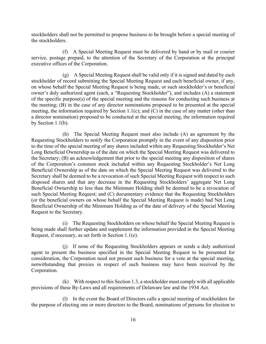 16 stockholders shall not be permitted to propose business to be brought before a special meeting of the stockholders. (f) A Special Meeting Request must be delivered by hand or by mail or courier service, postage prepaid, to the attention of the Secretary of the Corporation at the principal executive offices of the Corporation. (g) A Special Meeting Request shall be valid only if it is signed and dated by each stockholder of record submitting the Special Meeting Request and each beneficial owner, if any, on whose behalf the Special Meeting Request is being made, or such stockholder’s or beneficial owner’s duly authorized agent (each, a “Requesting Stockholder”), and includes (A) a statement of the specific purpose(s) of the special meeting and the reasons for conducting such business at the meeting; (B) in the case of any director nominations proposed to be presented at the special meeting, the information required by Section 1.1(c); and (C) in the case of any matter (other than a director nomination) proposed to be conducted at the special meeting, the information required by Section 1.1(b). (h) The Special Meeting Request must also include (A) an agreement by the Requesting Stockholders to notify the Corporation promptly in the event of any disposition prior to the time of the special meeting of any shares included within any Requesting Stockholder’s Net Long Beneficial Ownership as of the date on which the Special Meeting Request was delivered to the Secretary; (B) an acknowledgement that prior to the special meeting any disposition of shares of the Corporation’s common stock included within any Requesting Stockholder’s Net Long Beneficial Ownership as of the date on which the Special Meeting Request was delivered to the Secretary shall be deemed to be a revocation of such Special Meeting Request with respect to such disposed shares and that any decrease in the Requesting Stockholders’ aggregate Net Long Beneficial Ownership to less than the Minimum Holding shall be deemed to be a revocation of such Special Meeting Request; and (C) documentary evidence that the Requesting Stockholders (or the beneficial owners on whose behalf the Special Meeting Request is made) had Net Long Beneficial Ownership of the Minimum Holding as of the date of delivery of the Special Meeting Request to the Secretary. (i) The Requesting Stockholders on whose behalf the Special Meeting Request is being made shall further update and supplement the information provided in the Special Meeting Request, if necessary, as set forth in Section 1.1(e). (j) If none of the Requesting Stockholders appears or sends a duly authorized agent to present the business specified in the Special Meeting Request to be presented for consideration, the Corporation need not present such business for a vote at the special meeting, notwithstanding that proxies in respect of such business may have been received by the Corporation. (k) With respect to this Section 1.3, a stockholder must comply with all applicable provisions of these By-Laws and all requirements of Delaware law and the 1934 Act. (l) In the event the Board of Directors calls a special meeting of stockholders for the purpose of electing one or more directors to the Board, nominations of persons for election to