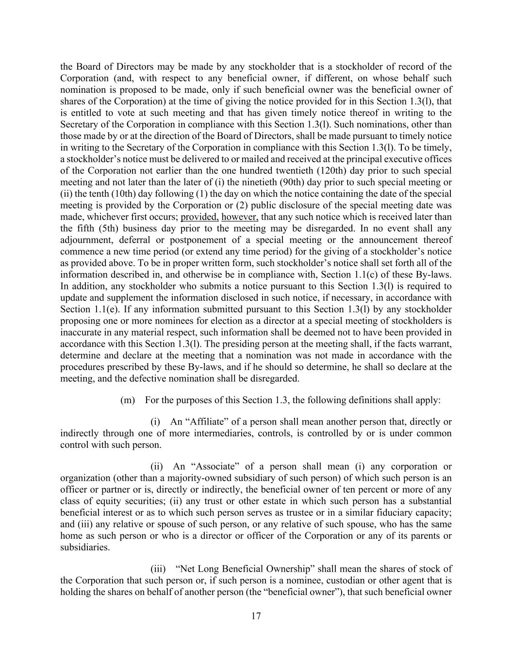 17 the Board of Directors may be made by any stockholder that is a stockholder of record of the Corporation (and, with respect to any beneficial owner, if different, on whose behalf such nomination is proposed to be made, only if such beneficial owner was the beneficial owner of shares of the Corporation) at the time of giving the notice provided for in this Section 1.3(l), that is entitled to vote at such meeting and that has given timely notice thereof in writing to the Secretary of the Corporation in compliance with this Section 1.3(l). Such nominations, other than those made by or at the direction of the Board of Directors, shall be made pursuant to timely notice in writing to the Secretary of the Corporation in compliance with this Section 1.3(l). To be timely, a stockholder’s notice must be delivered to or mailed and received at the principal executive offices of the Corporation not earlier than the one hundred twentieth (120th) day prior to such special meeting and not later than the later of (i) the ninetieth (90th) day prior to such special meeting or (ii) the tenth (10th) day following (1) the day on which the notice containing the date of the special meeting is provided by the Corporation or (2) public disclosure of the special meeting date was made, whichever first occurs; provided, however, that any such notice which is received later than the fifth (5th) business day prior to the meeting may be disregarded. In no event shall any adjournment, deferral or postponement of a special meeting or the announcement thereof commence a new time period (or extend any time period) for the giving of a stockholder’s notice as provided above. To be in proper written form, such stockholder’s notice shall set forth all of the information described in, and otherwise be in compliance with, Section 1.1(c) of these By-laws. In addition, any stockholder who submits a notice pursuant to this Section 1.3(l) is required to update and supplement the information disclosed in such notice, if necessary, in accordance with Section 1.1(e). If any information submitted pursuant to this Section 1.3(l) by any stockholder proposing one or more nominees for election as a director at a special meeting of stockholders is inaccurate in any material respect, such information shall be deemed not to have been provided in accordance with this Section 1.3(l). The presiding person at the meeting shall, if the facts warrant, determine and declare at the meeting that a nomination was not made in accordance with the procedures prescribed by these By-laws, and if he should so determine, he shall so declare at the meeting, and the defective nomination shall be disregarded. (m) For the purposes of this Section 1.3, the following definitions shall apply: (i) An “Affiliate” of a person shall mean another person that, directly or indirectly through one of more intermediaries, controls, is controlled by or is under common control with such person. (ii) An “Associate” of a person shall mean (i) any corporation or organization (other than a majority-owned subsidiary of such person) of which such person is an officer or partner or is, directly or indirectly, the beneficial owner of ten percent or more of any class of equity securities; (ii) any trust or other estate in which such person has a substantial beneficial interest or as to which such person serves as trustee or in a similar fiduciary capacity; and (iii) any relative or spouse of such person, or any relative of such spouse, who has the same home as such person or who is a director or officer of the Corporation or any of its parents or subsidiaries. (iii) “Net Long Beneficial Ownership” shall mean the shares of stock of the Corporation that such person or, if such person is a nominee, custodian or other agent that is holding the shares on behalf of another person (the “beneficial owner”), that such beneficial owner