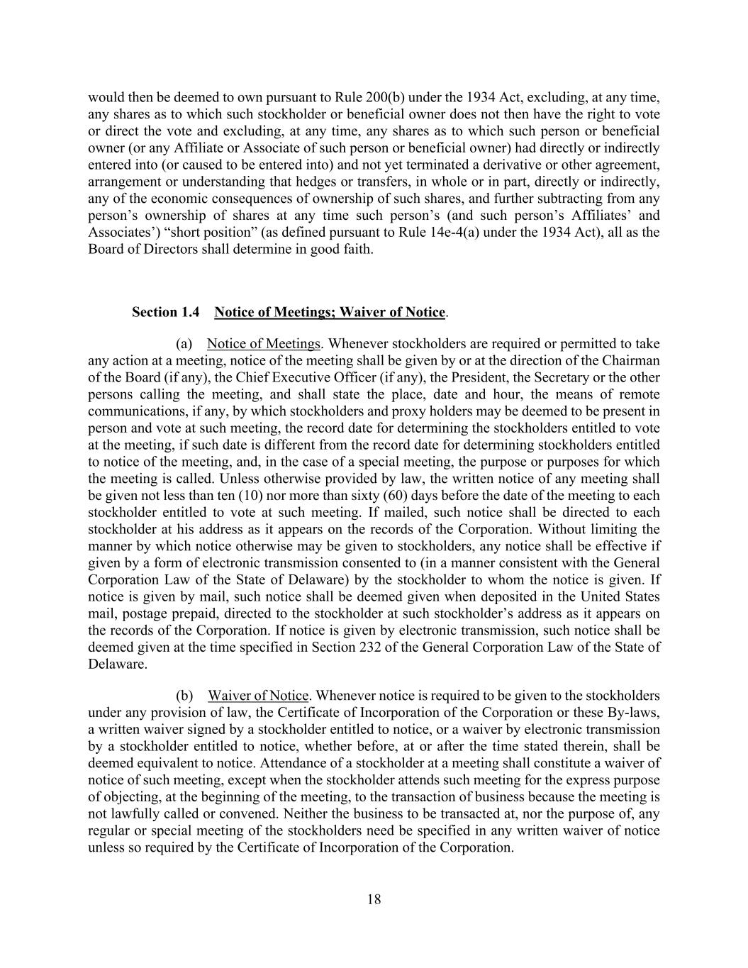 18 would then be deemed to own pursuant to Rule 200(b) under the 1934 Act, excluding, at any time, any shares as to which such stockholder or beneficial owner does not then have the right to vote or direct the vote and excluding, at any time, any shares as to which such person or beneficial owner (or any Affiliate or Associate of such person or beneficial owner) had directly or indirectly entered into (or caused to be entered into) and not yet terminated a derivative or other agreement, arrangement or understanding that hedges or transfers, in whole or in part, directly or indirectly, any of the economic consequences of ownership of such shares, and further subtracting from any person’s ownership of shares at any time such person’s (and such person’s Affiliates’ and Associates’) “short position” (as defined pursuant to Rule 14e-4(a) under the 1934 Act), all as the Board of Directors shall determine in good faith. Section 1.4 Notice of Meetings; Waiver of Notice. (a) Notice of Meetings. Whenever stockholders are required or permitted to take any action at a meeting, notice of the meeting shall be given by or at the direction of the Chairman of the Board (if any), the Chief Executive Officer (if any), the President, the Secretary or the other persons calling the meeting, and shall state the place, date and hour, the means of remote communications, if any, by which stockholders and proxy holders may be deemed to be present in person and vote at such meeting, the record date for determining the stockholders entitled to vote at the meeting, if such date is different from the record date for determining stockholders entitled to notice of the meeting, and, in the case of a special meeting, the purpose or purposes for which the meeting is called. Unless otherwise provided by law, the written notice of any meeting shall be given not less than ten (10) nor more than sixty (60) days before the date of the meeting to each stockholder entitled to vote at such meeting. If mailed, such notice shall be directed to each stockholder at his address as it appears on the records of the Corporation. Without limiting the manner by which notice otherwise may be given to stockholders, any notice shall be effective if given by a form of electronic transmission consented to (in a manner consistent with the General Corporation Law of the State of Delaware) by the stockholder to whom the notice is given. If notice is given by mail, such notice shall be deemed given when deposited in the United States mail, postage prepaid, directed to the stockholder at such stockholder’s address as it appears on the records of the Corporation. If notice is given by electronic transmission, such notice shall be deemed given at the time specified in Section 232 of the General Corporation Law of the State of Delaware. (b) Waiver of Notice. Whenever notice is required to be given to the stockholders under any provision of law, the Certificate of Incorporation of the Corporation or these By-laws, a written waiver signed by a stockholder entitled to notice, or a waiver by electronic transmission by a stockholder entitled to notice, whether before, at or after the time stated therein, shall be deemed equivalent to notice. Attendance of a stockholder at a meeting shall constitute a waiver of notice of such meeting, except when the stockholder attends such meeting for the express purpose of objecting, at the beginning of the meeting, to the transaction of business because the meeting is not lawfully called or convened. Neither the business to be transacted at, nor the purpose of, any regular or special meeting of the stockholders need be specified in any written waiver of notice unless so required by the Certificate of Incorporation of the Corporation.
