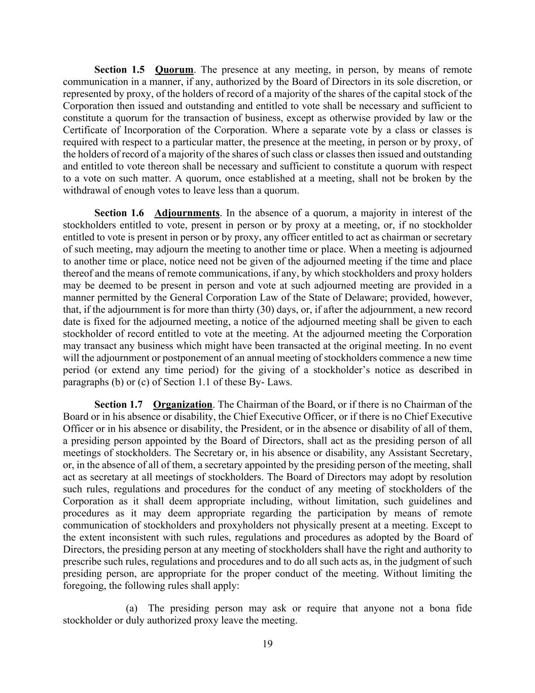 19 Section 1.5 Quorum. The presence at any meeting, in person, by means of remote communication in a manner, if any, authorized by the Board of Directors in its sole discretion, or represented by proxy, of the holders of record of a majority of the shares of the capital stock of the Corporation then issued and outstanding and entitled to vote shall be necessary and sufficient to constitute a quorum for the transaction of business, except as otherwise provided by law or the Certificate of Incorporation of the Corporation. Where a separate vote by a class or classes is required with respect to a particular matter, the presence at the meeting, in person or by proxy, of the holders of record of a majority of the shares of such class or classes then issued and outstanding and entitled to vote thereon shall be necessary and sufficient to constitute a quorum with respect to a vote on such matter. A quorum, once established at a meeting, shall not be broken by the withdrawal of enough votes to leave less than a quorum. Section 1.6 Adjournments. In the absence of a quorum, a majority in interest of the stockholders entitled to vote, present in person or by proxy at a meeting, or, if no stockholder entitled to vote is present in person or by proxy, any officer entitled to act as chairman or secretary of such meeting, may adjourn the meeting to another time or place. When a meeting is adjourned to another time or place, notice need not be given of the adjourned meeting if the time and place thereof and the means of remote communications, if any, by which stockholders and proxy holders may be deemed to be present in person and vote at such adjourned meeting are provided in a manner permitted by the General Corporation Law of the State of Delaware; provided, however, that, if the adjournment is for more than thirty (30) days, or, if after the adjournment, a new record date is fixed for the adjourned meeting, a notice of the adjourned meeting shall be given to each stockholder of record entitled to vote at the meeting. At the adjourned meeting the Corporation may transact any business which might have been transacted at the original meeting. In no event will the adjournment or postponement of an annual meeting of stockholders commence a new time period (or extend any time period) for the giving of a stockholder’s notice as described in paragraphs (b) or (c) of Section 1.1 of these By- Laws. Section 1.7 Organization. The Chairman of the Board, or if there is no Chairman of the Board or in his absence or disability, the Chief Executive Officer, or if there is no Chief Executive Officer or in his absence or disability, the President, or in the absence or disability of all of them, a presiding person appointed by the Board of Directors, shall act as the presiding person of all meetings of stockholders. The Secretary or, in his absence or disability, any Assistant Secretary, or, in the absence of all of them, a secretary appointed by the presiding person of the meeting, shall act as secretary at all meetings of stockholders. The Board of Directors may adopt by resolution such rules, regulations and procedures for the conduct of any meeting of stockholders of the Corporation as it shall deem appropriate including, without limitation, such guidelines and procedures as it may deem appropriate regarding the participation by means of remote communication of stockholders and proxyholders not physically present at a meeting. Except to the extent inconsistent with such rules, regulations and procedures as adopted by the Board of Directors, the presiding person at any meeting of stockholders shall have the right and authority to prescribe such rules, regulations and procedures and to do all such acts as, in the judgment of such presiding person, are appropriate for the proper conduct of the meeting. Without limiting the foregoing, the following rules shall apply: (a) The presiding person may ask or require that anyone not a bona fide stockholder or duly authorized proxy leave the meeting.