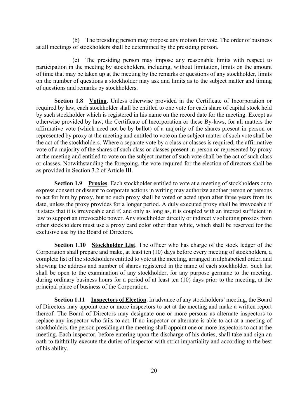 20 (b) The presiding person may propose any motion for vote. The order of business at all meetings of stockholders shall be determined by the presiding person. (c) The presiding person may impose any reasonable limits with respect to participation in the meeting by stockholders, including, without limitation, limits on the amount of time that may be taken up at the meeting by the remarks or questions of any stockholder, limits on the number of questions a stockholder may ask and limits as to the subject matter and timing of questions and remarks by stockholders. Section 1.8 Voting. Unless otherwise provided in the Certificate of Incorporation or required by law, each stockholder shall be entitled to one vote for each share of capital stock held by such stockholder which is registered in his name on the record date for the meeting. Except as otherwise provided by law, the Certificate of Incorporation or these By-laws, for all matters the affirmative vote (which need not be by ballot) of a majority of the shares present in person or represented by proxy at the meeting and entitled to vote on the subject matter of such vote shall be the act of the stockholders. Where a separate vote by a class or classes is required, the affirmative vote of a majority of the shares of such class or classes present in person or represented by proxy at the meeting and entitled to vote on the subject matter of such vote shall be the act of such class or classes. Notwithstanding the foregoing, the vote required for the election of directors shall be as provided in Section 3.2 of Article III. Section 1.9 Proxies. Each stockholder entitled to vote at a meeting of stockholders or to express consent or dissent to corporate actions in writing may authorize another person or persons to act for him by proxy, but no such proxy shall be voted or acted upon after three years from its date, unless the proxy provides for a longer period. A duly executed proxy shall be irrevocable if it states that it is irrevocable and if, and only as long as, it is coupled with an interest sufficient in law to support an irrevocable power. Any stockholder directly or indirectly soliciting proxies from other stockholders must use a proxy card color other than white, which shall be reserved for the exclusive use by the Board of Directors. Section 1.10 Stockholder List. The officer who has charge of the stock ledger of the Corporation shall prepare and make, at least ten (10) days before every meeting of stockholders, a complete list of the stockholders entitled to vote at the meeting, arranged in alphabetical order, and showing the address and number of shares registered in the name of each stockholder. Such list shall be open to the examination of any stockholder, for any purpose germane to the meeting, during ordinary business hours for a period of at least ten (10) days prior to the meeting, at the principal place of business of the Corporation. Section 1.11 Inspectors of Election. In advance of any stockholders’ meeting, the Board of Directors may appoint one or more inspectors to act at the meeting and make a written report thereof. The Board of Directors may designate one or more persons as alternate inspectors to replace any inspector who fails to act. If no inspector or alternate is able to act at a meeting of stockholders, the person presiding at the meeting shall appoint one or more inspectors to act at the meeting. Each inspector, before entering upon the discharge of his duties, shall take and sign an oath to faithfully execute the duties of inspector with strict impartiality and according to the best of his ability.