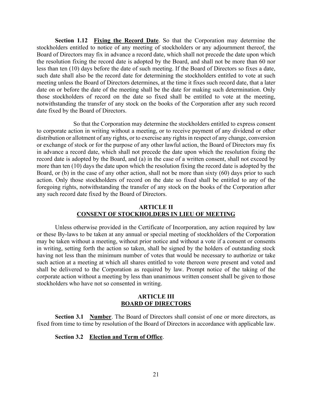 21 Section 1.12 Fixing the Record Date. So that the Corporation may determine the stockholders entitled to notice of any meeting of stockholders or any adjournment thereof, the Board of Directors may fix in advance a record date, which shall not precede the date upon which the resolution fixing the record date is adopted by the Board, and shall not be more than 60 nor less than ten (10) days before the date of such meeting. If the Board of Directors so fixes a date, such date shall also be the record date for determining the stockholders entitled to vote at such meeting unless the Board of Directors determines, at the time it fixes such record date, that a later date on or before the date of the meeting shall be the date for making such determination. Only those stockholders of record on the date so fixed shall be entitled to vote at the meeting, notwithstanding the transfer of any stock on the books of the Corporation after any such record date fixed by the Board of Directors. So that the Corporation may determine the stockholders entitled to express consent to corporate action in writing without a meeting, or to receive payment of any dividend or other distribution or allotment of any rights, or to exercise any rights in respect of any change, conversion or exchange of stock or for the purpose of any other lawful action, the Board of Directors may fix in advance a record date, which shall not precede the date upon which the resolution fixing the record date is adopted by the Board, and (a) in the case of a written consent, shall not exceed by more than ten (10) days the date upon which the resolution fixing the record date is adopted by the Board, or (b) in the case of any other action, shall not be more than sixty (60) days prior to such action. Only those stockholders of record on the date so fixed shall be entitled to any of the foregoing rights, notwithstanding the transfer of any stock on the books of the Corporation after any such record date fixed by the Board of Directors. ARTICLE II CONSENT OF STOCKHOLDERS IN LIEU OF MEETING Unless otherwise provided in the Certificate of Incorporation, any action required by law or these By-laws to be taken at any annual or special meeting of stockholders of the Corporation may be taken without a meeting, without prior notice and without a vote if a consent or consents in writing, setting forth the action so taken, shall be signed by the holders of outstanding stock having not less than the minimum number of votes that would be necessary to authorize or take such action at a meeting at which all shares entitled to vote thereon were present and voted and shall be delivered to the Corporation as required by law. Prompt notice of the taking of the corporate action without a meeting by less than unanimous written consent shall be given to those stockholders who have not so consented in writing. ARTICLE III BOARD OF DIRECTORS Section 3.1 Number. The Board of Directors shall consist of one or more directors, as fixed from time to time by resolution of the Board of Directors in accordance with applicable law. Section 3.2 Election and Term of Office.