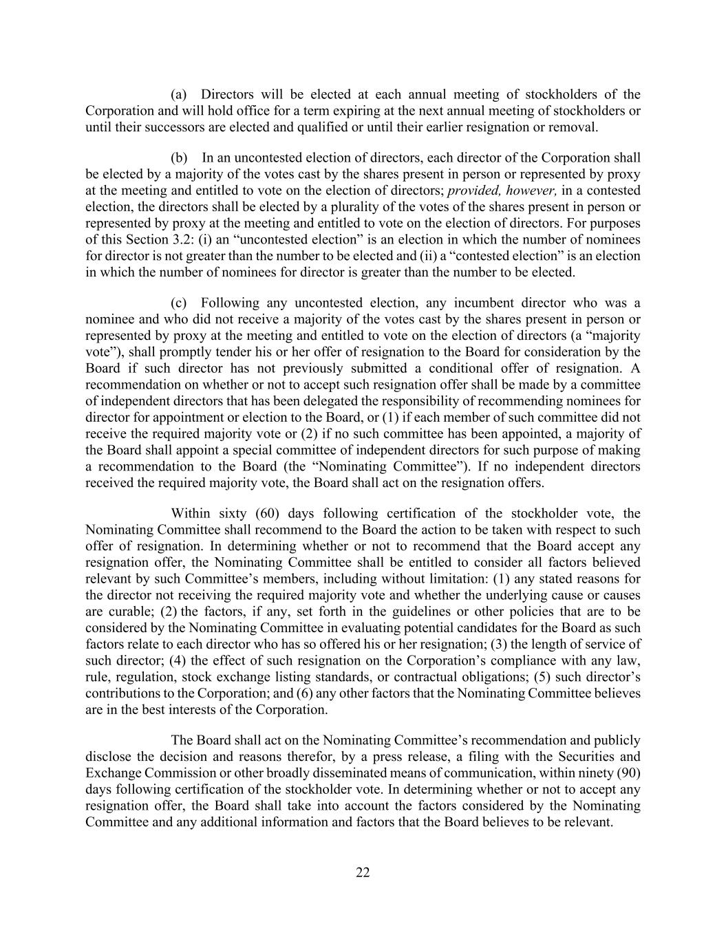 22 (a) Directors will be elected at each annual meeting of stockholders of the Corporation and will hold office for a term expiring at the next annual meeting of stockholders or until their successors are elected and qualified or until their earlier resignation or removal. (b) In an uncontested election of directors, each director of the Corporation shall be elected by a majority of the votes cast by the shares present in person or represented by proxy at the meeting and entitled to vote on the election of directors; provided, however, in a contested election, the directors shall be elected by a plurality of the votes of the shares present in person or represented by proxy at the meeting and entitled to vote on the election of directors. For purposes of this Section 3.2: (i) an “uncontested election” is an election in which the number of nominees for director is not greater than the number to be elected and (ii) a “contested election” is an election in which the number of nominees for director is greater than the number to be elected. (c) Following any uncontested election, any incumbent director who was a nominee and who did not receive a majority of the votes cast by the shares present in person or represented by proxy at the meeting and entitled to vote on the election of directors (a “majority vote”), shall promptly tender his or her offer of resignation to the Board for consideration by the Board if such director has not previously submitted a conditional offer of resignation. A recommendation on whether or not to accept such resignation offer shall be made by a committee of independent directors that has been delegated the responsibility of recommending nominees for director for appointment or election to the Board, or (1) if each member of such committee did not receive the required majority vote or (2) if no such committee has been appointed, a majority of the Board shall appoint a special committee of independent directors for such purpose of making a recommendation to the Board (the “Nominating Committee”). If no independent directors received the required majority vote, the Board shall act on the resignation offers. Within sixty (60) days following certification of the stockholder vote, the Nominating Committee shall recommend to the Board the action to be taken with respect to such offer of resignation. In determining whether or not to recommend that the Board accept any resignation offer, the Nominating Committee shall be entitled to consider all factors believed relevant by such Committee’s members, including without limitation: (1) any stated reasons for the director not receiving the required majority vote and whether the underlying cause or causes are curable; (2) the factors, if any, set forth in the guidelines or other policies that are to be considered by the Nominating Committee in evaluating potential candidates for the Board as such factors relate to each director who has so offered his or her resignation; (3) the length of service of such director; (4) the effect of such resignation on the Corporation’s compliance with any law, rule, regulation, stock exchange listing standards, or contractual obligations; (5) such director’s contributions to the Corporation; and (6) any other factors that the Nominating Committee believes are in the best interests of the Corporation. The Board shall act on the Nominating Committee’s recommendation and publicly disclose the decision and reasons therefor, by a press release, a filing with the Securities and Exchange Commission or other broadly disseminated means of communication, within ninety (90) days following certification of the stockholder vote. In determining whether or not to accept any resignation offer, the Board shall take into account the factors considered by the Nominating Committee and any additional information and factors that the Board believes to be relevant.