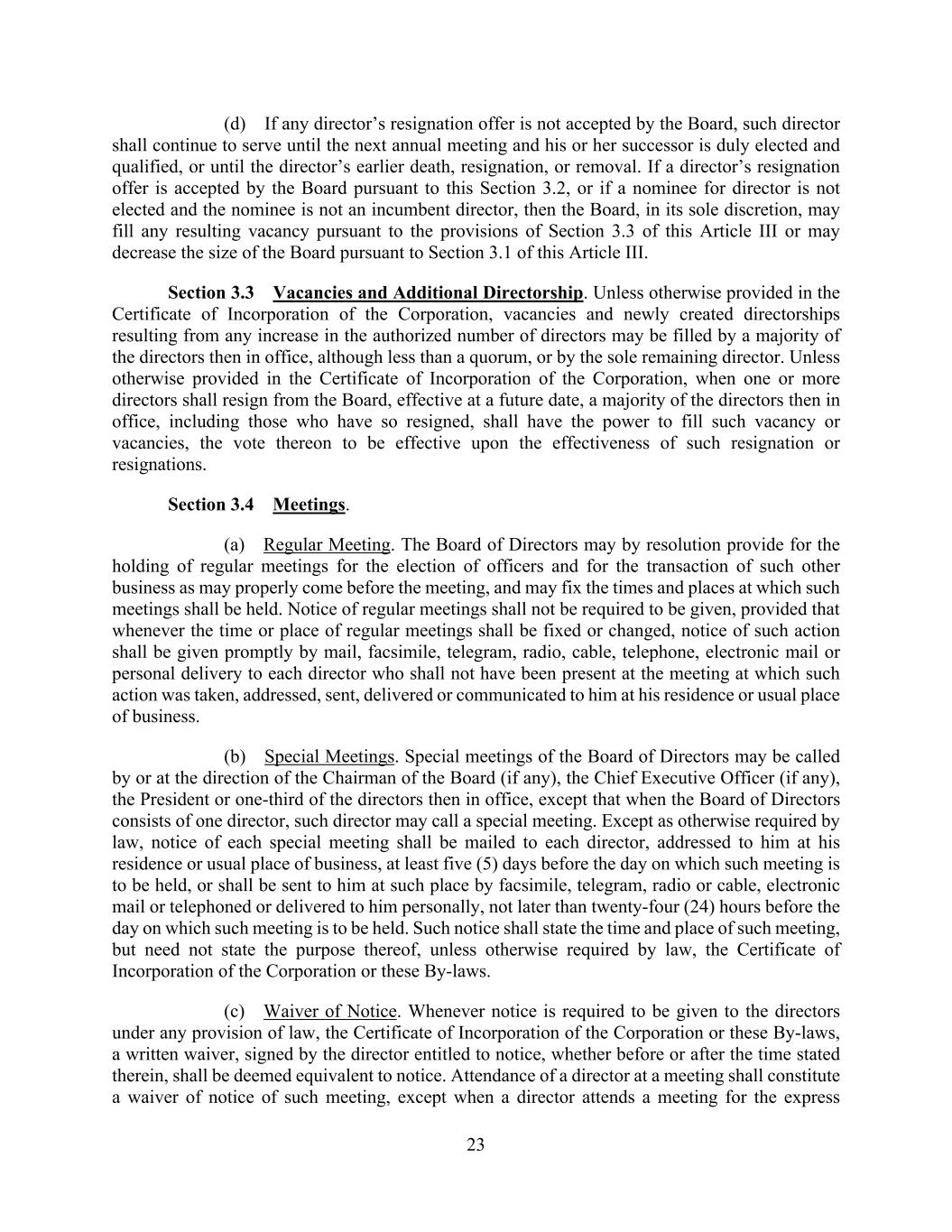 23 (d) If any director’s resignation offer is not accepted by the Board, such director shall continue to serve until the next annual meeting and his or her successor is duly elected and qualified, or until the director’s earlier death, resignation, or removal. If a director’s resignation offer is accepted by the Board pursuant to this Section 3.2, or if a nominee for director is not elected and the nominee is not an incumbent director, then the Board, in its sole discretion, may fill any resulting vacancy pursuant to the provisions of Section 3.3 of this Article III or may decrease the size of the Board pursuant to Section 3.1 of this Article III. Section 3.3 Vacancies and Additional Directorship. Unless otherwise provided in the Certificate of Incorporation of the Corporation, vacancies and newly created directorships resulting from any increase in the authorized number of directors may be filled by a majority of the directors then in office, although less than a quorum, or by the sole remaining director. Unless otherwise provided in the Certificate of Incorporation of the Corporation, when one or more directors shall resign from the Board, effective at a future date, a majority of the directors then in office, including those who have so resigned, shall have the power to fill such vacancy or vacancies, the vote thereon to be effective upon the effectiveness of such resignation or resignations. Section 3.4 Meetings. (a) Regular Meeting. The Board of Directors may by resolution provide for the holding of regular meetings for the election of officers and for the transaction of such other business as may properly come before the meeting, and may fix the times and places at which such meetings shall be held. Notice of regular meetings shall not be required to be given, provided that whenever the time or place of regular meetings shall be fixed or changed, notice of such action shall be given promptly by mail, facsimile, telegram, radio, cable, telephone, electronic mail or personal delivery to each director who shall not have been present at the meeting at which such action was taken, addressed, sent, delivered or communicated to him at his residence or usual place of business. (b) Special Meetings. Special meetings of the Board of Directors may be called by or at the direction of the Chairman of the Board (if any), the Chief Executive Officer (if any), the President or one-third of the directors then in office, except that when the Board of Directors consists of one director, such director may call a special meeting. Except as otherwise required by law, notice of each special meeting shall be mailed to each director, addressed to him at his residence or usual place of business, at least five (5) days before the day on which such meeting is to be held, or shall be sent to him at such place by facsimile, telegram, radio or cable, electronic mail or telephoned or delivered to him personally, not later than twenty-four (24) hours before the day on which such meeting is to be held. Such notice shall state the time and place of such meeting, but need not state the purpose thereof, unless otherwise required by law, the Certificate of Incorporation of the Corporation or these By-laws. (c) Waiver of Notice. Whenever notice is required to be given to the directors under any provision of law, the Certificate of Incorporation of the Corporation or these By-laws, a written waiver, signed by the director entitled to notice, whether before or after the time stated therein, shall be deemed equivalent to notice. Attendance of a director at a meeting shall constitute a waiver of notice of such meeting, except when a director attends a meeting for the express