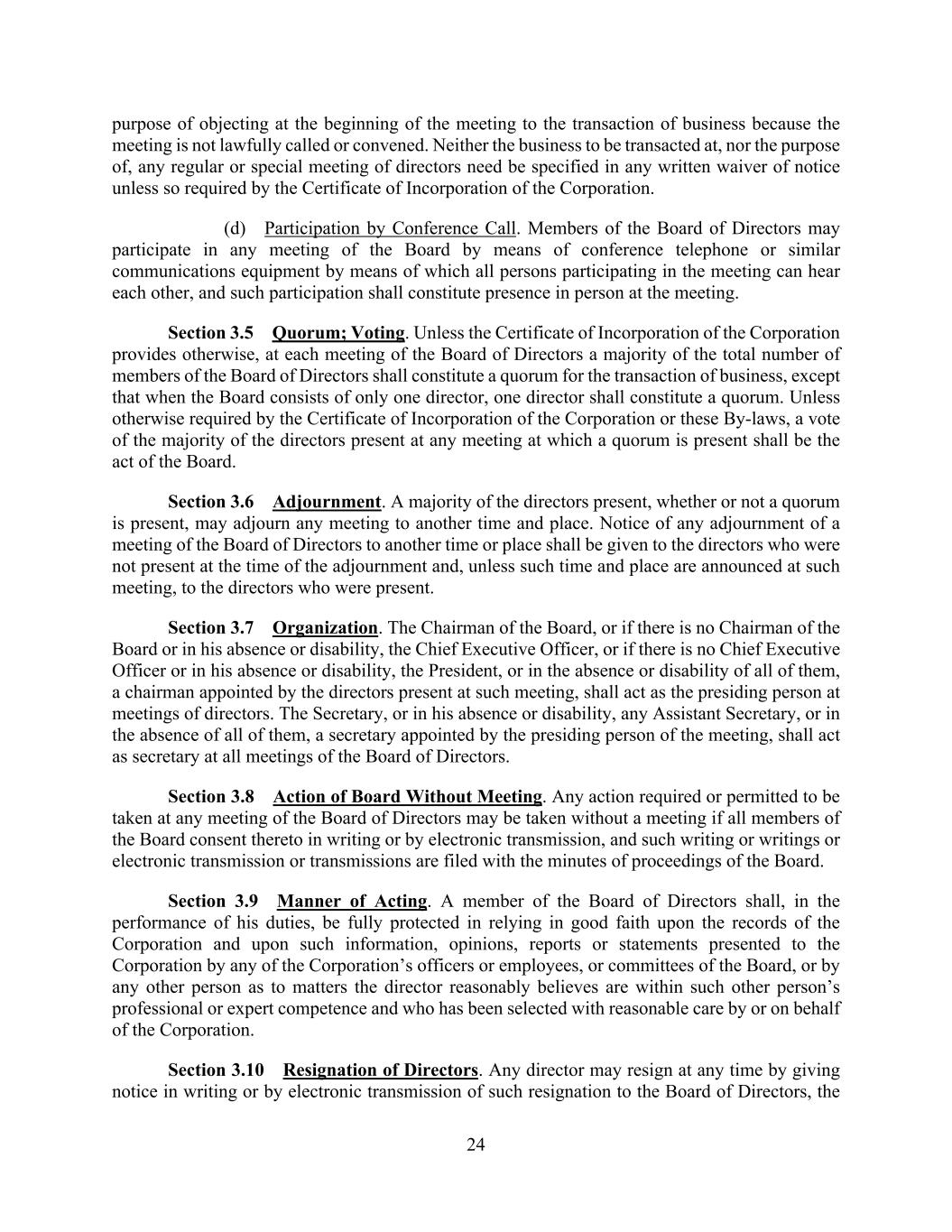 24 purpose of objecting at the beginning of the meeting to the transaction of business because the meeting is not lawfully called or convened. Neither the business to be transacted at, nor the purpose of, any regular or special meeting of directors need be specified in any written waiver of notice unless so required by the Certificate of Incorporation of the Corporation. (d) Participation by Conference Call. Members of the Board of Directors may participate in any meeting of the Board by means of conference telephone or similar communications equipment by means of which all persons participating in the meeting can hear each other, and such participation shall constitute presence in person at the meeting. Section 3.5 Quorum; Voting. Unless the Certificate of Incorporation of the Corporation provides otherwise, at each meeting of the Board of Directors a majority of the total number of members of the Board of Directors shall constitute a quorum for the transaction of business, except that when the Board consists of only one director, one director shall constitute a quorum. Unless otherwise required by the Certificate of Incorporation of the Corporation or these By-laws, a vote of the majority of the directors present at any meeting at which a quorum is present shall be the act of the Board. Section 3.6 Adjournment. A majority of the directors present, whether or not a quorum is present, may adjourn any meeting to another time and place. Notice of any adjournment of a meeting of the Board of Directors to another time or place shall be given to the directors who were not present at the time of the adjournment and, unless such time and place are announced at such meeting, to the directors who were present. Section 3.7 Organization. The Chairman of the Board, or if there is no Chairman of the Board or in his absence or disability, the Chief Executive Officer, or if there is no Chief Executive Officer or in his absence or disability, the President, or in the absence or disability of all of them, a chairman appointed by the directors present at such meeting, shall act as the presiding person at meetings of directors. The Secretary, or in his absence or disability, any Assistant Secretary, or in the absence of all of them, a secretary appointed by the presiding person of the meeting, shall act as secretary at all meetings of the Board of Directors. Section 3.8 Action of Board Without Meeting. Any action required or permitted to be taken at any meeting of the Board of Directors may be taken without a meeting if all members of the Board consent thereto in writing or by electronic transmission, and such writing or writings or electronic transmission or transmissions are filed with the minutes of proceedings of the Board. Section 3.9 Manner of Acting. A member of the Board of Directors shall, in the performance of his duties, be fully protected in relying in good faith upon the records of the Corporation and upon such information, opinions, reports or statements presented to the Corporation by any of the Corporation’s officers or employees, or committees of the Board, or by any other person as to matters the director reasonably believes are within such other person’s professional or expert competence and who has been selected with reasonable care by or on behalf of the Corporation. Section 3.10 Resignation of Directors. Any director may resign at any time by giving notice in writing or by electronic transmission of such resignation to the Board of Directors, the