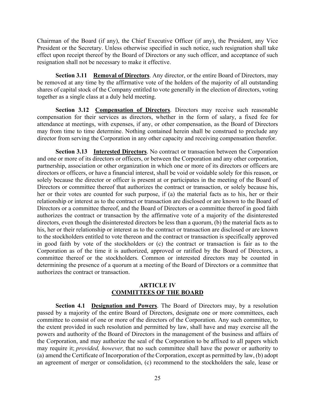 25 Chairman of the Board (if any), the Chief Executive Officer (if any), the President, any Vice President or the Secretary. Unless otherwise specified in such notice, such resignation shall take effect upon receipt thereof by the Board of Directors or any such officer, and acceptance of such resignation shall not be necessary to make it effective. Section 3.11 Removal of Directors. Any director, or the entire Board of Directors, may be removed at any time by the affirmative vote of the holders of the majority of all outstanding shares of capital stock of the Company entitled to vote generally in the election of directors, voting together as a single class at a duly held meeting. Section 3.12 Compensation of Directors. Directors may receive such reasonable compensation for their services as directors, whether in the form of salary, a fixed fee for attendance at meetings, with expenses, if any, or other compensation, as the Board of Directors may from time to time determine. Nothing contained herein shall be construed to preclude any director from serving the Corporation in any other capacity and receiving compensation therefor. Section 3.13 Interested Directors. No contract or transaction between the Corporation and one or more of its directors or officers, or between the Corporation and any other corporation, partnership, association or other organization in which one or more of its directors or officers are directors or officers, or have a financial interest, shall be void or voidable solely for this reason, or solely because the director or officer is present at or participates in the meeting of the Board of Directors or committee thereof that authorizes the contract or transaction, or solely because his, her or their votes are counted for such purpose, if (a) the material facts as to his, her or their relationship or interest as to the contract or transaction are disclosed or are known to the Board of Directors or a committee thereof, and the Board of Directors or a committee thereof in good faith authorizes the contract or transaction by the affirmative vote of a majority of the disinterested directors, even though the disinterested directors be less than a quorum, (b) the material facts as to his, her or their relationship or interest as to the contract or transaction are disclosed or are known to the stockholders entitled to vote thereon and the contract or transaction is specifically approved in good faith by vote of the stockholders or (c) the contract or transaction is fair as to the Corporation as of the time it is authorized, approved or ratified by the Board of Directors, a committee thereof or the stockholders. Common or interested directors may be counted in determining the presence of a quorum at a meeting of the Board of Directors or a committee that authorizes the contract or transaction. ARTICLE IV COMMITTEES OF THE BOARD Section 4.1 Designation and Powers. The Board of Directors may, by a resolution passed by a majority of the entire Board of Directors, designate one or more committees, each committee to consist of one or more of the directors of the Corporation. Any such committee, to the extent provided in such resolution and permitted by law, shall have and may exercise all the powers and authority of the Board of Directors in the management of the business and affairs of the Corporation, and may authorize the seal of the Corporation to be affixed to all papers which may require it; provided, however, that no such committee shall have the power or authority to (a) amend the Certificate of Incorporation of the Corporation, except as permitted by law, (b) adopt an agreement of merger or consolidation, (c) recommend to the stockholders the sale, lease or