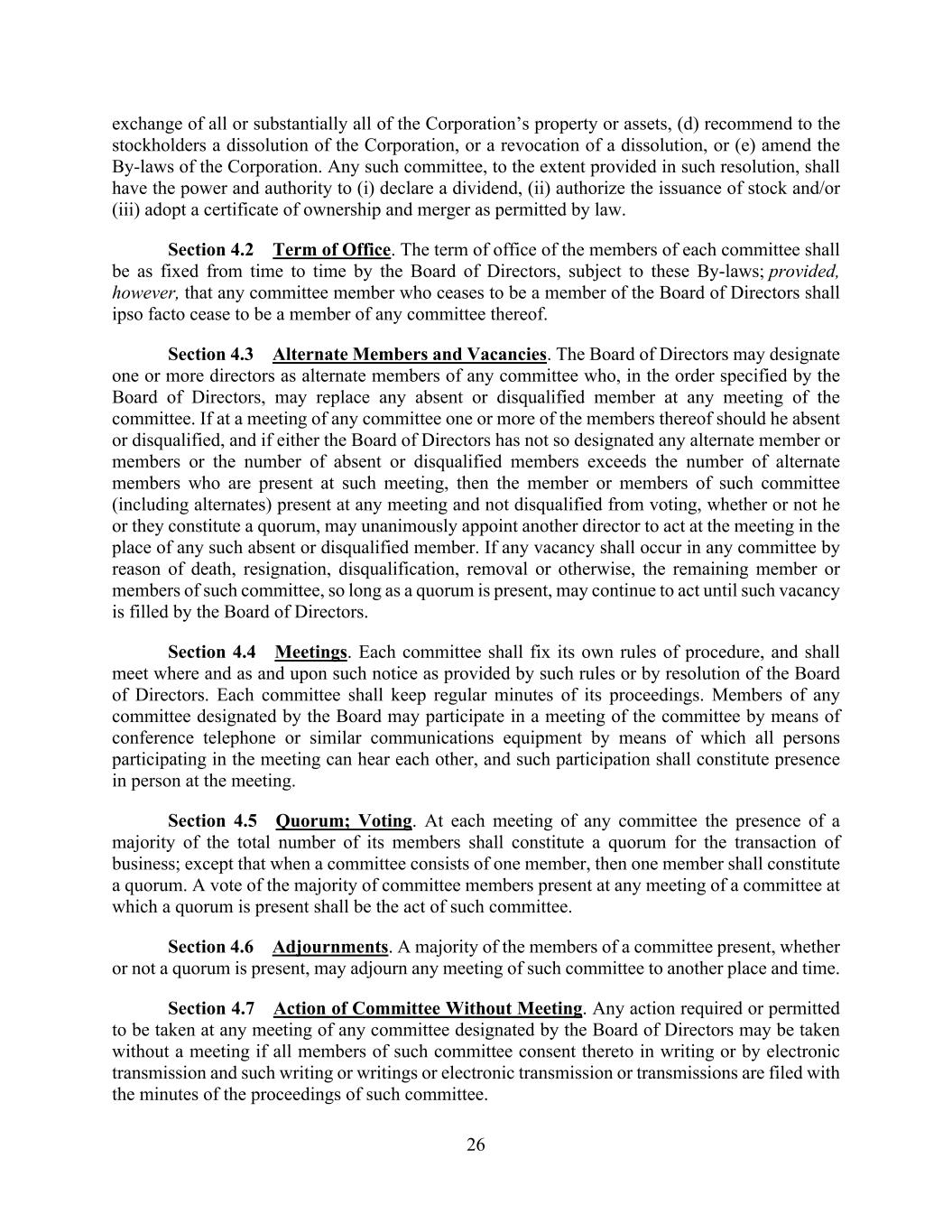 26 exchange of all or substantially all of the Corporation’s property or assets, (d) recommend to the stockholders a dissolution of the Corporation, or a revocation of a dissolution, or (e) amend the By-laws of the Corporation. Any such committee, to the extent provided in such resolution, shall have the power and authority to (i) declare a dividend, (ii) authorize the issuance of stock and/or (iii) adopt a certificate of ownership and merger as permitted by law. Section 4.2 Term of Office. The term of office of the members of each committee shall be as fixed from time to time by the Board of Directors, subject to these By-laws; provided, however, that any committee member who ceases to be a member of the Board of Directors shall ipso facto cease to be a member of any committee thereof. Section 4.3 Alternate Members and Vacancies. The Board of Directors may designate one or more directors as alternate members of any committee who, in the order specified by the Board of Directors, may replace any absent or disqualified member at any meeting of the committee. If at a meeting of any committee one or more of the members thereof should he absent or disqualified, and if either the Board of Directors has not so designated any alternate member or members or the number of absent or disqualified members exceeds the number of alternate members who are present at such meeting, then the member or members of such committee (including alternates) present at any meeting and not disqualified from voting, whether or not he or they constitute a quorum, may unanimously appoint another director to act at the meeting in the place of any such absent or disqualified member. If any vacancy shall occur in any committee by reason of death, resignation, disqualification, removal or otherwise, the remaining member or members of such committee, so long as a quorum is present, may continue to act until such vacancy is filled by the Board of Directors. Section 4.4 Meetings. Each committee shall fix its own rules of procedure, and shall meet where and as and upon such notice as provided by such rules or by resolution of the Board of Directors. Each committee shall keep regular minutes of its proceedings. Members of any committee designated by the Board may participate in a meeting of the committee by means of conference telephone or similar communications equipment by means of which all persons participating in the meeting can hear each other, and such participation shall constitute presence in person at the meeting. Section 4.5 Quorum; Voting. At each meeting of any committee the presence of a majority of the total number of its members shall constitute a quorum for the transaction of business; except that when a committee consists of one member, then one member shall constitute a quorum. A vote of the majority of committee members present at any meeting of a committee at which a quorum is present shall be the act of such committee. Section 4.6 Adjournments. A majority of the members of a committee present, whether or not a quorum is present, may adjourn any meeting of such committee to another place and time. Section 4.7 Action of Committee Without Meeting. Any action required or permitted to be taken at any meeting of any committee designated by the Board of Directors may be taken without a meeting if all members of such committee consent thereto in writing or by electronic transmission and such writing or writings or electronic transmission or transmissions are filed with the minutes of the proceedings of such committee.
