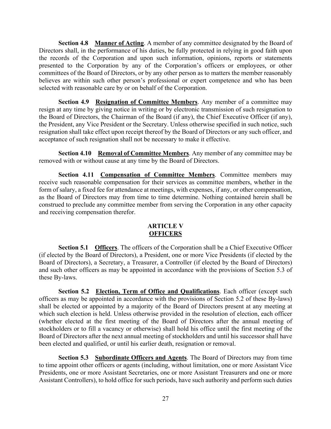 27 Section 4.8 Manner of Acting. A member of any committee designated by the Board of Directors shall, in the performance of his duties, be fully protected in relying in good faith upon the records of the Corporation and upon such information, opinions, reports or statements presented to the Corporation by any of the Corporation’s officers or employees, or other committees of the Board of Directors, or by any other person as to matters the member reasonably believes are within such other person’s professional or expert competence and who has been selected with reasonable care by or on behalf of the Corporation. Section 4.9 Resignation of Committee Members. Any member of a committee may resign at any time by giving notice in writing or by electronic transmission of such resignation to the Board of Directors, the Chairman of the Board (if any), the Chief Executive Officer (if any), the President, any Vice President or the Secretary. Unless otherwise specified in such notice, such resignation shall take effect upon receipt thereof by the Board of Directors or any such officer, and acceptance of such resignation shall not be necessary to make it effective. Section 4.10 Removal of Committee Members. Any member of any committee may be removed with or without cause at any time by the Board of Directors. Section 4.11 Compensation of Committee Members. Committee members may receive such reasonable compensation for their services as committee members, whether in the form of salary, a fixed fee for attendance at meetings, with expenses, if any, or other compensation, as the Board of Directors may from time to time determine. Nothing contained herein shall be construed to preclude any committee member from serving the Corporation in any other capacity and receiving compensation therefor. ARTICLE V OFFICERS Section 5.1 Officers. The officers of the Corporation shall be a Chief Executive Officer (if elected by the Board of Directors), a President, one or more Vice Presidents (if elected by the Board of Directors), a Secretary, a Treasurer, a Controller (if elected by the Board of Directors) and such other officers as may be appointed in accordance with the provisions of Section 5.3 of these By-laws. Section 5.2 Election, Term of Office and Qualifications. Each officer (except such officers as may be appointed in accordance with the provisions of Section 5.2 of these By-laws) shall be elected or appointed by a majority of the Board of Directors present at any meeting at which such election is held. Unless otherwise provided in the resolution of election, each officer (whether elected at the first meeting of the Board of Directors after the annual meeting of stockholders or to fill a vacancy or otherwise) shall hold his office until the first meeting of the Board of Directors after the next annual meeting of stockholders and until his successor shall have been elected and qualified, or until his earlier death, resignation or removal. Section 5.3 Subordinate Officers and Agents. The Board of Directors may from time to time appoint other officers or agents (including, without limitation, one or more Assistant Vice Presidents, one or more Assistant Secretaries, one or more Assistant Treasurers and one or more Assistant Controllers), to hold office for such periods, have such authority and perform such duties