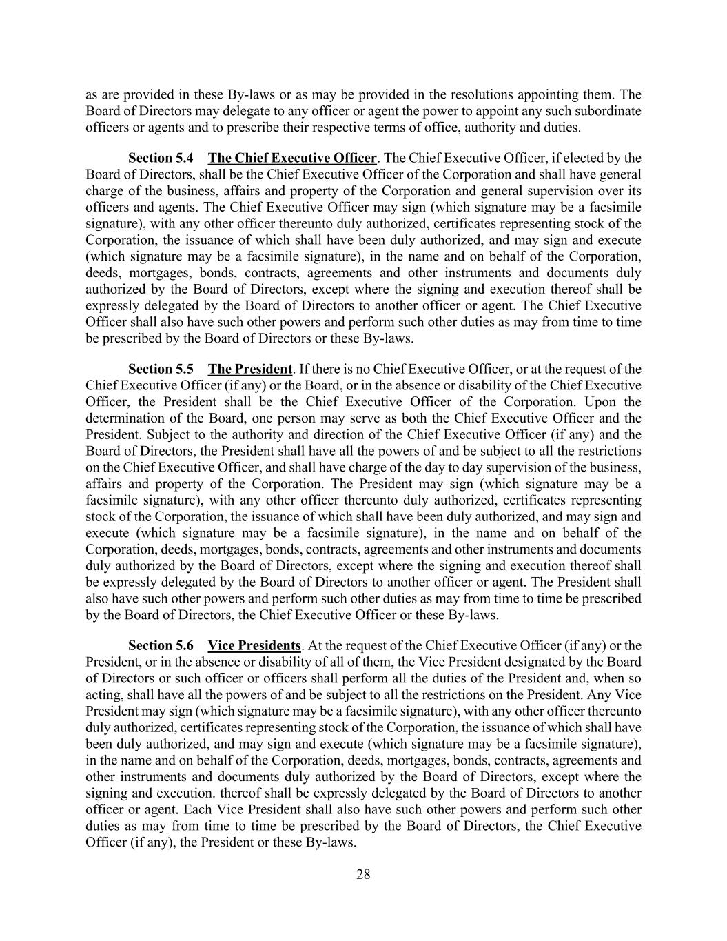 28 as are provided in these By-laws or as may be provided in the resolutions appointing them. The Board of Directors may delegate to any officer or agent the power to appoint any such subordinate officers or agents and to prescribe their respective terms of office, authority and duties. Section 5.4 The Chief Executive Officer. The Chief Executive Officer, if elected by the Board of Directors, shall be the Chief Executive Officer of the Corporation and shall have general charge of the business, affairs and property of the Corporation and general supervision over its officers and agents. The Chief Executive Officer may sign (which signature may be a facsimile signature), with any other officer thereunto duly authorized, certificates representing stock of the Corporation, the issuance of which shall have been duly authorized, and may sign and execute (which signature may be a facsimile signature), in the name and on behalf of the Corporation, deeds, mortgages, bonds, contracts, agreements and other instruments and documents duly authorized by the Board of Directors, except where the signing and execution thereof shall be expressly delegated by the Board of Directors to another officer or agent. The Chief Executive Officer shall also have such other powers and perform such other duties as may from time to time be prescribed by the Board of Directors or these By-laws. Section 5.5 The President. If there is no Chief Executive Officer, or at the request of the Chief Executive Officer (if any) or the Board, or in the absence or disability of the Chief Executive Officer, the President shall be the Chief Executive Officer of the Corporation. Upon the determination of the Board, one person may serve as both the Chief Executive Officer and the President. Subject to the authority and direction of the Chief Executive Officer (if any) and the Board of Directors, the President shall have all the powers of and be subject to all the restrictions on the Chief Executive Officer, and shall have charge of the day to day supervision of the business, affairs and property of the Corporation. The President may sign (which signature may be a facsimile signature), with any other officer thereunto duly authorized, certificates representing stock of the Corporation, the issuance of which shall have been duly authorized, and may sign and execute (which signature may be a facsimile signature), in the name and on behalf of the Corporation, deeds, mortgages, bonds, contracts, agreements and other instruments and documents duly authorized by the Board of Directors, except where the signing and execution thereof shall be expressly delegated by the Board of Directors to another officer or agent. The President shall also have such other powers and perform such other duties as may from time to time be prescribed by the Board of Directors, the Chief Executive Officer or these By-laws. Section 5.6 Vice Presidents. At the request of the Chief Executive Officer (if any) or the President, or in the absence or disability of all of them, the Vice President designated by the Board of Directors or such officer or officers shall perform all the duties of the President and, when so acting, shall have all the powers of and be subject to all the restrictions on the President. Any Vice President may sign (which signature may be a facsimile signature), with any other officer thereunto duly authorized, certificates representing stock of the Corporation, the issuance of which shall have been duly authorized, and may sign and execute (which signature may be a facsimile signature), in the name and on behalf of the Corporation, deeds, mortgages, bonds, contracts, agreements and other instruments and documents duly authorized by the Board of Directors, except where the signing and execution. thereof shall be expressly delegated by the Board of Directors to another officer or agent. Each Vice President shall also have such other powers and perform such other duties as may from time to time be prescribed by the Board of Directors, the Chief Executive Officer (if any), the President or these By-laws.