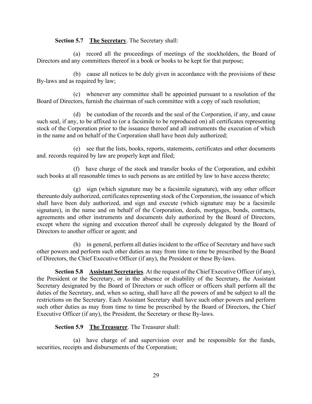 29 Section 5.7 The Secretary. The Secretary shall: (a) record all the proceedings of meetings of the stockholders, the Board of Directors and any committees thereof in a book or books to be kept for that purpose; (b) cause all notices to be duly given in accordance with the provisions of these By-laws and as required by law; (c) whenever any committee shall be appointed pursuant to a resolution of the Board of Directors, furnish the chairman of such committee with a copy of such resolution; (d) be custodian of the records and the seal of the Corporation, if any, and cause such seal, if any, to be affixed to (or a facsimile to be reproduced on) all certificates representing stock of the Corporation prior to the issuance thereof and all instruments the execution of which in the name and on behalf of the Corporation shall have been duly authorized; (e) see that the lists, books, reports, statements, certificates and other documents and. records required by law are properly kept and filed; (f) have charge of the stock and transfer books of the Corporation, and exhibit such books at all reasonable times to such persons as are entitled by law to have access thereto; (g) sign (which signature may be a facsimile signature), with any other officer thereunto duly authorized, certificates representing stock of the Corporation, the issuance of which shall have been duly authorized, and sign and execute (which signature may be a facsimile signature), in the name and on behalf of the Corporation, deeds, mortgages, bonds, contracts, agreements and other instruments and documents duly authorized by the Board of Directors, except where the signing and execution thereof shall be expressly delegated by the Board of Directors to another officer or agent; and (h) in general, perform all duties incident to the office of Secretary and have such other powers and perform such other duties as may from time to time be prescribed by the Board of Directors, the Chief Executive Officer (if any), the President or these By-laws. Section 5.8 Assistant Secretaries. At the request of the Chief Executive Officer (if any), the President or the Secretary, or in the absence or disability of the Secretary, the Assistant Secretary designated by the Board of Directors or such officer or officers shall perform all the duties of the Secretary, and, when so acting, shall have all the powers of and be subject to all the restrictions on the Secretary. Each Assistant Secretary shall have such other powers and perform such other duties as may from time to time be prescribed by the Board of Directors, the Chief Executive Officer (if any), the President, the Secretary or these By-laws. Section 5.9 The Treasurer. The Treasurer shall: (a) have charge of and supervision over and be responsible for the funds, securities, receipts and disbursements of the Corporation;
