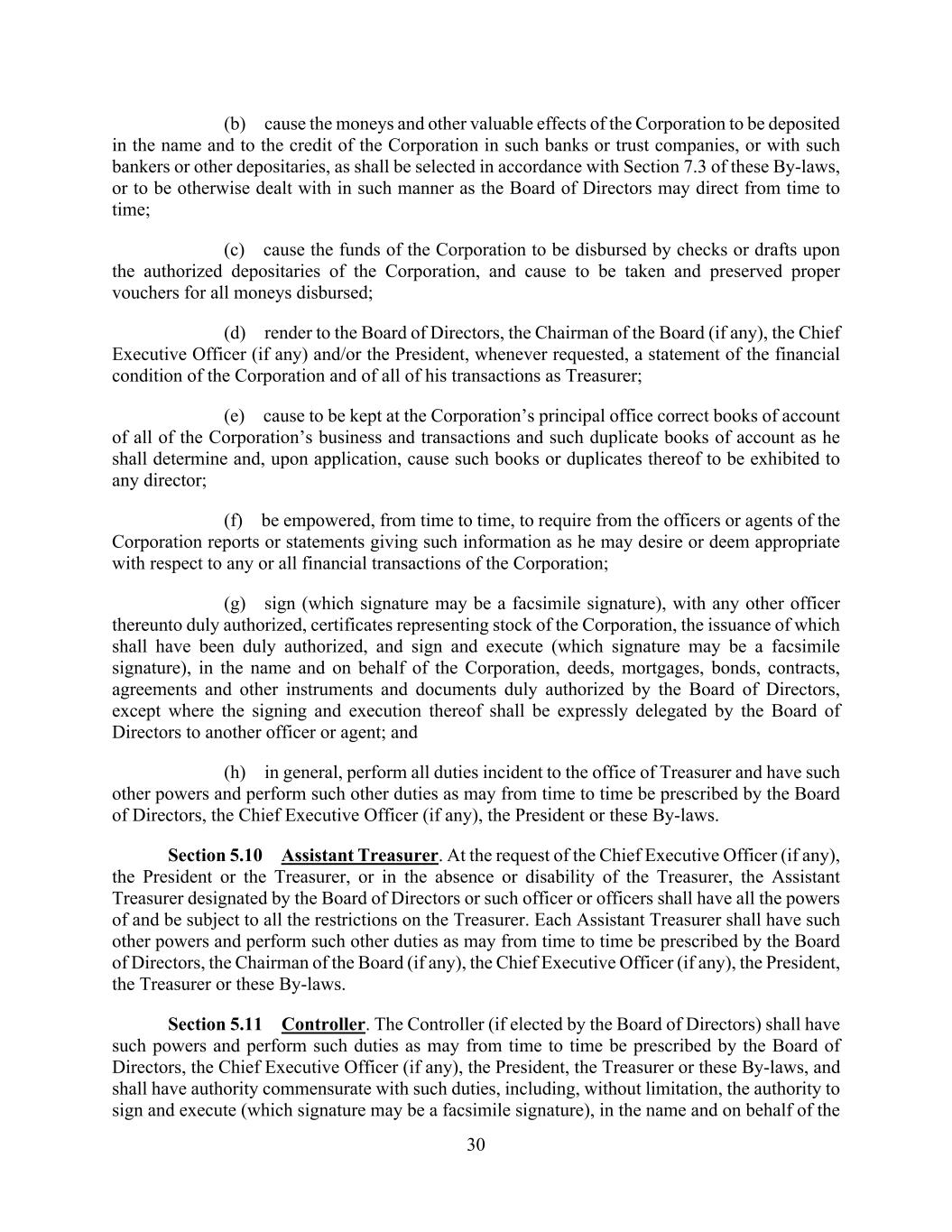 30 (b) cause the moneys and other valuable effects of the Corporation to be deposited in the name and to the credit of the Corporation in such banks or trust companies, or with such bankers or other depositaries, as shall be selected in accordance with Section 7.3 of these By-laws, or to be otherwise dealt with in such manner as the Board of Directors may direct from time to time; (c) cause the funds of the Corporation to be disbursed by checks or drafts upon the authorized depositaries of the Corporation, and cause to be taken and preserved proper vouchers for all moneys disbursed; (d) render to the Board of Directors, the Chairman of the Board (if any), the Chief Executive Officer (if any) and/or the President, whenever requested, a statement of the financial condition of the Corporation and of all of his transactions as Treasurer; (e) cause to be kept at the Corporation’s principal office correct books of account of all of the Corporation’s business and transactions and such duplicate books of account as he shall determine and, upon application, cause such books or duplicates thereof to be exhibited to any director; (f) be empowered, from time to time, to require from the officers or agents of the Corporation reports or statements giving such information as he may desire or deem appropriate with respect to any or all financial transactions of the Corporation; (g) sign (which signature may be a facsimile signature), with any other officer thereunto duly authorized, certificates representing stock of the Corporation, the issuance of which shall have been duly authorized, and sign and execute (which signature may be a facsimile signature), in the name and on behalf of the Corporation, deeds, mortgages, bonds, contracts, agreements and other instruments and documents duly authorized by the Board of Directors, except where the signing and execution thereof shall be expressly delegated by the Board of Directors to another officer or agent; and (h) in general, perform all duties incident to the office of Treasurer and have such other powers and perform such other duties as may from time to time be prescribed by the Board of Directors, the Chief Executive Officer (if any), the President or these By-laws. Section 5.10 Assistant Treasurer. At the request of the Chief Executive Officer (if any), the President or the Treasurer, or in the absence or disability of the Treasurer, the Assistant Treasurer designated by the Board of Directors or such officer or officers shall have all the powers of and be subject to all the restrictions on the Treasurer. Each Assistant Treasurer shall have such other powers and perform such other duties as may from time to time be prescribed by the Board of Directors, the Chairman of the Board (if any), the Chief Executive Officer (if any), the President, the Treasurer or these By-laws. Section 5.11 Controller. The Controller (if elected by the Board of Directors) shall have such powers and perform such duties as may from time to time be prescribed by the Board of Directors, the Chief Executive Officer (if any), the President, the Treasurer or these By-laws, and shall have authority commensurate with such duties, including, without limitation, the authority to sign and execute (which signature may be a facsimile signature), in the name and on behalf of the