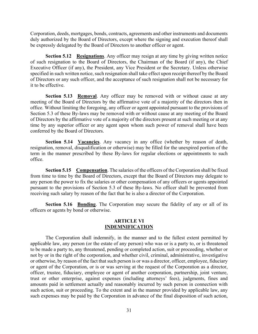 31 Corporation, deeds, mortgages, bonds, contracts, agreements and other instruments and documents duly authorized by the Board of Directors, except where the signing and execution thereof shall be expressly delegated by the Board of Directors to another officer or agent. Section 5.12 Resignations. Any officer may resign at any time by giving written notice of such resignation to the Board of Directors, the Chairman of the Board (if any), the Chief Executive Officer (if any), the President, any Vice President or the Secretary. Unless otherwise specified in such written notice, such resignation shall take effect upon receipt thereof by the Board of Directors or any such officer, and the acceptance of such resignation shall not be necessary for it to be effective. Section 5.13 Removal. Any officer may be removed with or without cause at any meeting of the Board of Directors by the affirmative vote of a majority of the directors then in office. Without limiting the foregoing, any officer or agent appointed pursuant to the provisions of Section 5.3 of these By-laws may be removed with or without cause at any meeting of the Board of Directors by the affirmative vote of a majority of the directors present at such meeting or at any time by any superior officer or any agent upon whom such power of removal shall have been conferred by the Board of Directors. Section 5.14 Vacancies. Any vacancy in any office (whether by reason of death, resignation, removal, disqualification or otherwise) may be filled for the unexpired portion of the term in the manner prescribed by these By-laws for regular elections or appointments to such office. Section 5.15 Compensation. The salaries of the officers of the Corporation shall be fixed from time to time by the Board of Directors, except that the Board of Directors may delegate to any person the power to fix the salaries or other compensation of any officers or agents appointed pursuant to the provisions of Section 5.3 of these By-laws. No officer shall be prevented from receiving such salary by reason of the fact that he is also a director of the Corporation. Section 5.16 Bonding. The Corporation may secure the fidelity of any or all of its officers or agents by bond or otherwise. ARTICLE VI INDEMNIFICATION The Corporation shall indemnify, in the manner and to the fullest extent permitted by applicable law, any person (or the estate of any person) who was or is a party to, or is threatened to be made a party to, any threatened, pending or completed action, suit or proceeding, whether or not by or in the right of the corporation, and whether civil, criminal, administrative, investigative or otherwise, by reason of the fact that such person is or was a director, officer, employee, fiduciary or agent of the Corporation, or is or was serving at the request of the Corporation as a director, officer, trustee, fiduciary, employee or agent of another corporation, partnership, joint venture, trust or other enterprise, against expenses (including attorneys’ fees), judgments, fines and amounts paid in settlement actually and reasonably incurred by such person in connection with such action, suit or proceeding. To the extent and in the manner provided by applicable law, any such expenses may be paid by the Corporation in advance of the final disposition of such action,