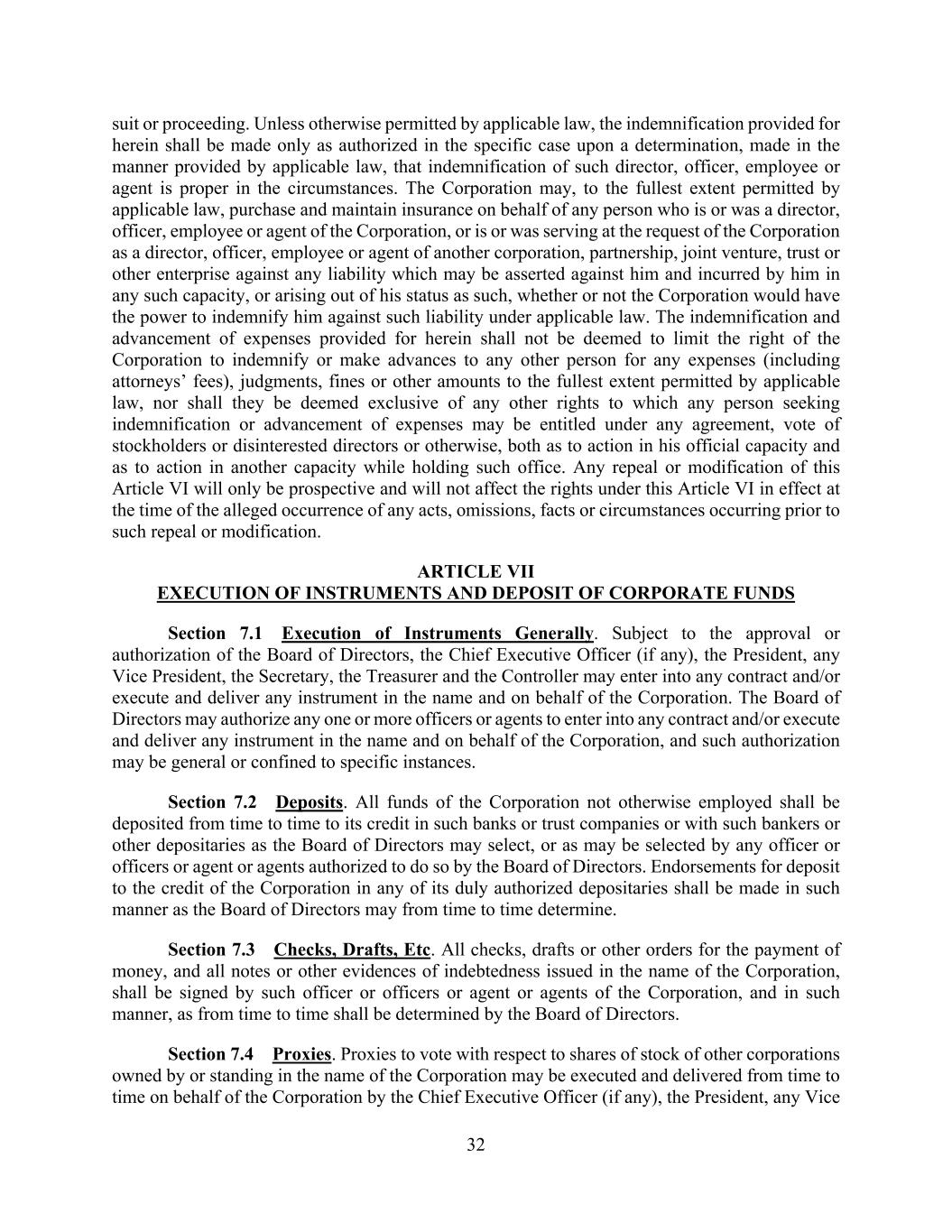 32 suit or proceeding. Unless otherwise permitted by applicable law, the indemnification provided for herein shall be made only as authorized in the specific case upon a determination, made in the manner provided by applicable law, that indemnification of such director, officer, employee or agent is proper in the circumstances. The Corporation may, to the fullest extent permitted by applicable law, purchase and maintain insurance on behalf of any person who is or was a director, officer, employee or agent of the Corporation, or is or was serving at the request of the Corporation as a director, officer, employee or agent of another corporation, partnership, joint venture, trust or other enterprise against any liability which may be asserted against him and incurred by him in any such capacity, or arising out of his status as such, whether or not the Corporation would have the power to indemnify him against such liability under applicable law. The indemnification and advancement of expenses provided for herein shall not be deemed to limit the right of the Corporation to indemnify or make advances to any other person for any expenses (including attorneys’ fees), judgments, fines or other amounts to the fullest extent permitted by applicable law, nor shall they be deemed exclusive of any other rights to which any person seeking indemnification or advancement of expenses may be entitled under any agreement, vote of stockholders or disinterested directors or otherwise, both as to action in his official capacity and as to action in another capacity while holding such office. Any repeal or modification of this Article VI will only be prospective and will not affect the rights under this Article VI in effect at the time of the alleged occurrence of any acts, omissions, facts or circumstances occurring prior to such repeal or modification. ARTICLE VII EXECUTION OF INSTRUMENTS AND DEPOSIT OF CORPORATE FUNDS Section 7.1 Execution of Instruments Generally. Subject to the approval or authorization of the Board of Directors, the Chief Executive Officer (if any), the President, any Vice President, the Secretary, the Treasurer and the Controller may enter into any contract and/or execute and deliver any instrument in the name and on behalf of the Corporation. The Board of Directors may authorize any one or more officers or agents to enter into any contract and/or execute and deliver any instrument in the name and on behalf of the Corporation, and such authorization may be general or confined to specific instances. Section 7.2 Deposits. All funds of the Corporation not otherwise employed shall be deposited from time to time to its credit in such banks or trust companies or with such bankers or other depositaries as the Board of Directors may select, or as may be selected by any officer or officers or agent or agents authorized to do so by the Board of Directors. Endorsements for deposit to the credit of the Corporation in any of its duly authorized depositaries shall be made in such manner as the Board of Directors may from time to time determine. Section 7.3 Checks, Drafts, Etc. All checks, drafts or other orders for the payment of money, and all notes or other evidences of indebtedness issued in the name of the Corporation, shall be signed by such officer or officers or agent or agents of the Corporation, and in such manner, as from time to time shall be determined by the Board of Directors. Section 7.4 Proxies. Proxies to vote with respect to shares of stock of other corporations owned by or standing in the name of the Corporation may be executed and delivered from time to time on behalf of the Corporation by the Chief Executive Officer (if any), the President, any Vice