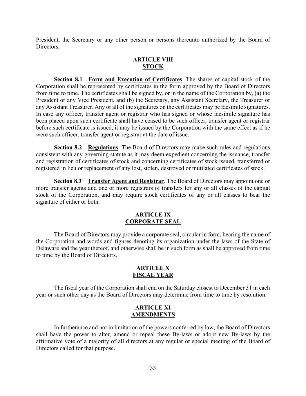 33 President, the Secretary or any other person or persons thereunto authorized by the Board of Directors. ARTICLE VIII STOCK Section 8.1 Form and Execution of Certificates. The shares of capital stock of the Corporation shall be represented by certificates in the form approved by the Board of Directors from time to time. The certificates shall be signed by, or in the name of the Corporation by, (a) the President or any Vice President, and (b) the Secretary, any Assistant Secretary, the Treasurer or any Assistant Treasurer. Any or all of the signatures on the certificates may be facsimile signatures. In case any officer, transfer agent or registrar who has signed or whose facsimile signature has been placed upon such certificate shall have ceased to be such officer, transfer agent or registrar before such certificate is issued, it may be issued by the Corporation with the same effect as if he were such officer, transfer agent or registrar at the date of issue. Section 8.2 Regulations. The Board of Directors may make such rules and regulations consistent with any governing statute as it may deem expedient concerning the issuance, transfer and registration of certificates of stock and concerning certificates of stock issued, transferred or registered in lieu or replacement of any lost, stolen, destroyed or mutilated certificates of stock. Section 8.3 Transfer Agent and Registrar. The Board of Directors may appoint one or more transfer agents and one or more registrars of transfers for any or all classes of the capital stock of the Corporation, and may require stock certificates of any or all classes to bear the signature of either or both. ARTICLE IX CORPORATE SEAL The Board of Directors may provide a corporate seal, circular in form, bearing the name of the Corporation and words and figures denoting its organization under the laws of the State of Delaware and the year thereof, and otherwise shall be in such form as shall be approved from time to time by the Board of Directors. ARTICLE X FISCAL YEAR The fiscal year of the Corporation shall end on the Saturday closest to December 31 in each year or such other day as the Board of Directors may determine from time to time by resolution. ARTICLE XI AMENDMENTS In furtherance and not in limitation of the powers conferred by law, the Board of Directors shall have the power to alter, amend or repeal these By-laws or adopt new By-laws by the affirmative vote of a majority of all directors at any regular or special meeting of the Board of Directors called for that purpose.