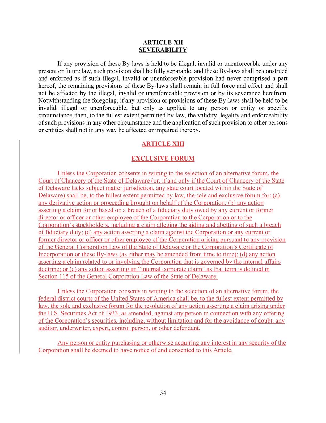 34 ARTICLE XII SEVERABILITY If any provision of these By-laws is held to be illegal, invalid or unenforceable under any present or future law, such provision shall be fully separable, and these By-laws shall be construed and enforced as if such illegal, invalid or unenforceable provision had never comprised a part hereof, the remaining provisions of these By-laws shall remain in full force and effect and shall not be affected by the illegal, invalid or unenforceable provision or by its severance herefrom. Notwithstanding the foregoing, if any provision or provisions of these By-laws shall be held to be invalid, illegal or unenforceable, but only as applied to any person or entity or specific circumstance, then, to the fullest extent permitted by law, the validity, legality and enforceability of such provisions in any other circumstance and the application of such provision to other persons or entities shall not in any way be affected or impaired thereby. ARTICLE XIII EXCLUSIVE FORUM Unless the Corporation consents in writing to the selection of an alternative forum, the Court of Chancery of the State of Delaware (or, if and only if the Court of Chancery of the State of Delaware lacks subject matter jurisdiction, any state court located within the State of Delaware) shall be, to the fullest extent permitted by law, the sole and exclusive forum for: (a) any derivative action or proceeding brought on behalf of the Corporation; (b) any action asserting a claim for or based on a breach of a fiduciary duty owed by any current or former director or officer or other employee of the Corporation to the Corporation or to the Corporation’s stockholders, including a claim alleging the aiding and abetting of such a breach of fiduciary duty; (c) any action asserting a claim against the Corporation or any current or former director or officer or other employee of the Corporation arising pursuant to any provision of the General Corporation Law of the State of Delaware or the Corporation’s Certificate of Incorporation or these By-laws (as either may be amended from time to time); (d) any action asserting a claim related to or involving the Corporation that is governed by the internal affairs doctrine; or (e) any action asserting an “internal corporate claim” as that term is defined in Section 115 of the General Corporation Law of the State of Delaware. Unless the Corporation consents in writing to the selection of an alternative forum, the federal district courts of the United States of America shall be, to the fullest extent permitted by law, the sole and exclusive forum for the resolution of any action asserting a claim arising under the U.S. Securities Act of 1933, as amended, against any person in connection with any offering of the Corporation’s securities, including, without limitation and for the avoidance of doubt, any auditor, underwriter, expert, control person, or other defendant. Any person or entity purchasing or otherwise acquiring any interest in any security of the Corporation shall be deemed to have notice of and consented to this Article.