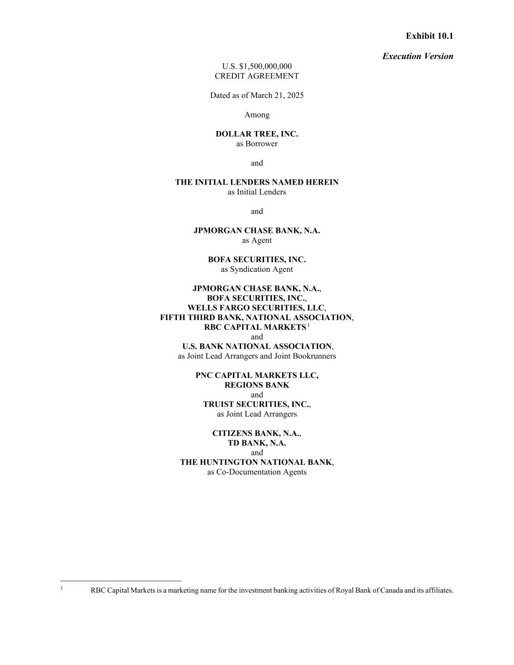 Exhibit 10.1 Execution Version U.S. $1,500,000,000 CREDIT AGREEMENT Dated as of March 21, 2025 Among DOLLAR TREE, INC. as Borrower and THE INITIAL LENDERS NAMED HEREIN as Initial Lenders and JPMORGAN CHASE BANK, N.A. as Agent BOFA SECURITIES, INC. as Syndication Agent JPMORGAN CHASE BANK, N.A., BOFA SECURITIES, INC., WELLS FARGO SECURITIES, LLC, FIFTH THIRD BANK, NATIONAL ASSOCIATION, RBC CAPITAL MARKETS0F 1 and U.S. BANK NATIONAL ASSOCIATION, as Joint Lead Arrangers and Joint Bookrunners PNC CAPITAL MARKETS LLC, REGIONS BANK and TRUIST SECURITIES, INC., as Joint Lead Arrangers CITIZENS BANK, N.A., TD BANK, N.A. and THE HUNTINGTON NATIONAL BANK, as Co-Documentation Agents 1 RBC Capital Markets is a marketing name for the investment banking activities of Royal Bank of Canada and its affiliates.