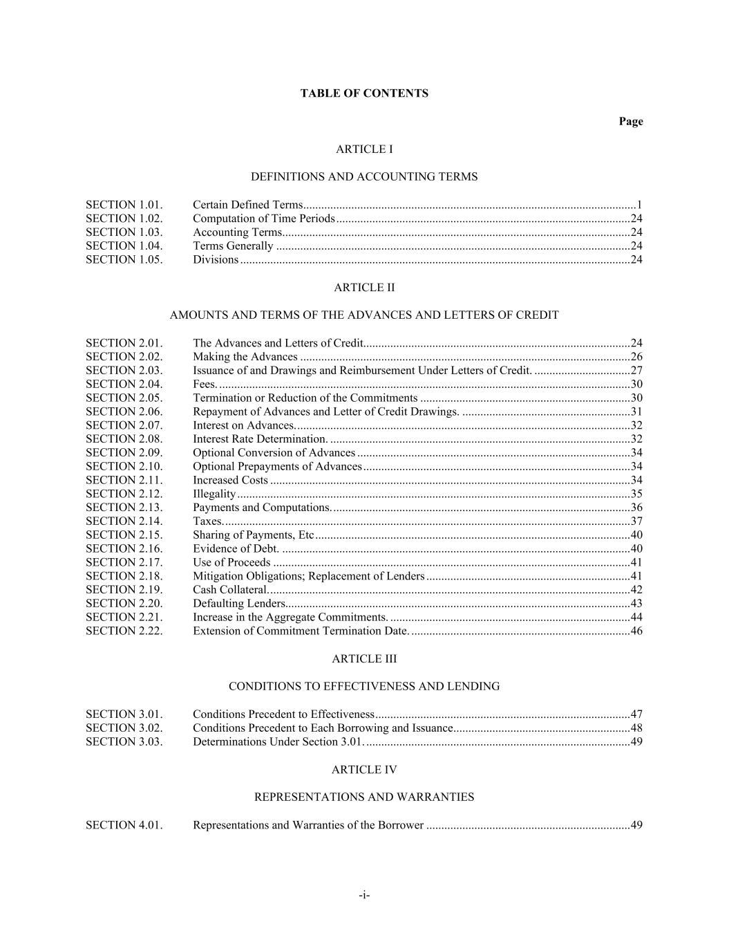 -i- TABLE OF CONTENTS Page ARTICLE I DEFINITIONS AND ACCOUNTING TERMS SECTION 1.01. Certain Defined Terms ............................................................................................................... 1 SECTION 1.02. Computation of Time Periods .................................................................................................. 24 SECTION 1.03. Accounting Terms .................................................................................................................... 24 SECTION 1.04. Terms Generally ...................................................................................................................... 24 SECTION 1.05. Divisions .................................................................................................................................. 24 ARTICLE II AMOUNTS AND TERMS OF THE ADVANCES AND LETTERS OF CREDIT SECTION 2.01. The Advances and Letters of Credit......................................................................................... 24 SECTION 2.02. Making the Advances .............................................................................................................. 26 SECTION 2.03. Issuance of and Drawings and Reimbursement Under Letters of Credit. ................................ 27 SECTION 2.04. Fees. ......................................................................................................................................... 30 SECTION 2.05. Termination or Reduction of the Commitments ...................................................................... 30 SECTION 2.06. Repayment of Advances and Letter of Credit Drawings. ........................................................ 31 SECTION 2.07. Interest on Advances. ............................................................................................................... 32 SECTION 2.08. Interest Rate Determination. .................................................................................................... 32 SECTION 2.09. Optional Conversion of Advances ........................................................................................... 34 SECTION 2.10. Optional Prepayments of Advances ......................................................................................... 34 SECTION 2.11. Increased Costs ........................................................................................................................ 34 SECTION 2.12. Illegality ................................................................................................................................... 35 SECTION 2.13. Payments and Computations. ................................................................................................... 36 SECTION 2.14. Taxes. ....................................................................................................................................... 37 SECTION 2.15. Sharing of Payments, Etc ......................................................................................................... 40 SECTION 2.16. Evidence of Debt. .................................................................................................................... 40 SECTION 2.17. Use of Proceeds ....................................................................................................................... 41 SECTION 2.18. Mitigation Obligations; Replacement of Lenders .................................................................... 41 SECTION 2.19. Cash Collateral. ........................................................................................................................ 42 SECTION 2.20. Defaulting Lenders................................................................................................................... 43 SECTION 2.21. Increase in the Aggregate Commitments. ................................................................................ 44 SECTION 2.22. Extension of Commitment Termination Date. ......................................................................... 46 ARTICLE III CONDITIONS TO EFFECTIVENESS AND LENDING SECTION 3.01. Conditions Precedent to Effectiveness ..................................................................................... 47 SECTION 3.02. Conditions Precedent to Each Borrowing and Issuance ........................................................... 48 SECTION 3.03. Determinations Under Section 3.01. ........................................................................................ 49 ARTICLE IV REPRESENTATIONS AND WARRANTIES SECTION 4.01. Representations and Warranties of the Borrower .................................................................... 49