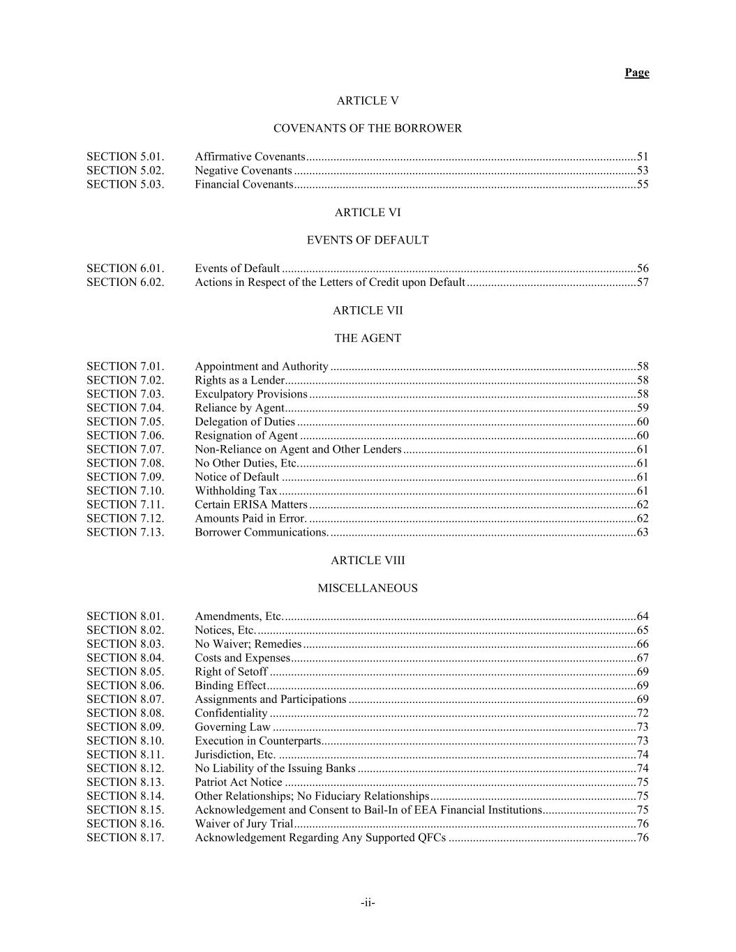Page -ii- ARTICLE V COVENANTS OF THE BORROWER SECTION 5.01. Affirmative Covenants ............................................................................................................. 51 SECTION 5.02. Negative Covenants ................................................................................................................. 53 SECTION 5.03. Financial Covenants ................................................................................................................. 55 ARTICLE VI EVENTS OF DEFAULT SECTION 6.01. Events of Default ..................................................................................................................... 56 SECTION 6.02. Actions in Respect of the Letters of Credit upon Default ........................................................ 57 ARTICLE VII THE AGENT SECTION 7.01. Appointment and Authority ..................................................................................................... 58 SECTION 7.02. Rights as a Lender .................................................................................................................... 58 SECTION 7.03. Exculpatory Provisions ............................................................................................................ 58 SECTION 7.04. Reliance by Agent .................................................................................................................... 59 SECTION 7.05. Delegation of Duties ................................................................................................................ 60 SECTION 7.06. Resignation of Agent ............................................................................................................... 60 SECTION 7.07. Non-Reliance on Agent and Other Lenders ............................................................................. 61 SECTION 7.08. No Other Duties, Etc. ............................................................................................................... 61 SECTION 7.09. Notice of Default ..................................................................................................................... 61 SECTION 7.10. Withholding Tax ...................................................................................................................... 61 SECTION 7.11. Certain ERISA Matters ............................................................................................................ 62 SECTION 7.12. Amounts Paid in Error. ............................................................................................................ 62 SECTION 7.13. Borrower Communications. ..................................................................................................... 63 ARTICLE VIII MISCELLANEOUS SECTION 8.01. Amendments, Etc. .................................................................................................................... 64 SECTION 8.02. Notices, Etc. ............................................................................................................................. 65 SECTION 8.03. No Waiver; Remedies .............................................................................................................. 66 SECTION 8.04. Costs and Expenses .................................................................................................................. 67 SECTION 8.05. Right of Setoff ......................................................................................................................... 69 SECTION 8.06. Binding Effect .......................................................................................................................... 69 SECTION 8.07. Assignments and Participations ............................................................................................... 69 SECTION 8.08. Confidentiality ......................................................................................................................... 72 SECTION 8.09. Governing Law ........................................................................................................................ 73 SECTION 8.10. Execution in Counterparts ........................................................................................................ 73 SECTION 8.11. Jurisdiction, Etc. ...................................................................................................................... 74 SECTION 8.12. No Liability of the Issuing Banks ............................................................................................ 74 SECTION 8.13. Patriot Act Notice .................................................................................................................... 75 SECTION 8.14. Other Relationships; No Fiduciary Relationships .................................................................... 75 SECTION 8.15. Acknowledgement and Consent to Bail-In of EEA Financial Institutions ............................... 75 SECTION 8.16. Waiver of Jury Trial ................................................................................................................. 76 SECTION 8.17. Acknowledgement Regarding Any Supported QFCs .............................................................. 76