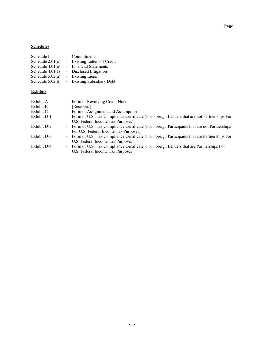 Page -iii- Schedules Schedule I - Commitments Schedule 2.01(c) - Existing Letters of Credit Schedule 4.01(e) - Financial Statements Schedule 4.01(f) - Disclosed Litigation Schedule 5.02(a) - Existing Liens Schedule 5.02(d) - Existing Subsidiary Debt Exhibits Exhibit A - Form of Revolving Credit Note Exhibit B - [Reserved] Exhibit C - Form of Assignment and Assumption Exhibit D-1 - Form of U.S. Tax Compliance Certificate (For Foreign Lenders that are not Partnerships For U.S. Federal Income Tax Purposes) Exhibit D-2 - Form of U.S. Tax Compliance Certificate (For Foreign Participants that are not Partnerships For U.S. Federal Income Tax Purposes) Exhibit D-3 - Form of U.S. Tax Compliance Certificate (For Foreign Participants that are Partnerships For U.S. Federal Income Tax Purposes) Exhibit D-4 - Form of U.S. Tax Compliance Certificate (For Foreign Lenders that are Partnerships For U.S. Federal Income Tax Purposes)