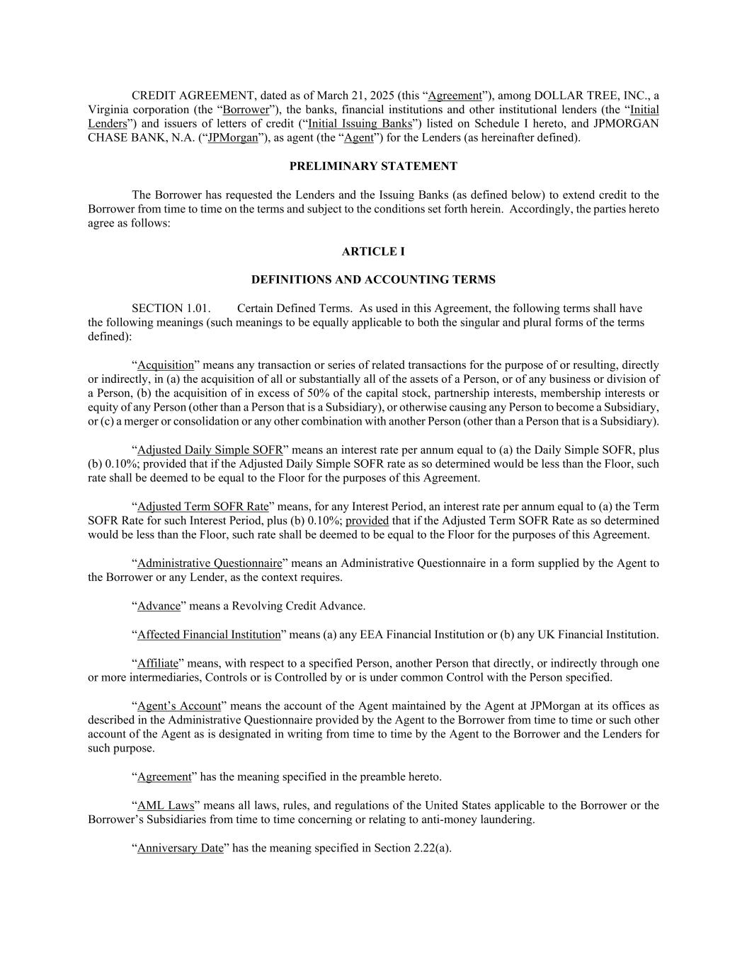CREDIT AGREEMENT, dated as of March 21, 2025 (this “Agreement”), among DOLLAR TREE, INC., a Virginia corporation (the “Borrower”), the banks, financial institutions and other institutional lenders (the “Initial Lenders”) and issuers of letters of credit (“Initial Issuing Banks”) listed on Schedule I hereto, and JPMORGAN CHASE BANK, N.A. (“JPMorgan”), as agent (the “Agent”) for the Lenders (as hereinafter defined). PRELIMINARY STATEMENT The Borrower has requested the Lenders and the Issuing Banks (as defined below) to extend credit to the Borrower from time to time on the terms and subject to the conditions set forth herein. Accordingly, the parties hereto agree as follows: ARTICLE I DEFINITIONS AND ACCOUNTING TERMS SECTION 1.01. Certain Defined Terms. As used in this Agreement, the following terms shall have the following meanings (such meanings to be equally applicable to both the singular and plural forms of the terms defined): “Acquisition” means any transaction or series of related transactions for the purpose of or resulting, directly or indirectly, in (a) the acquisition of all or substantially all of the assets of a Person, or of any business or division of a Person, (b) the acquisition of in excess of 50% of the capital stock, partnership interests, membership interests or equity of any Person (other than a Person that is a Subsidiary), or otherwise causing any Person to become a Subsidiary, or (c) a merger or consolidation or any other combination with another Person (other than a Person that is a Subsidiary). “Adjusted Daily Simple SOFR” means an interest rate per annum equal to (a) the Daily Simple SOFR, plus (b) 0.10%; provided that if the Adjusted Daily Simple SOFR rate as so determined would be less than the Floor, such rate shall be deemed to be equal to the Floor for the purposes of this Agreement. “Adjusted Term SOFR Rate” means, for any Interest Period, an interest rate per annum equal to (a) the Term SOFR Rate for such Interest Period, plus (b) 0.10%; provided that if the Adjusted Term SOFR Rate as so determined would be less than the Floor, such rate shall be deemed to be equal to the Floor for the purposes of this Agreement. “Administrative Questionnaire” means an Administrative Questionnaire in a form supplied by the Agent to the Borrower or any Lender, as the context requires. “Advance” means a Revolving Credit Advance. “Affected Financial Institution” means (a) any EEA Financial Institution or (b) any UK Financial Institution. “Affiliate” means, with respect to a specified Person, another Person that directly, or indirectly through one or more intermediaries, Controls or is Controlled by or is under common Control with the Person specified. “Agent’s Account” means the account of the Agent maintained by the Agent at JPMorgan at its offices as described in the Administrative Questionnaire provided by the Agent to the Borrower from time to time or such other account of the Agent as is designated in writing from time to time by the Agent to the Borrower and the Lenders for such purpose. “Agreement” has the meaning specified in the preamble hereto. “AML Laws” means all laws, rules, and regulations of the United States applicable to the Borrower or the Borrower’s Subsidiaries from time to time concerning or relating to anti-money laundering. “Anniversary Date” has the meaning specified in Section 2.22(a).