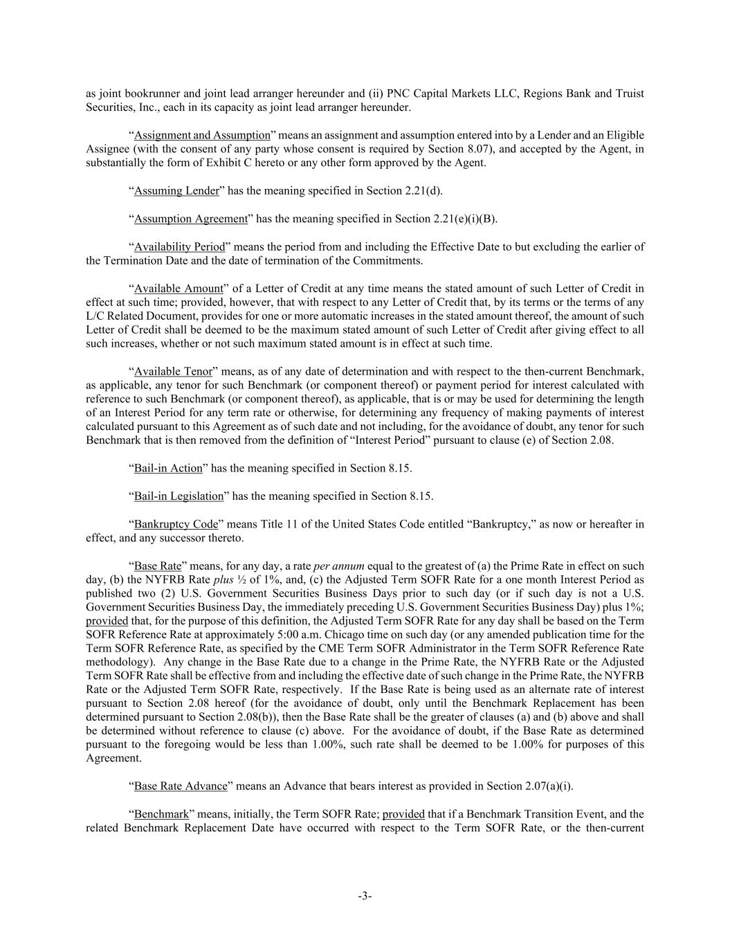 -3- as joint bookrunner and joint lead arranger hereunder and (ii) PNC Capital Markets LLC, Regions Bank and Truist Securities, Inc., each in its capacity as joint lead arranger hereunder. “Assignment and Assumption” means an assignment and assumption entered into by a Lender and an Eligible Assignee (with the consent of any party whose consent is required by Section 8.07), and accepted by the Agent, in substantially the form of Exhibit C hereto or any other form approved by the Agent. “Assuming Lender” has the meaning specified in Section 2.21(d). “Assumption Agreement” has the meaning specified in Section 2.21(e)(i)(B). “Availability Period” means the period from and including the Effective Date to but excluding the earlier of the Termination Date and the date of termination of the Commitments. “Available Amount” of a Letter of Credit at any time means the stated amount of such Letter of Credit in effect at such time; provided, however, that with respect to any Letter of Credit that, by its terms or the terms of any L/C Related Document, provides for one or more automatic increases in the stated amount thereof, the amount of such Letter of Credit shall be deemed to be the maximum stated amount of such Letter of Credit after giving effect to all such increases, whether or not such maximum stated amount is in effect at such time. “Available Tenor” means, as of any date of determination and with respect to the then-current Benchmark, as applicable, any tenor for such Benchmark (or component thereof) or payment period for interest calculated with reference to such Benchmark (or component thereof), as applicable, that is or may be used for determining the length of an Interest Period for any term rate or otherwise, for determining any frequency of making payments of interest calculated pursuant to this Agreement as of such date and not including, for the avoidance of doubt, any tenor for such Benchmark that is then removed from the definition of “Interest Period” pursuant to clause (e) of Section 2.08. “Bail-in Action” has the meaning specified in Section 8.15. “Bail-in Legislation” has the meaning specified in Section 8.15. “Bankruptcy Code” means Title 11 of the United States Code entitled “Bankruptcy,” as now or hereafter in effect, and any successor thereto. “Base Rate” means, for any day, a rate per annum equal to the greatest of (a) the Prime Rate in effect on such day, (b) the NYFRB Rate plus ½ of 1%, and, (c) the Adjusted Term SOFR Rate for a one month Interest Period as published two (2) U.S. Government Securities Business Days prior to such day (or if such day is not a U.S. Government Securities Business Day, the immediately preceding U.S. Government Securities Business Day) plus 1%; provided that, for the purpose of this definition, the Adjusted Term SOFR Rate for any day shall be based on the Term SOFR Reference Rate at approximately 5:00 a.m. Chicago time on such day (or any amended publication time for the Term SOFR Reference Rate, as specified by the CME Term SOFR Administrator in the Term SOFR Reference Rate methodology). Any change in the Base Rate due to a change in the Prime Rate, the NYFRB Rate or the Adjusted Term SOFR Rate shall be effective from and including the effective date of such change in the Prime Rate, the NYFRB Rate or the Adjusted Term SOFR Rate, respectively. If the Base Rate is being used as an alternate rate of interest pursuant to Section 2.08 hereof (for the avoidance of doubt, only until the Benchmark Replacement has been determined pursuant to Section 2.08(b)), then the Base Rate shall be the greater of clauses (a) and (b) above and shall be determined without reference to clause (c) above. For the avoidance of doubt, if the Base Rate as determined pursuant to the foregoing would be less than 1.00%, such rate shall be deemed to be 1.00% for purposes of this Agreement. “Base Rate Advance” means an Advance that bears interest as provided in Section 2.07(a)(i). “Benchmark” means, initially, the Term SOFR Rate; provided that if a Benchmark Transition Event, and the related Benchmark Replacement Date have occurred with respect to the Term SOFR Rate, or the then-current