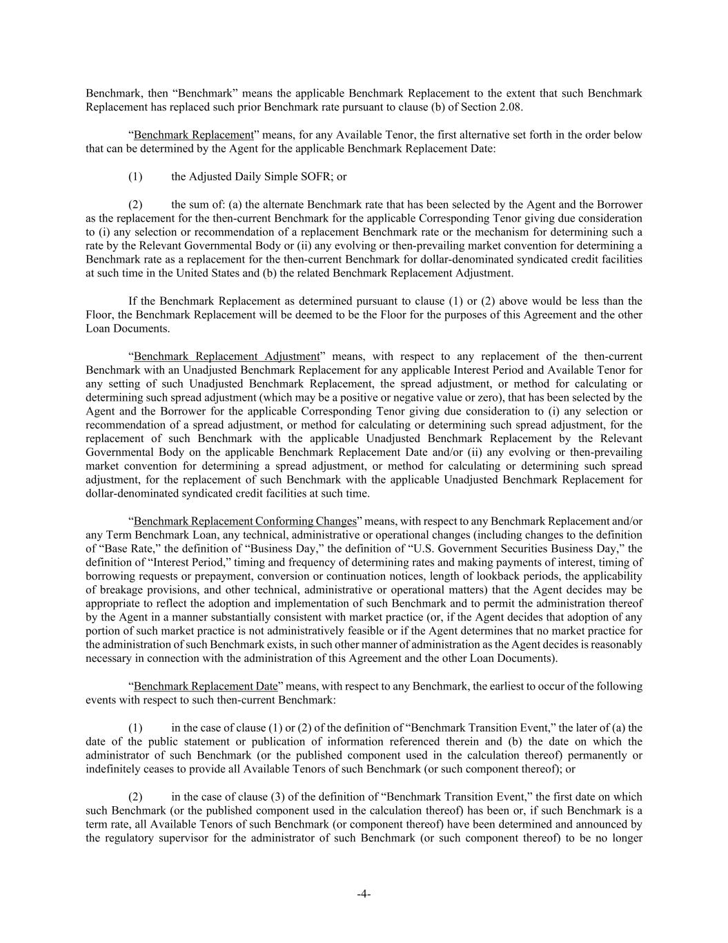 -4- Benchmark, then “Benchmark” means the applicable Benchmark Replacement to the extent that such Benchmark Replacement has replaced such prior Benchmark rate pursuant to clause (b) of Section 2.08. “Benchmark Replacement” means, for any Available Tenor, the first alternative set forth in the order below that can be determined by the Agent for the applicable Benchmark Replacement Date: (1) the Adjusted Daily Simple SOFR; or (2) the sum of: (a) the alternate Benchmark rate that has been selected by the Agent and the Borrower as the replacement for the then-current Benchmark for the applicable Corresponding Tenor giving due consideration to (i) any selection or recommendation of a replacement Benchmark rate or the mechanism for determining such a rate by the Relevant Governmental Body or (ii) any evolving or then-prevailing market convention for determining a Benchmark rate as a replacement for the then-current Benchmark for dollar-denominated syndicated credit facilities at such time in the United States and (b) the related Benchmark Replacement Adjustment. If the Benchmark Replacement as determined pursuant to clause (1) or (2) above would be less than the Floor, the Benchmark Replacement will be deemed to be the Floor for the purposes of this Agreement and the other Loan Documents. “Benchmark Replacement Adjustment” means, with respect to any replacement of the then-current Benchmark with an Unadjusted Benchmark Replacement for any applicable Interest Period and Available Tenor for any setting of such Unadjusted Benchmark Replacement, the spread adjustment, or method for calculating or determining such spread adjustment (which may be a positive or negative value or zero), that has been selected by the Agent and the Borrower for the applicable Corresponding Tenor giving due consideration to (i) any selection or recommendation of a spread adjustment, or method for calculating or determining such spread adjustment, for the replacement of such Benchmark with the applicable Unadjusted Benchmark Replacement by the Relevant Governmental Body on the applicable Benchmark Replacement Date and/or (ii) any evolving or then-prevailing market convention for determining a spread adjustment, or method for calculating or determining such spread adjustment, for the replacement of such Benchmark with the applicable Unadjusted Benchmark Replacement for dollar-denominated syndicated credit facilities at such time. “Benchmark Replacement Conforming Changes” means, with respect to any Benchmark Replacement and/or any Term Benchmark Loan, any technical, administrative or operational changes (including changes to the definition of “Base Rate,” the definition of “Business Day,” the definition of “U.S. Government Securities Business Day,” the definition of “Interest Period,” timing and frequency of determining rates and making payments of interest, timing of borrowing requests or prepayment, conversion or continuation notices, length of lookback periods, the applicability of breakage provisions, and other technical, administrative or operational matters) that the Agent decides may be appropriate to reflect the adoption and implementation of such Benchmark and to permit the administration thereof by the Agent in a manner substantially consistent with market practice (or, if the Agent decides that adoption of any portion of such market practice is not administratively feasible or if the Agent determines that no market practice for the administration of such Benchmark exists, in such other manner of administration as the Agent decides is reasonably necessary in connection with the administration of this Agreement and the other Loan Documents). “Benchmark Replacement Date” means, with respect to any Benchmark, the earliest to occur of the following events with respect to such then-current Benchmark: (1) in the case of clause (1) or (2) of the definition of “Benchmark Transition Event,” the later of (a) the date of the public statement or publication of information referenced therein and (b) the date on which the administrator of such Benchmark (or the published component used in the calculation thereof) permanently or indefinitely ceases to provide all Available Tenors of such Benchmark (or such component thereof); or (2) in the case of clause (3) of the definition of “Benchmark Transition Event,” the first date on which such Benchmark (or the published component used in the calculation thereof) has been or, if such Benchmark is a term rate, all Available Tenors of such Benchmark (or component thereof) have been determined and announced by the regulatory supervisor for the administrator of such Benchmark (or such component thereof) to be no longer