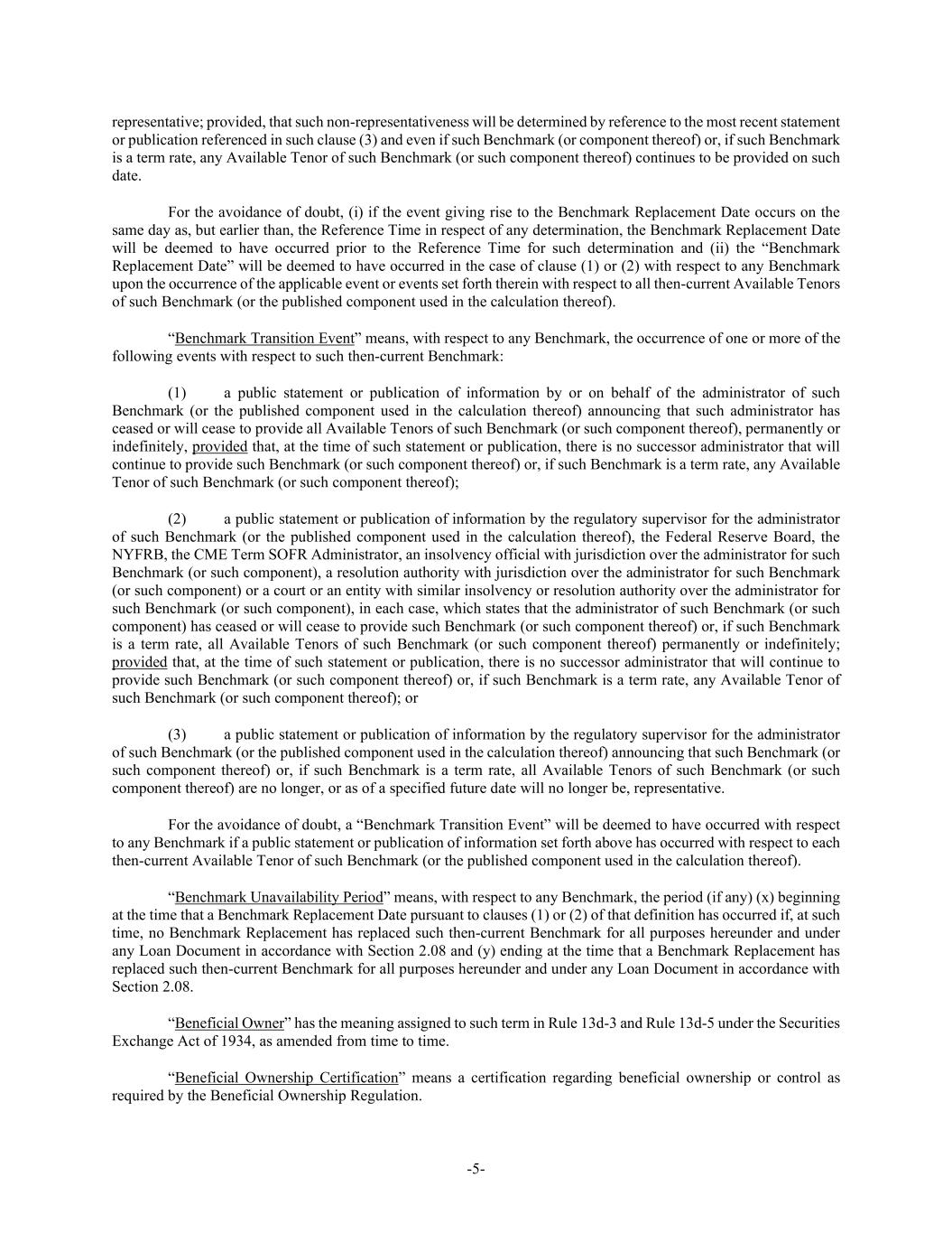 -5- representative; provided, that such non-representativeness will be determined by reference to the most recent statement or publication referenced in such clause (3) and even if such Benchmark (or component thereof) or, if such Benchmark is a term rate, any Available Tenor of such Benchmark (or such component thereof) continues to be provided on such date. For the avoidance of doubt, (i) if the event giving rise to the Benchmark Replacement Date occurs on the same day as, but earlier than, the Reference Time in respect of any determination, the Benchmark Replacement Date will be deemed to have occurred prior to the Reference Time for such determination and (ii) the “Benchmark Replacement Date” will be deemed to have occurred in the case of clause (1) or (2) with respect to any Benchmark upon the occurrence of the applicable event or events set forth therein with respect to all then-current Available Tenors of such Benchmark (or the published component used in the calculation thereof). “Benchmark Transition Event” means, with respect to any Benchmark, the occurrence of one or more of the following events with respect to such then-current Benchmark: (1) a public statement or publication of information by or on behalf of the administrator of such Benchmark (or the published component used in the calculation thereof) announcing that such administrator has ceased or will cease to provide all Available Tenors of such Benchmark (or such component thereof), permanently or indefinitely, provided that, at the time of such statement or publication, there is no successor administrator that will continue to provide such Benchmark (or such component thereof) or, if such Benchmark is a term rate, any Available Tenor of such Benchmark (or such component thereof); (2) a public statement or publication of information by the regulatory supervisor for the administrator of such Benchmark (or the published component used in the calculation thereof), the Federal Reserve Board, the NYFRB, the CME Term SOFR Administrator, an insolvency official with jurisdiction over the administrator for such Benchmark (or such component), a resolution authority with jurisdiction over the administrator for such Benchmark (or such component) or a court or an entity with similar insolvency or resolution authority over the administrator for such Benchmark (or such component), in each case, which states that the administrator of such Benchmark (or such component) has ceased or will cease to provide such Benchmark (or such component thereof) or, if such Benchmark is a term rate, all Available Tenors of such Benchmark (or such component thereof) permanently or indefinitely; provided that, at the time of such statement or publication, there is no successor administrator that will continue to provide such Benchmark (or such component thereof) or, if such Benchmark is a term rate, any Available Tenor of such Benchmark (or such component thereof); or (3) a public statement or publication of information by the regulatory supervisor for the administrator of such Benchmark (or the published component used in the calculation thereof) announcing that such Benchmark (or such component thereof) or, if such Benchmark is a term rate, all Available Tenors of such Benchmark (or such component thereof) are no longer, or as of a specified future date will no longer be, representative. For the avoidance of doubt, a “Benchmark Transition Event” will be deemed to have occurred with respect to any Benchmark if a public statement or publication of information set forth above has occurred with respect to each then-current Available Tenor of such Benchmark (or the published component used in the calculation thereof). “Benchmark Unavailability Period” means, with respect to any Benchmark, the period (if any) (x) beginning at the time that a Benchmark Replacement Date pursuant to clauses (1) or (2) of that definition has occurred if, at such time, no Benchmark Replacement has replaced such then-current Benchmark for all purposes hereunder and under any Loan Document in accordance with Section 2.08 and (y) ending at the time that a Benchmark Replacement has replaced such then-current Benchmark for all purposes hereunder and under any Loan Document in accordance with Section 2.08. “Beneficial Owner” has the meaning assigned to such term in Rule 13d-3 and Rule 13d-5 under the Securities Exchange Act of 1934, as amended from time to time. “Beneficial Ownership Certification” means a certification regarding beneficial ownership or control as required by the Beneficial Ownership Regulation.