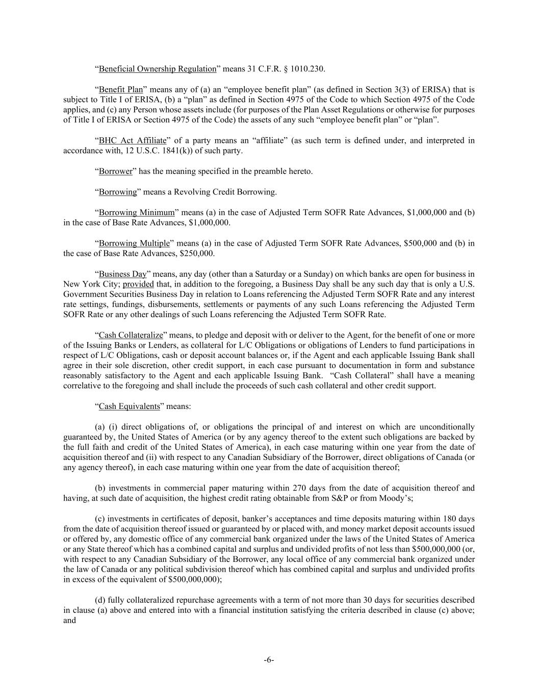 -6- “Beneficial Ownership Regulation” means 31 C.F.R. § 1010.230. “Benefit Plan” means any of (a) an “employee benefit plan” (as defined in Section 3(3) of ERISA) that is subject to Title I of ERISA, (b) a “plan” as defined in Section 4975 of the Code to which Section 4975 of the Code applies, and (c) any Person whose assets include (for purposes of the Plan Asset Regulations or otherwise for purposes of Title I of ERISA or Section 4975 of the Code) the assets of any such “employee benefit plan” or “plan”. “BHC Act Affiliate” of a party means an “affiliate” (as such term is defined under, and interpreted in accordance with, 12 U.S.C. 1841(k)) of such party. “Borrower” has the meaning specified in the preamble hereto. “Borrowing” means a Revolving Credit Borrowing. “Borrowing Minimum” means (a) in the case of Adjusted Term SOFR Rate Advances, $1,000,000 and (b) in the case of Base Rate Advances, $1,000,000. “Borrowing Multiple” means (a) in the case of Adjusted Term SOFR Rate Advances, $500,000 and (b) in the case of Base Rate Advances, $250,000. “Business Day” means, any day (other than a Saturday or a Sunday) on which banks are open for business in New York City; provided that, in addition to the foregoing, a Business Day shall be any such day that is only a U.S. Government Securities Business Day in relation to Loans referencing the Adjusted Term SOFR Rate and any interest rate settings, fundings, disbursements, settlements or payments of any such Loans referencing the Adjusted Term SOFR Rate or any other dealings of such Loans referencing the Adjusted Term SOFR Rate. “Cash Collateralize” means, to pledge and deposit with or deliver to the Agent, for the benefit of one or more of the Issuing Banks or Lenders, as collateral for L/C Obligations or obligations of Lenders to fund participations in respect of L/C Obligations, cash or deposit account balances or, if the Agent and each applicable Issuing Bank shall agree in their sole discretion, other credit support, in each case pursuant to documentation in form and substance reasonably satisfactory to the Agent and each applicable Issuing Bank. “Cash Collateral” shall have a meaning correlative to the foregoing and shall include the proceeds of such cash collateral and other credit support. “Cash Equivalents” means: (a) (i) direct obligations of, or obligations the principal of and interest on which are unconditionally guaranteed by, the United States of America (or by any agency thereof to the extent such obligations are backed by the full faith and credit of the United States of America), in each case maturing within one year from the date of acquisition thereof and (ii) with respect to any Canadian Subsidiary of the Borrower, direct obligations of Canada (or any agency thereof), in each case maturing within one year from the date of acquisition thereof; (b) investments in commercial paper maturing within 270 days from the date of acquisition thereof and having, at such date of acquisition, the highest credit rating obtainable from S&P or from Moody’s; (c) investments in certificates of deposit, banker’s acceptances and time deposits maturing within 180 days from the date of acquisition thereof issued or guaranteed by or placed with, and money market deposit accounts issued or offered by, any domestic office of any commercial bank organized under the laws of the United States of America or any State thereof which has a combined capital and surplus and undivided profits of not less than $500,000,000 (or, with respect to any Canadian Subsidiary of the Borrower, any local office of any commercial bank organized under the law of Canada or any political subdivision thereof which has combined capital and surplus and undivided profits in excess of the equivalent of $500,000,000); (d) fully collateralized repurchase agreements with a term of not more than 30 days for securities described in clause (a) above and entered into with a financial institution satisfying the criteria described in clause (c) above; and