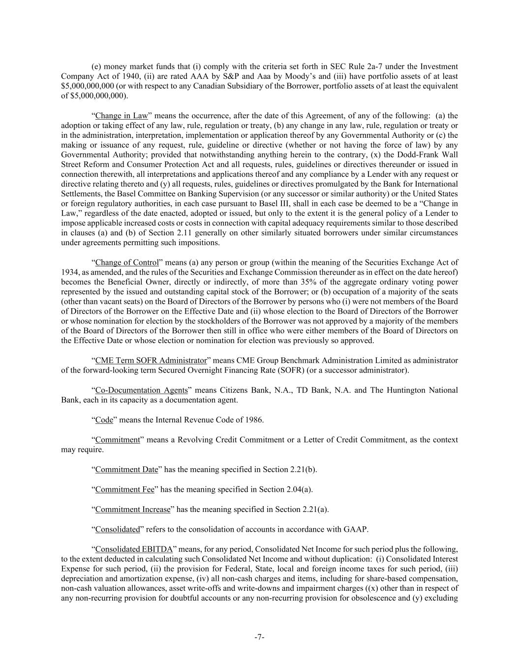 -7- (e) money market funds that (i) comply with the criteria set forth in SEC Rule 2a-7 under the Investment Company Act of 1940, (ii) are rated AAA by S&P and Aaa by Moody’s and (iii) have portfolio assets of at least $5,000,000,000 (or with respect to any Canadian Subsidiary of the Borrower, portfolio assets of at least the equivalent of $5,000,000,000). “Change in Law” means the occurrence, after the date of this Agreement, of any of the following: (a) the adoption or taking effect of any law, rule, regulation or treaty, (b) any change in any law, rule, regulation or treaty or in the administration, interpretation, implementation or application thereof by any Governmental Authority or (c) the making or issuance of any request, rule, guideline or directive (whether or not having the force of law) by any Governmental Authority; provided that notwithstanding anything herein to the contrary, (x) the Dodd-Frank Wall Street Reform and Consumer Protection Act and all requests, rules, guidelines or directives thereunder or issued in connection therewith, all interpretations and applications thereof and any compliance by a Lender with any request or directive relating thereto and (y) all requests, rules, guidelines or directives promulgated by the Bank for International Settlements, the Basel Committee on Banking Supervision (or any successor or similar authority) or the United States or foreign regulatory authorities, in each case pursuant to Basel III, shall in each case be deemed to be a “Change in Law,” regardless of the date enacted, adopted or issued, but only to the extent it is the general policy of a Lender to impose applicable increased costs or costs in connection with capital adequacy requirements similar to those described in clauses (a) and (b) of Section 2.11 generally on other similarly situated borrowers under similar circumstances under agreements permitting such impositions. “Change of Control” means (a) any person or group (within the meaning of the Securities Exchange Act of 1934, as amended, and the rules of the Securities and Exchange Commission thereunder as in effect on the date hereof) becomes the Beneficial Owner, directly or indirectly, of more than 35% of the aggregate ordinary voting power represented by the issued and outstanding capital stock of the Borrower; or (b) occupation of a majority of the seats (other than vacant seats) on the Board of Directors of the Borrower by persons who (i) were not members of the Board of Directors of the Borrower on the Effective Date and (ii) whose election to the Board of Directors of the Borrower or whose nomination for election by the stockholders of the Borrower was not approved by a majority of the members of the Board of Directors of the Borrower then still in office who were either members of the Board of Directors on the Effective Date or whose election or nomination for election was previously so approved. “CME Term SOFR Administrator” means CME Group Benchmark Administration Limited as administrator of the forward-looking term Secured Overnight Financing Rate (SOFR) (or a successor administrator). “Co-Documentation Agents” means Citizens Bank, N.A., TD Bank, N.A. and The Huntington National Bank, each in its capacity as a documentation agent. “Code” means the Internal Revenue Code of 1986. “Commitment” means a Revolving Credit Commitment or a Letter of Credit Commitment, as the context may require. “Commitment Date” has the meaning specified in Section 2.21(b). “Commitment Fee” has the meaning specified in Section 2.04(a). “Commitment Increase” has the meaning specified in Section 2.21(a). “Consolidated” refers to the consolidation of accounts in accordance with GAAP. “Consolidated EBITDA” means, for any period, Consolidated Net Income for such period plus the following, to the extent deducted in calculating such Consolidated Net Income and without duplication: (i) Consolidated Interest Expense for such period, (ii) the provision for Federal, State, local and foreign income taxes for such period, (iii) depreciation and amortization expense, (iv) all non-cash charges and items, including for share-based compensation, non-cash valuation allowances, asset write-offs and write-downs and impairment charges ((x) other than in respect of any non-recurring provision for doubtful accounts or any non-recurring provision for obsolescence and (y) excluding