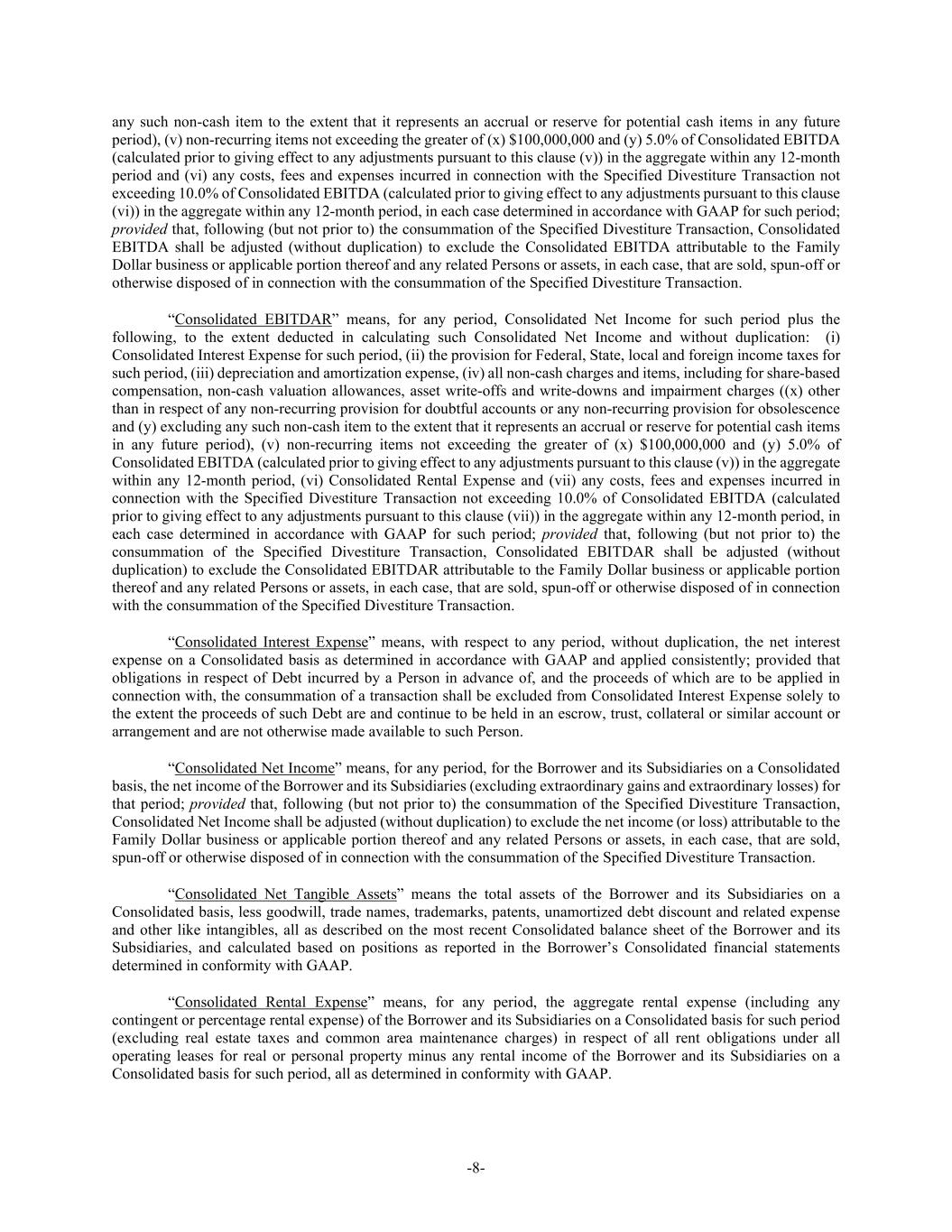 -8- any such non-cash item to the extent that it represents an accrual or reserve for potential cash items in any future period), (v) non-recurring items not exceeding the greater of (x) $100,000,000 and (y) 5.0% of Consolidated EBITDA (calculated prior to giving effect to any adjustments pursuant to this clause (v)) in the aggregate within any 12-month period and (vi) any costs, fees and expenses incurred in connection with the Specified Divestiture Transaction not exceeding 10.0% of Consolidated EBITDA (calculated prior to giving effect to any adjustments pursuant to this clause (vi)) in the aggregate within any 12-month period, in each case determined in accordance with GAAP for such period; provided that, following (but not prior to) the consummation of the Specified Divestiture Transaction, Consolidated EBITDA shall be adjusted (without duplication) to exclude the Consolidated EBITDA attributable to the Family Dollar business or applicable portion thereof and any related Persons or assets, in each case, that are sold, spun-off or otherwise disposed of in connection with the consummation of the Specified Divestiture Transaction. “Consolidated EBITDAR” means, for any period, Consolidated Net Income for such period plus the following, to the extent deducted in calculating such Consolidated Net Income and without duplication: (i) Consolidated Interest Expense for such period, (ii) the provision for Federal, State, local and foreign income taxes for such period, (iii) depreciation and amortization expense, (iv) all non-cash charges and items, including for share-based compensation, non-cash valuation allowances, asset write-offs and write-downs and impairment charges ((x) other than in respect of any non-recurring provision for doubtful accounts or any non-recurring provision for obsolescence and (y) excluding any such non-cash item to the extent that it represents an accrual or reserve for potential cash items in any future period), (v) non-recurring items not exceeding the greater of (x) $100,000,000 and (y) 5.0% of Consolidated EBITDA (calculated prior to giving effect to any adjustments pursuant to this clause (v)) in the aggregate within any 12-month period, (vi) Consolidated Rental Expense and (vii) any costs, fees and expenses incurred in connection with the Specified Divestiture Transaction not exceeding 10.0% of Consolidated EBITDA (calculated prior to giving effect to any adjustments pursuant to this clause (vii)) in the aggregate within any 12-month period, in each case determined in accordance with GAAP for such period; provided that, following (but not prior to) the consummation of the Specified Divestiture Transaction, Consolidated EBITDAR shall be adjusted (without duplication) to exclude the Consolidated EBITDAR attributable to the Family Dollar business or applicable portion thereof and any related Persons or assets, in each case, that are sold, spun-off or otherwise disposed of in connection with the consummation of the Specified Divestiture Transaction. “Consolidated Interest Expense” means, with respect to any period, without duplication, the net interest expense on a Consolidated basis as determined in accordance with GAAP and applied consistently; provided that obligations in respect of Debt incurred by a Person in advance of, and the proceeds of which are to be applied in connection with, the consummation of a transaction shall be excluded from Consolidated Interest Expense solely to the extent the proceeds of such Debt are and continue to be held in an escrow, trust, collateral or similar account or arrangement and are not otherwise made available to such Person. “Consolidated Net Income” means, for any period, for the Borrower and its Subsidiaries on a Consolidated basis, the net income of the Borrower and its Subsidiaries (excluding extraordinary gains and extraordinary losses) for that period; provided that, following (but not prior to) the consummation of the Specified Divestiture Transaction, Consolidated Net Income shall be adjusted (without duplication) to exclude the net income (or loss) attributable to the Family Dollar business or applicable portion thereof and any related Persons or assets, in each case, that are sold, spun-off or otherwise disposed of in connection with the consummation of the Specified Divestiture Transaction. “Consolidated Net Tangible Assets” means the total assets of the Borrower and its Subsidiaries on a Consolidated basis, less goodwill, trade names, trademarks, patents, unamortized debt discount and related expense and other like intangibles, all as described on the most recent Consolidated balance sheet of the Borrower and its Subsidiaries, and calculated based on positions as reported in the Borrower’s Consolidated financial statements determined in conformity with GAAP. “Consolidated Rental Expense” means, for any period, the aggregate rental expense (including any contingent or percentage rental expense) of the Borrower and its Subsidiaries on a Consolidated basis for such period (excluding real estate taxes and common area maintenance charges) in respect of all rent obligations under all operating leases for real or personal property minus any rental income of the Borrower and its Subsidiaries on a Consolidated basis for such period, all as determined in conformity with GAAP.