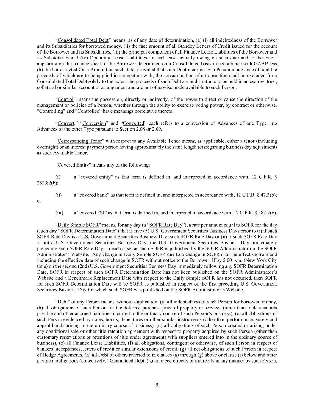 -9- “Consolidated Total Debt” means, as of any date of determination, (a) (i) all indebtedness of the Borrower and its Subsidiaries for borrowed money, (ii) the face amount of all Standby Letters of Credit issued for the account of the Borrower and its Subsidiaries, (iii) the principal component of all Finance Lease Liabilities of the Borrower and its Subsidiaries and (iv) Operating Lease Liabilities, in each case actually owing on such date and to the extent appearing on the balance sheet of the Borrower determined on a Consolidated basis in accordance with GAAP less (b) the Unrestricted Cash Amount on such date; provided that such Debt incurred by a Person in advance of, and the proceeds of which are to be applied in connection with, the consummation of a transaction shall be excluded from Consolidated Total Debt solely to the extent the proceeds of such Debt are and continue to be held in an escrow, trust, collateral or similar account or arrangement and are not otherwise made available to such Person. “Control” means the possession, directly or indirectly, of the power to direct or cause the direction of the management or policies of a Person, whether through the ability to exercise voting power, by contract or otherwise. “Controlling” and “Controlled” have meanings correlative thereto. “Convert,” “Conversion” and “Converted” each refers to a conversion of Advances of one Type into Advances of the other Type pursuant to Section 2.08 or 2.09. “Corresponding Tenor” with respect to any Available Tenor means, as applicable, either a tenor (including overnight) or an interest payment period having approximately the same length (disregarding business day adjustment) as such Available Tenor. “Covered Entity” means any of the following: (i) a “covered entity” as that term is defined in, and interpreted in accordance with, 12 C.F.R. § 252.82(b); (ii) a “covered bank” as that term is defined in, and interpreted in accordance with, 12 C.F.R. § 47.3(b); or (iii) a “covered FSI” as that term is defined in, and interpreted in accordance with, 12 C.F.R. § 382.2(b). “Daily Simple SOFR” means, for any day (a “SOFR Rate Day”), a rate per annum equal to SOFR for the day (such day “SOFR Determination Date”) that is five (5) U.S. Government Securities Business Days prior to (i) if such SOFR Rate Day is a U.S. Government Securities Business Day, such SOFR Rate Day or (ii) if such SOFR Rate Day is not a U.S. Government Securities Business Day, the U.S. Government Securities Business Day immediately preceding such SOFR Rate Day, in each case, as such SOFR is published by the SOFR Administrator on the SOFR Administrator’s Website. Any change in Daily Simple SOFR due to a change in SOFR shall be effective from and including the effective date of such change in SOFR without notice to the Borrower. If by 5:00 p.m. (New York City time) on the second (2nd) U.S. Government Securities Business Day immediately following any SOFR Determination Date, SOFR in respect of such SOFR Determination Date has not been published on the SOFR Administrator’s Website and a Benchmark Replacement Date with respect to the Daily Simple SOFR has not occurred, then SOFR for such SOFR Determination Date will be SOFR as published in respect of the first preceding U.S. Government Securities Business Day for which such SOFR was published on the SOFR Administrator’s Website. “Debt” of any Person means, without duplication, (a) all indebtedness of such Person for borrowed money, (b) all obligations of such Person for the deferred purchase price of property or services (other than trade accounts payable and other accrued liabilities incurred in the ordinary course of such Person’s business), (c) all obligations of such Person evidenced by notes, bonds, debentures or other similar instruments (other than performance, surety and appeal bonds arising in the ordinary course of business), (d) all obligations of such Person created or arising under any conditional sale or other title retention agreement with respect to property acquired by such Person (other than customary reservations or retentions of title under agreements with suppliers entered into in the ordinary course of business), (e) all Finance Lease Liabilities, (f) all obligations, contingent or otherwise, of such Person in respect of bankers’ acceptances, letters of credit or similar extensions of credit, (g) all net obligations of such Person in respect of Hedge Agreements, (h) all Debt of others referred to in clauses (a) through (g) above or clause (i) below and other payment obligations (collectively, “Guaranteed Debt”) guaranteed directly or indirectly in any manner by such Person,