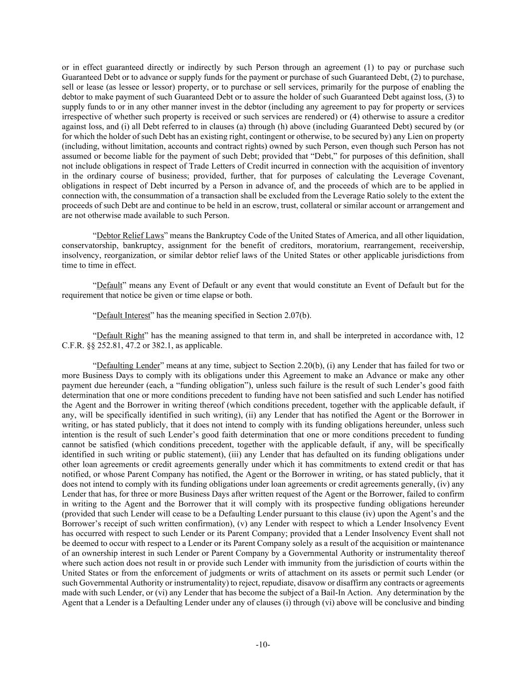 -10- or in effect guaranteed directly or indirectly by such Person through an agreement (1) to pay or purchase such Guaranteed Debt or to advance or supply funds for the payment or purchase of such Guaranteed Debt, (2) to purchase, sell or lease (as lessee or lessor) property, or to purchase or sell services, primarily for the purpose of enabling the debtor to make payment of such Guaranteed Debt or to assure the holder of such Guaranteed Debt against loss, (3) to supply funds to or in any other manner invest in the debtor (including any agreement to pay for property or services irrespective of whether such property is received or such services are rendered) or (4) otherwise to assure a creditor against loss, and (i) all Debt referred to in clauses (a) through (h) above (including Guaranteed Debt) secured by (or for which the holder of such Debt has an existing right, contingent or otherwise, to be secured by) any Lien on property (including, without limitation, accounts and contract rights) owned by such Person, even though such Person has not assumed or become liable for the payment of such Debt; provided that “Debt,” for purposes of this definition, shall not include obligations in respect of Trade Letters of Credit incurred in connection with the acquisition of inventory in the ordinary course of business; provided, further, that for purposes of calculating the Leverage Covenant, obligations in respect of Debt incurred by a Person in advance of, and the proceeds of which are to be applied in connection with, the consummation of a transaction shall be excluded from the Leverage Ratio solely to the extent the proceeds of such Debt are and continue to be held in an escrow, trust, collateral or similar account or arrangement and are not otherwise made available to such Person. “Debtor Relief Laws” means the Bankruptcy Code of the United States of America, and all other liquidation, conservatorship, bankruptcy, assignment for the benefit of creditors, moratorium, rearrangement, receivership, insolvency, reorganization, or similar debtor relief laws of the United States or other applicable jurisdictions from time to time in effect. “Default” means any Event of Default or any event that would constitute an Event of Default but for the requirement that notice be given or time elapse or both. “Default Interest” has the meaning specified in Section 2.07(b). “Default Right” has the meaning assigned to that term in, and shall be interpreted in accordance with, 12 C.F.R. §§ 252.81, 47.2 or 382.1, as applicable. “Defaulting Lender” means at any time, subject to Section 2.20(b), (i) any Lender that has failed for two or more Business Days to comply with its obligations under this Agreement to make an Advance or make any other payment due hereunder (each, a “funding obligation”), unless such failure is the result of such Lender’s good faith determination that one or more conditions precedent to funding have not been satisfied and such Lender has notified the Agent and the Borrower in writing thereof (which conditions precedent, together with the applicable default, if any, will be specifically identified in such writing), (ii) any Lender that has notified the Agent or the Borrower in writing, or has stated publicly, that it does not intend to comply with its funding obligations hereunder, unless such intention is the result of such Lender’s good faith determination that one or more conditions precedent to funding cannot be satisfied (which conditions precedent, together with the applicable default, if any, will be specifically identified in such writing or public statement), (iii) any Lender that has defaulted on its funding obligations under other loan agreements or credit agreements generally under which it has commitments to extend credit or that has notified, or whose Parent Company has notified, the Agent or the Borrower in writing, or has stated publicly, that it does not intend to comply with its funding obligations under loan agreements or credit agreements generally, (iv) any Lender that has, for three or more Business Days after written request of the Agent or the Borrower, failed to confirm in writing to the Agent and the Borrower that it will comply with its prospective funding obligations hereunder (provided that such Lender will cease to be a Defaulting Lender pursuant to this clause (iv) upon the Agent’s and the Borrower’s receipt of such written confirmation), (v) any Lender with respect to which a Lender Insolvency Event has occurred with respect to such Lender or its Parent Company; provided that a Lender Insolvency Event shall not be deemed to occur with respect to a Lender or its Parent Company solely as a result of the acquisition or maintenance of an ownership interest in such Lender or Parent Company by a Governmental Authority or instrumentality thereof where such action does not result in or provide such Lender with immunity from the jurisdiction of courts within the United States or from the enforcement of judgments or writs of attachment on its assets or permit such Lender (or such Governmental Authority or instrumentality) to reject, repudiate, disavow or disaffirm any contracts or agreements made with such Lender, or (vi) any Lender that has become the subject of a Bail-In Action. Any determination by the Agent that a Lender is a Defaulting Lender under any of clauses (i) through (vi) above will be conclusive and binding