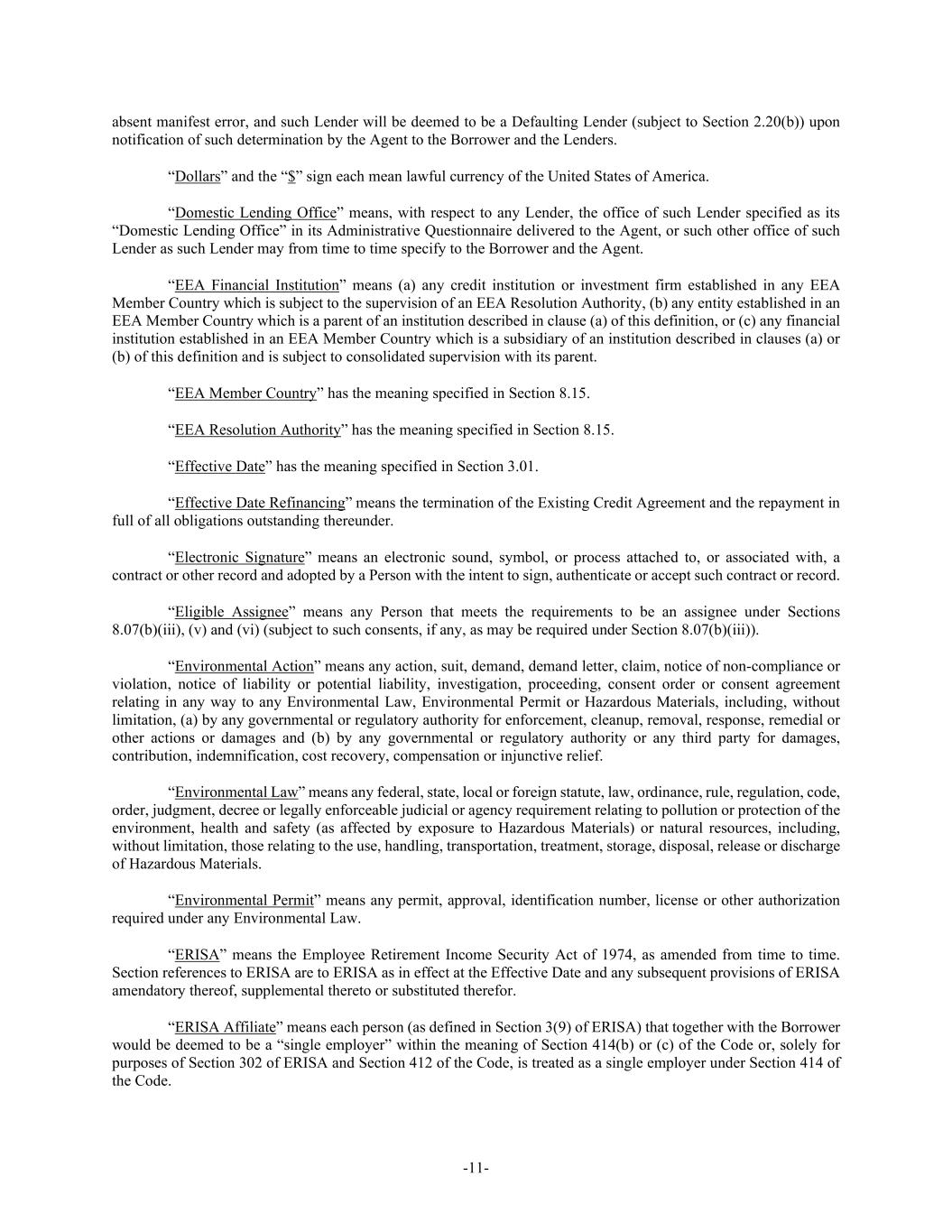 -11- absent manifest error, and such Lender will be deemed to be a Defaulting Lender (subject to Section 2.20(b)) upon notification of such determination by the Agent to the Borrower and the Lenders. “Dollars” and the “$” sign each mean lawful currency of the United States of America. “Domestic Lending Office” means, with respect to any Lender, the office of such Lender specified as its “Domestic Lending Office” in its Administrative Questionnaire delivered to the Agent, or such other office of such Lender as such Lender may from time to time specify to the Borrower and the Agent. “EEA Financial Institution” means (a) any credit institution or investment firm established in any EEA Member Country which is subject to the supervision of an EEA Resolution Authority, (b) any entity established in an EEA Member Country which is a parent of an institution described in clause (a) of this definition, or (c) any financial institution established in an EEA Member Country which is a subsidiary of an institution described in clauses (a) or (b) of this definition and is subject to consolidated supervision with its parent. “EEA Member Country” has the meaning specified in Section 8.15. “EEA Resolution Authority” has the meaning specified in Section 8.15. “Effective Date” has the meaning specified in Section 3.01. “Effective Date Refinancing” means the termination of the Existing Credit Agreement and the repayment in full of all obligations outstanding thereunder. “Electronic Signature” means an electronic sound, symbol, or process attached to, or associated with, a contract or other record and adopted by a Person with the intent to sign, authenticate or accept such contract or record. “Eligible Assignee” means any Person that meets the requirements to be an assignee under Sections 8.07(b)(iii), (v) and (vi) (subject to such consents, if any, as may be required under Section 8.07(b)(iii)). “Environmental Action” means any action, suit, demand, demand letter, claim, notice of non-compliance or violation, notice of liability or potential liability, investigation, proceeding, consent order or consent agreement relating in any way to any Environmental Law, Environmental Permit or Hazardous Materials, including, without limitation, (a) by any governmental or regulatory authority for enforcement, cleanup, removal, response, remedial or other actions or damages and (b) by any governmental or regulatory authority or any third party for damages, contribution, indemnification, cost recovery, compensation or injunctive relief. “Environmental Law” means any federal, state, local or foreign statute, law, ordinance, rule, regulation, code, order, judgment, decree or legally enforceable judicial or agency requirement relating to pollution or protection of the environment, health and safety (as affected by exposure to Hazardous Materials) or natural resources, including, without limitation, those relating to the use, handling, transportation, treatment, storage, disposal, release or discharge of Hazardous Materials. “Environmental Permit” means any permit, approval, identification number, license or other authorization required under any Environmental Law. “ERISA” means the Employee Retirement Income Security Act of 1974, as amended from time to time. Section references to ERISA are to ERISA as in effect at the Effective Date and any subsequent provisions of ERISA amendatory thereof, supplemental thereto or substituted therefor. “ERISA Affiliate” means each person (as defined in Section 3(9) of ERISA) that together with the Borrower would be deemed to be a “single employer” within the meaning of Section 414(b) or (c) of the Code or, solely for purposes of Section 302 of ERISA and Section 412 of the Code, is treated as a single employer under Section 414 of the Code.