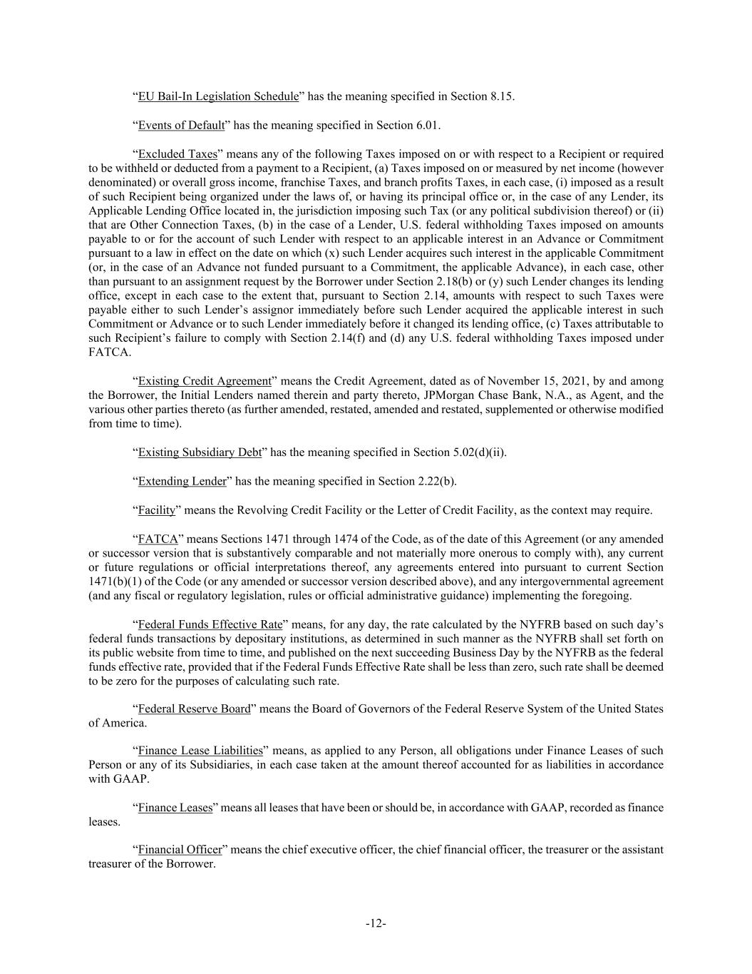 -12- “EU Bail-In Legislation Schedule” has the meaning specified in Section 8.15. “Events of Default” has the meaning specified in Section 6.01. “Excluded Taxes” means any of the following Taxes imposed on or with respect to a Recipient or required to be withheld or deducted from a payment to a Recipient, (a) Taxes imposed on or measured by net income (however denominated) or overall gross income, franchise Taxes, and branch profits Taxes, in each case, (i) imposed as a result of such Recipient being organized under the laws of, or having its principal office or, in the case of any Lender, its Applicable Lending Office located in, the jurisdiction imposing such Tax (or any political subdivision thereof) or (ii) that are Other Connection Taxes, (b) in the case of a Lender, U.S. federal withholding Taxes imposed on amounts payable to or for the account of such Lender with respect to an applicable interest in an Advance or Commitment pursuant to a law in effect on the date on which (x) such Lender acquires such interest in the applicable Commitment (or, in the case of an Advance not funded pursuant to a Commitment, the applicable Advance), in each case, other than pursuant to an assignment request by the Borrower under Section 2.18(b) or (y) such Lender changes its lending office, except in each case to the extent that, pursuant to Section 2.14, amounts with respect to such Taxes were payable either to such Lender’s assignor immediately before such Lender acquired the applicable interest in such Commitment or Advance or to such Lender immediately before it changed its lending office, (c) Taxes attributable to such Recipient’s failure to comply with Section 2.14(f) and (d) any U.S. federal withholding Taxes imposed under FATCA. “Existing Credit Agreement” means the Credit Agreement, dated as of November 15, 2021, by and among the Borrower, the Initial Lenders named therein and party thereto, JPMorgan Chase Bank, N.A., as Agent, and the various other parties thereto (as further amended, restated, amended and restated, supplemented or otherwise modified from time to time). “Existing Subsidiary Debt” has the meaning specified in Section 5.02(d)(ii). “Extending Lender” has the meaning specified in Section 2.22(b). “Facility” means the Revolving Credit Facility or the Letter of Credit Facility, as the context may require. “FATCA” means Sections 1471 through 1474 of the Code, as of the date of this Agreement (or any amended or successor version that is substantively comparable and not materially more onerous to comply with), any current or future regulations or official interpretations thereof, any agreements entered into pursuant to current Section 1471(b)(1) of the Code (or any amended or successor version described above), and any intergovernmental agreement (and any fiscal or regulatory legislation, rules or official administrative guidance) implementing the foregoing. “Federal Funds Effective Rate” means, for any day, the rate calculated by the NYFRB based on such day’s federal funds transactions by depositary institutions, as determined in such manner as the NYFRB shall set forth on its public website from time to time, and published on the next succeeding Business Day by the NYFRB as the federal funds effective rate, provided that if the Federal Funds Effective Rate shall be less than zero, such rate shall be deemed to be zero for the purposes of calculating such rate. “Federal Reserve Board” means the Board of Governors of the Federal Reserve System of the United States of America. “Finance Lease Liabilities” means, as applied to any Person, all obligations under Finance Leases of such Person or any of its Subsidiaries, in each case taken at the amount thereof accounted for as liabilities in accordance with GAAP. “Finance Leases” means all leases that have been or should be, in accordance with GAAP, recorded as finance leases. “Financial Officer” means the chief executive officer, the chief financial officer, the treasurer or the assistant treasurer of the Borrower.