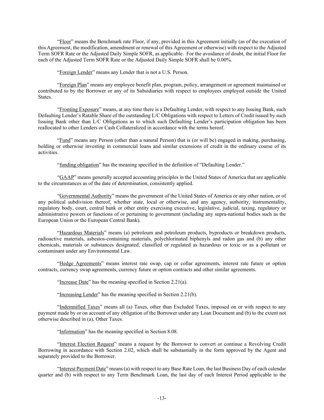 -13- “Floor” means the Benchmark rate Floor, if any, provided in this Agreement initially (as of the execution of this Agreement, the modification, amendment or renewal of this Agreement or otherwise) with respect to the Adjusted Term SOFR Rate or the Adjusted Daily Simple SOFR, as applicable. For the avoidance of doubt, the initial Floor for each of the Adjusted Term SOFR Rate or the Adjusted Daily Simple SOFR shall be 0.00%. “Foreign Lender” means any Lender that is not a U.S. Person. “Foreign Plan” means any employee benefit plan, program, policy, arrangement or agreement maintained or contributed to by the Borrower or any of its Subsidiaries with respect to employees employed outside the United States. “Fronting Exposure” means, at any time there is a Defaulting Lender, with respect to any Issuing Bank, such Defaulting Lender’s Ratable Share of the outstanding L/C Obligations with respect to Letters of Credit issued by such Issuing Bank other than L/C Obligations as to which such Defaulting Lender’s participation obligation has been reallocated to other Lenders or Cash Collateralized in accordance with the terms hereof. “Fund” means any Person (other than a natural Person) that is (or will be) engaged in making, purchasing, holding or otherwise investing in commercial loans and similar extensions of credit in the ordinary course of its activities. “funding obligation” has the meaning specified in the definition of “Defaulting Lender.” “GAAP” means generally accepted accounting principles in the United States of America that are applicable to the circumstances as of the date of determination, consistently applied. “Governmental Authority” means the government of the United States of America or any other nation, or of any political subdivision thereof, whether state, local or otherwise, and any agency, authority, instrumentality, regulatory body, court, central bank or other entity exercising executive, legislative, judicial, taxing, regulatory or administrative powers or functions of or pertaining to government (including any supra-national bodies such as the European Union or the European Central Bank). “Hazardous Materials” means (a) petroleum and petroleum products, byproducts or breakdown products, radioactive materials, asbestos-containing materials, polychlorinated biphenyls and radon gas and (b) any other chemicals, materials or substances designated, classified or regulated as hazardous or toxic or as a pollutant or contaminant under any Environmental Law. “Hedge Agreements” means interest rate swap, cap or collar agreements, interest rate future or option contracts, currency swap agreements, currency future or option contracts and other similar agreements. “Increase Date” has the meaning specified in Section 2.21(a). “Increasing Lender” has the meaning specified in Section 2.21(b). “Indemnified Taxes” means all (a) Taxes, other than Excluded Taxes, imposed on or with respect to any payment made by or on account of any obligation of the Borrower under any Loan Document and (b) to the extent not otherwise described in (a), Other Taxes. “Information” has the meaning specified in Section 8.08. “Interest Election Request” means a request by the Borrower to convert or continue a Revolving Credit Borrowing in accordance with Section 2.02, which shall be substantially in the form approved by the Agent and separately provided to the Borrower. “Interest Payment Date” means (a) with respect to any Base Rate Loan, the last Business Day of each calendar quarter and (b) with respect to any Term Benchmark Loan, the last day of each Interest Period applicable to the