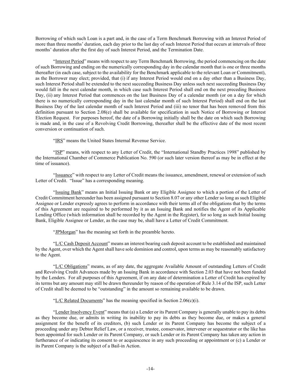 -14- Borrowing of which such Loan is a part and, in the case of a Term Benchmark Borrowing with an Interest Period of more than three months’ duration, each day prior to the last day of such Interest Period that occurs at intervals of three months’ duration after the first day of such Interest Period, and the Termination Date. “Interest Period” means with respect to any Term Benchmark Borrowing, the period commencing on the date of such Borrowing and ending on the numerically corresponding day in the calendar month that is one or three months thereafter (in each case, subject to the availability for the Benchmark applicable to the relevant Loan or Commitment), as the Borrower may elect; provided, that (i) if any Interest Period would end on a day other than a Business Day, such Interest Period shall be extended to the next succeeding Business Day unless such next succeeding Business Day would fall in the next calendar month, in which case such Interest Period shall end on the next preceding Business Day, (ii) any Interest Period that commences on the last Business Day of a calendar month (or on a day for which there is no numerically corresponding day in the last calendar month of such Interest Period) shall end on the last Business Day of the last calendar month of such Interest Period and (iii) no tenor that has been removed from this definition pursuant to Section 2.08(e) shall be available for specification in such Notice of Borrowing or Interest Election Request. For purposes hereof, the date of a Borrowing initially shall be the date on which such Borrowing is made and, in the case of a Revolving Credit Borrowing, thereafter shall be the effective date of the most recent conversion or continuation of such. “IRS” means the United States Internal Revenue Service. “ISP” means, with respect to any Letter of Credit, the “International Standby Practices 1998” published by the International Chamber of Commerce Publication No. 590 (or such later version thereof as may be in effect at the time of issuance). “Issuance” with respect to any Letter of Credit means the issuance, amendment, renewal or extension of such Letter of Credit. “Issue” has a corresponding meaning. “Issuing Bank” means an Initial Issuing Bank or any Eligible Assignee to which a portion of the Letter of Credit Commitment hereunder has been assigned pursuant to Section 8.07 or any other Lender so long as such Eligible Assignee or Lender expressly agrees to perform in accordance with their terms all of the obligations that by the terms of this Agreement are required to be performed by it as an Issuing Bank and notifies the Agent of its Applicable Lending Office (which information shall be recorded by the Agent in the Register), for so long as such Initial Issuing Bank, Eligible Assignee or Lender, as the case may be, shall have a Letter of Credit Commitment. “JPMorgan” has the meaning set forth in the preamble hereto. “L/C Cash Deposit Account” means an interest bearing cash deposit account to be established and maintained by the Agent, over which the Agent shall have sole dominion and control, upon terms as may be reasonably satisfactory to the Agent. “L/C Obligations” means, as of any date, the aggregate Available Amount of outstanding Letters of Credit and Revolving Credit Advances made by an Issuing Bank in accordance with Section 2.03 that have not been funded by the Lenders. For all purposes of this Agreement, if on any date of determination a Letter of Credit has expired by its terms but any amount may still be drawn thereunder by reason of the operation of Rule 3.14 of the ISP, such Letter of Credit shall be deemed to be “outstanding” in the amount so remaining available to be drawn. “L/C Related Documents” has the meaning specified in Section 2.06(c)(i). “Lender Insolvency Event” means that (a) a Lender or its Parent Company is generally unable to pay its debts as they become due, or admits in writing its inability to pay its debts as they become due, or makes a general assignment for the benefit of its creditors, (b) such Lender or its Parent Company has become the subject of a proceeding under any Debtor Relief Law, or a receiver, trustee, conservator, intervener or sequestrator or the like has been appointed for such Lender or its Parent Company, or such Lender or its Parent Company has taken any action in furtherance of or indicating its consent to or acquiescence in any such proceeding or appointment or (c) a Lender or its Parent Company is the subject of a Bail-in Action.