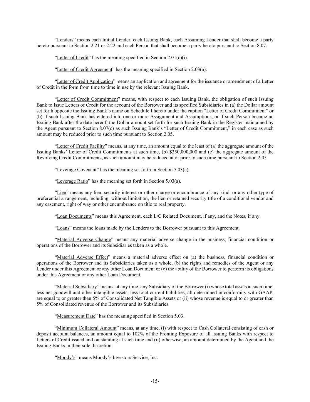 -15- “Lenders” means each Initial Lender, each Issuing Bank, each Assuming Lender that shall become a party hereto pursuant to Section 2.21 or 2.22 and each Person that shall become a party hereto pursuant to Section 8.07. “Letter of Credit” has the meaning specified in Section 2.01(c)(i). “Letter of Credit Agreement” has the meaning specified in Section 2.03(a). “Letter of Credit Application” means an application and agreement for the issuance or amendment of a Letter of Credit in the form from time to time in use by the relevant Issuing Bank. “Letter of Credit Commitment” means, with respect to each Issuing Bank, the obligation of such Issuing Bank to Issue Letters of Credit for the account of the Borrower and its specified Subsidiaries in (a) the Dollar amount set forth opposite the Issuing Bank’s name on Schedule I hereto under the caption “Letter of Credit Commitment” or (b) if such Issuing Bank has entered into one or more Assignment and Assumptions, or if such Person became an Issuing Bank after the date hereof, the Dollar amount set forth for such Issuing Bank in the Register maintained by the Agent pursuant to Section 8.07(c) as such Issuing Bank’s “Letter of Credit Commitment,” in each case as such amount may be reduced prior to such time pursuant to Section 2.05. “Letter of Credit Facility” means, at any time, an amount equal to the least of (a) the aggregate amount of the Issuing Banks’ Letter of Credit Commitments at such time, (b) $350,000,000 and (c) the aggregate amount of the Revolving Credit Commitments, as such amount may be reduced at or prior to such time pursuant to Section 2.05. “Leverage Covenant” has the meaning set forth in Section 5.03(a). “Leverage Ratio” has the meaning set forth in Section 5.03(a). “Lien” means any lien, security interest or other charge or encumbrance of any kind, or any other type of preferential arrangement, including, without limitation, the lien or retained security title of a conditional vendor and any easement, right of way or other encumbrance on title to real property. “Loan Documents” means this Agreement, each L/C Related Document, if any, and the Notes, if any. “Loans” means the loans made by the Lenders to the Borrower pursuant to this Agreement. “Material Adverse Change” means any material adverse change in the business, financial condition or operations of the Borrower and its Subsidiaries taken as a whole. “Material Adverse Effect” means a material adverse effect on (a) the business, financial condition or operations of the Borrower and its Subsidiaries taken as a whole, (b) the rights and remedies of the Agent or any Lender under this Agreement or any other Loan Document or (c) the ability of the Borrower to perform its obligations under this Agreement or any other Loan Document. “Material Subsidiary” means, at any time, any Subsidiary of the Borrower (i) whose total assets at such time, less net goodwill and other intangible assets, less total current liabilities, all determined in conformity with GAAP, are equal to or greater than 5% of Consolidated Net Tangible Assets or (ii) whose revenue is equal to or greater than 5% of Consolidated revenue of the Borrower and its Subsidiaries. “Measurement Date” has the meaning specified in Section 5.03. “Minimum Collateral Amount” means, at any time, (i) with respect to Cash Collateral consisting of cash or deposit account balances, an amount equal to 102% of the Fronting Exposure of all Issuing Banks with respect to Letters of Credit issued and outstanding at such time and (ii) otherwise, an amount determined by the Agent and the Issuing Banks in their sole discretion. “Moody’s” means Moody’s Investors Service, Inc.