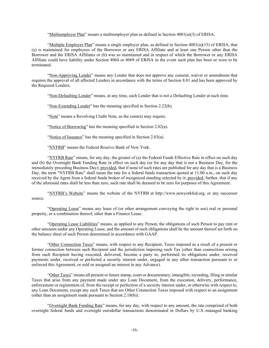 -16- “Multiemployer Plan” means a multiemployer plan as defined in Section 4001(a)(3) of ERISA. “Multiple Employer Plan” means a single employer plan, as defined in Section 4001(a)(15) of ERISA, that (a) is maintained for employees of the Borrower or any ERISA Affiliate and at least one Person other than the Borrower and the ERISA Affiliates or (b) was so maintained and in respect of which the Borrower or any ERISA Affiliate could have liability under Section 4064 or 4069 of ERISA in the event such plan has been or were to be terminated. “Non-Approving Lender” means any Lender that does not approve any consent, waiver or amendment that requires the approval of all affected Lenders in accordance with the terms of Section 8.01 and has been approved by the Required Lenders. “Non-Defaulting Lender” means, at any time, each Lender that is not a Defaulting Lender at such time. “Non-Extending Lender” has the meaning specified in Section 2.22(b). “Note” means a Revolving Credit Note, as the context may require. “Notice of Borrowing” has the meaning specified in Section 2.02(a). “Notice of Issuance” has the meaning specified in Section 2.03(a). “NYFRB” means the Federal Reserve Bank of New York. “NYFRB Rate” means, for any day, the greater of (a) the Federal Funds Effective Rate in effect on such day and (b) the Overnight Bank Funding Rate in effect on such day (or for any day that is not a Business Day, for the immediately preceding Business Day); provided, that if none of such rates are published for any day that is a Business Day, the term “NYFRB Rate” shall mean the rate for a federal funds transaction quoted at 11:00 a.m., on such day received by the Agent from a federal funds broker of recognized standing selected by it; provided, further, that if any of the aforesaid rates shall be less than zero, such rate shall be deemed to be zero for purposes of this Agreement. “NYFRB’s Website” means the website of the NYFRB at http://www.newyorkfed.org, or any successor source. “Operating Lease” means any lease of (or other arrangement conveying the right to use) real or personal property, or a combination thereof, other than a Finance Lease. “Operating Lease Liabilities” means, as applied to any Person, the obligations of such Person to pay rent or other amounts under any Operating Lease, and the amount of such obligations shall be the amount thereof set forth on the balance sheet of such Person determined in accordance with GAAP. “Other Connection Taxes” means, with respect to any Recipient, Taxes imposed as a result of a present or former connection between such Recipient and the jurisdiction imposing such Tax (other than connections arising from such Recipient having executed, delivered, become a party to, performed its obligations under, received payments under, received or perfected a security interest under, engaged in any other transaction pursuant to or enforced this Agreement, or sold or assigned an interest in any Advance). “Other Taxes” means all present or future stamp, court or documentary, intangible, recording, filing or similar Taxes that arise from any payment made under any Loan Document, from the execution, delivery, performance, enforcement or registration of, from the receipt or perfection of a security interest under, or otherwise with respect to, any Loan Document, except any such Taxes that are Other Connection Taxes imposed with respect to an assignment (other than an assignment made pursuant to Section 2.18(b)). “Overnight Bank Funding Rate” means, for any day, with respect to any amount, the rate comprised of both overnight federal funds and overnight eurodollar transactions denominated in Dollars by U.S.-managed banking